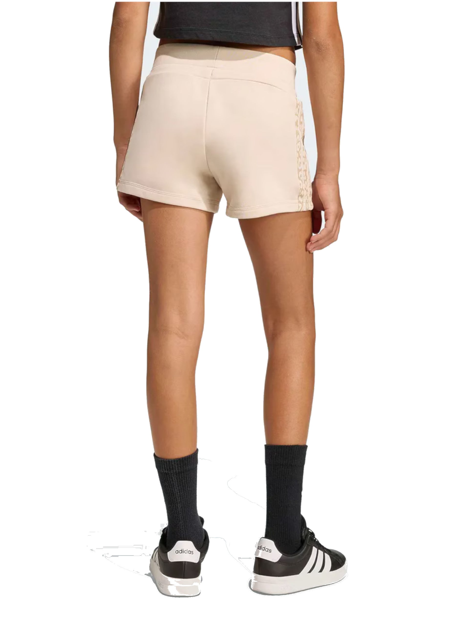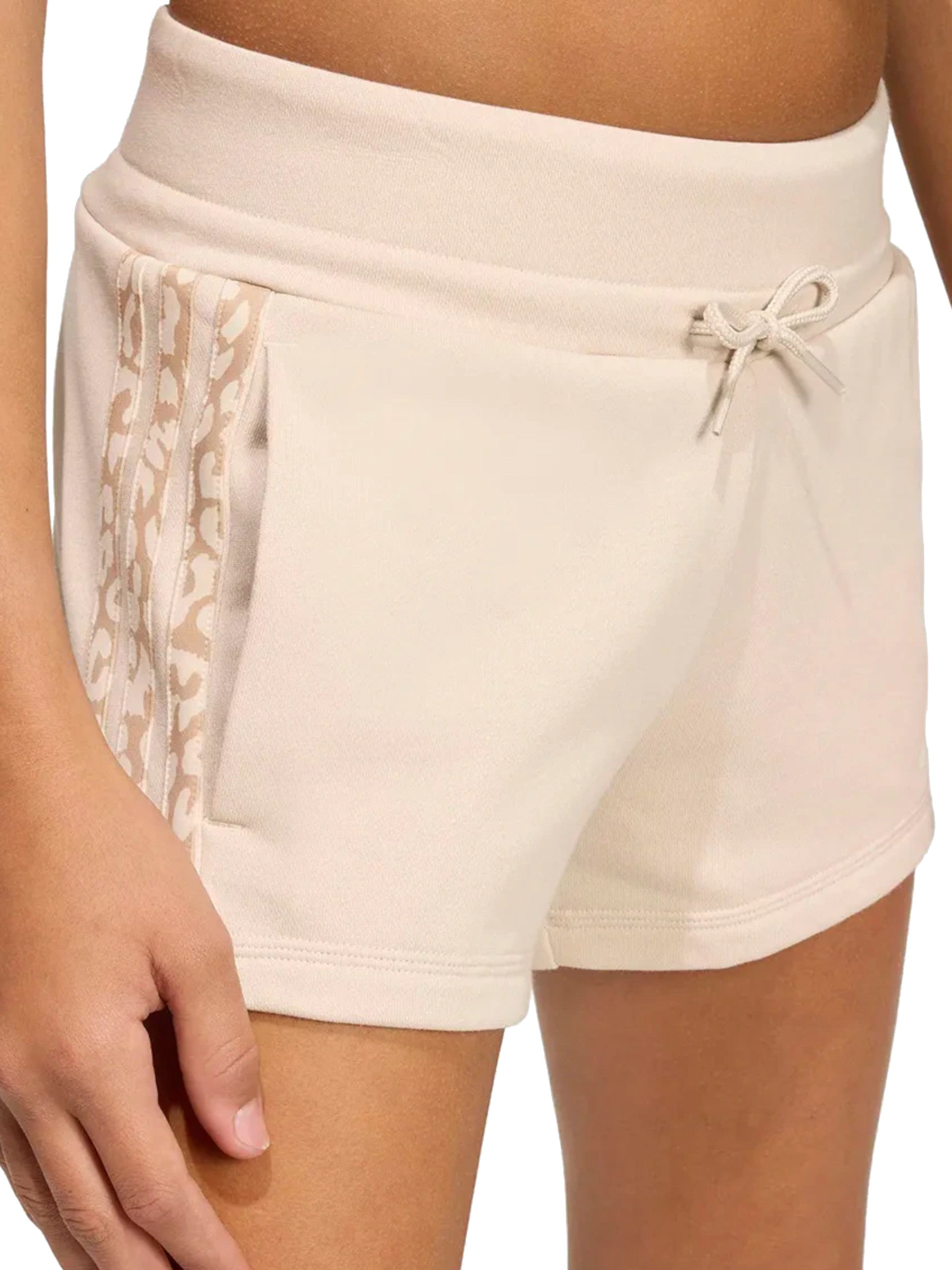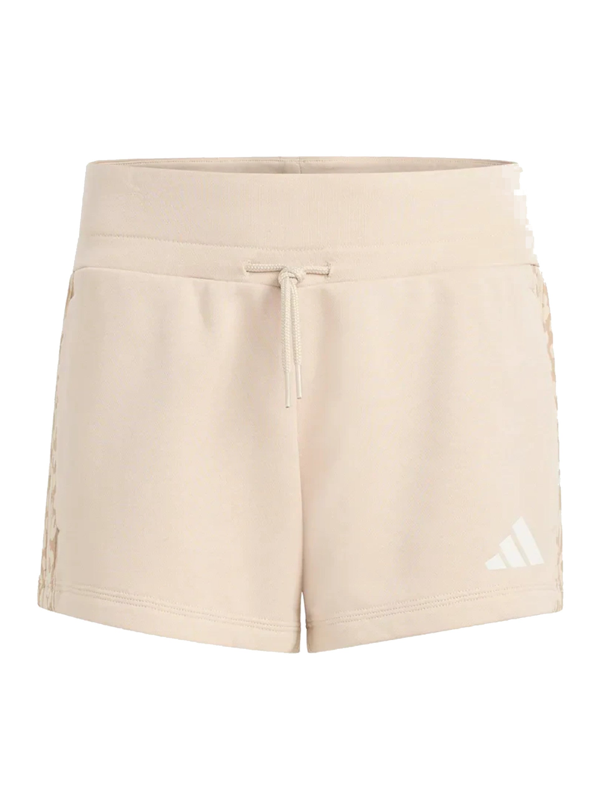 Pantaloncini Adidas beige da bambina logo Adidas bianco, realizzati in cotone. Questi pantaloncini Adidas beige hanno la banda elastica sul punto vita regolabile con laccetti, due tasche laterali aperte, la fantasia leopardati ai lati e il logo Adidas bianco applicato sul lato sinistro