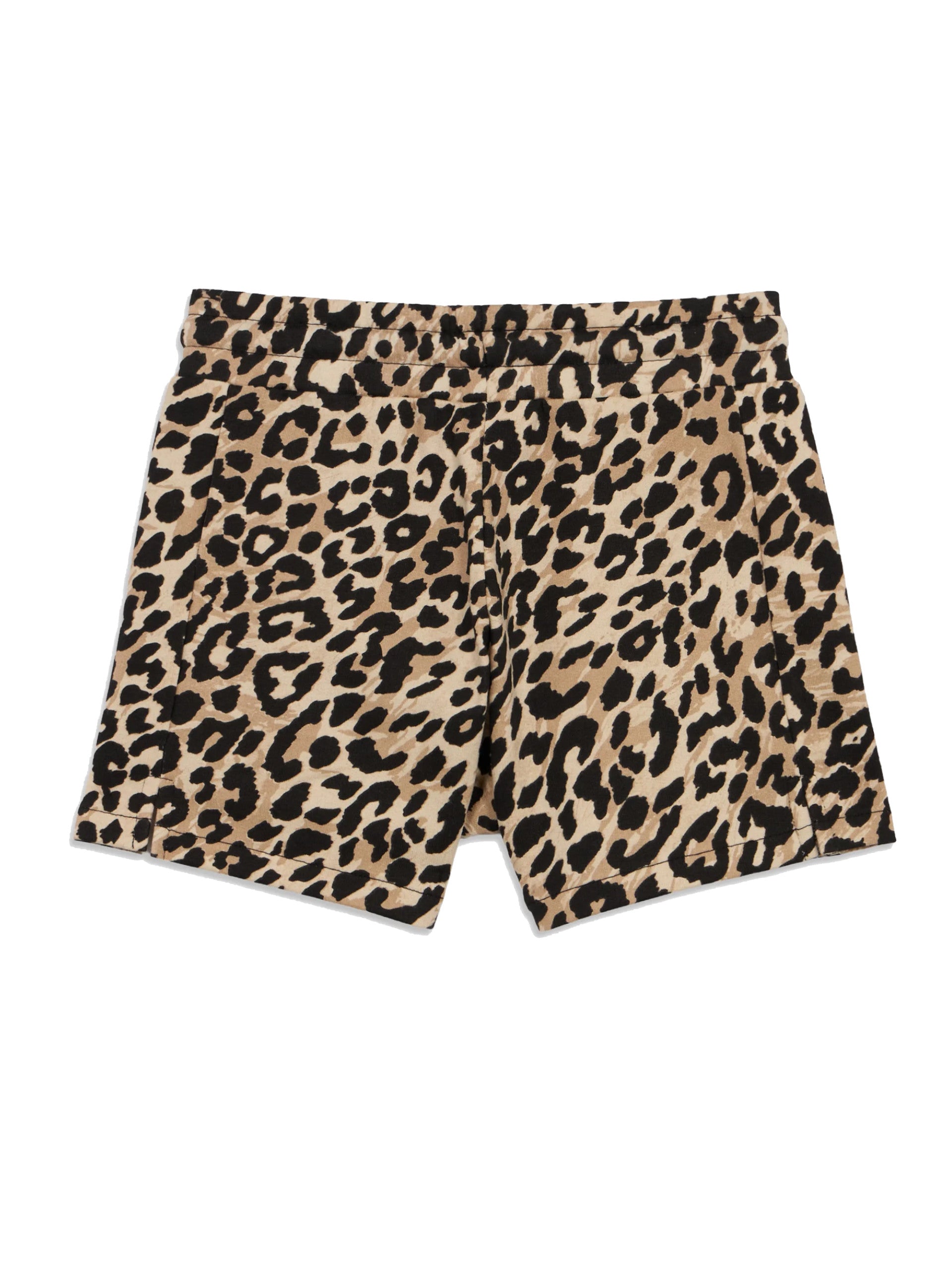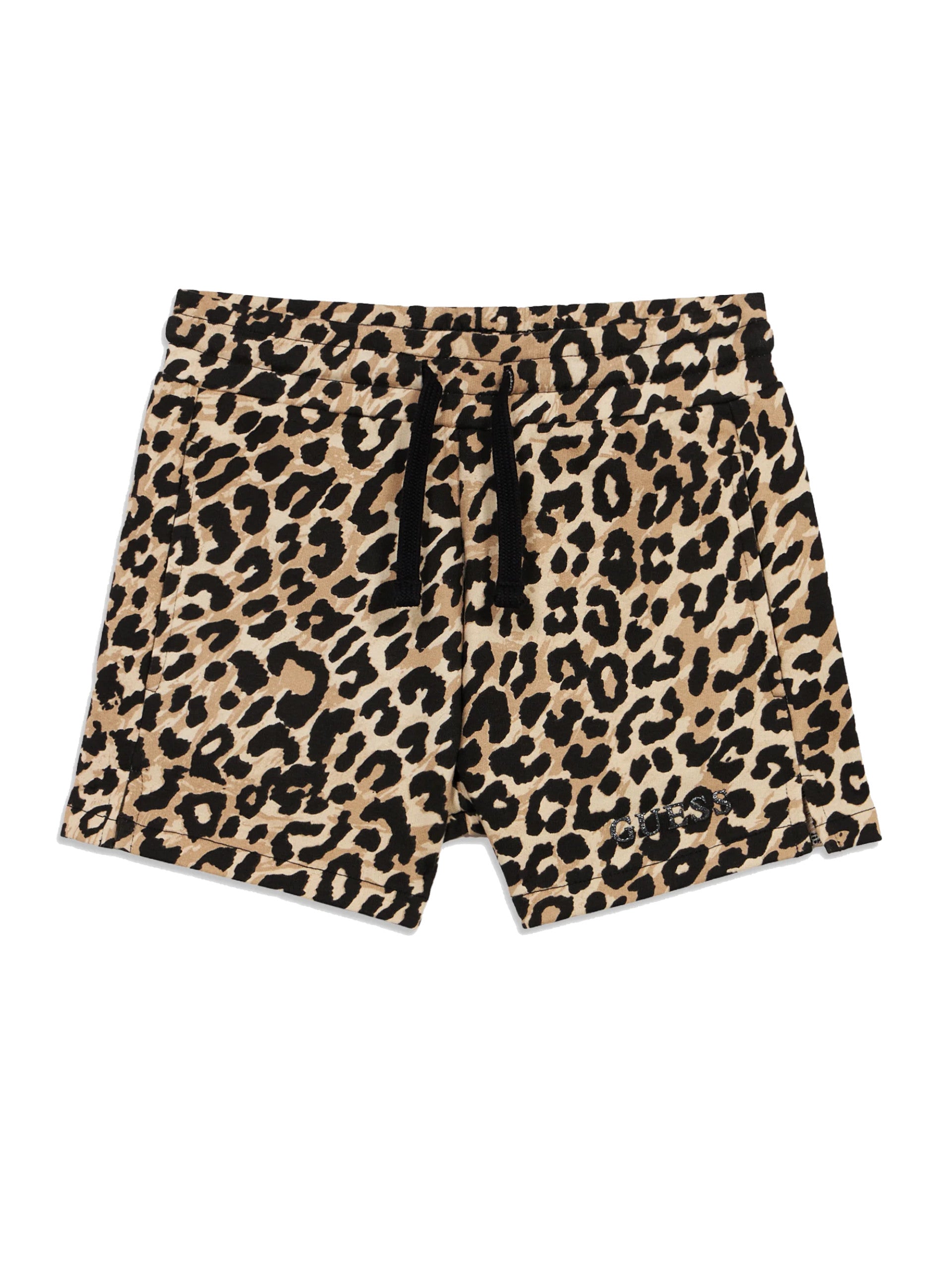 Shorts Guess bambina leopardati. Questi shorts da bambina, realizzati 100% in puro cotone, perfetti per la stagione estiva, hanno la banda elastica sul punto vita regolabile con lacci, due tasche laterali aperte, la scritta Guess glitterata in basso a sinistra e hanno la fantasia animalier