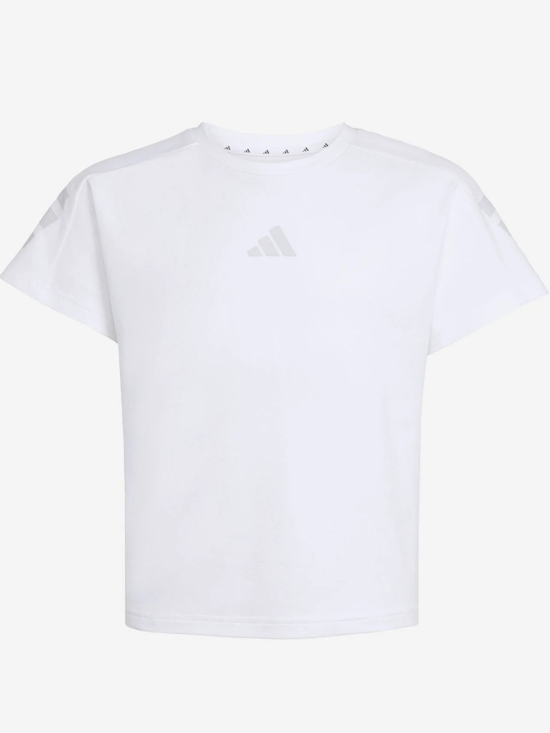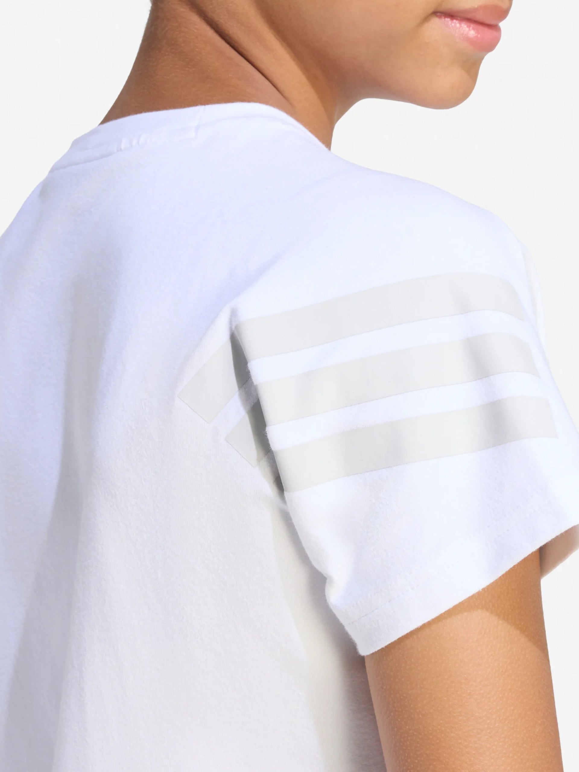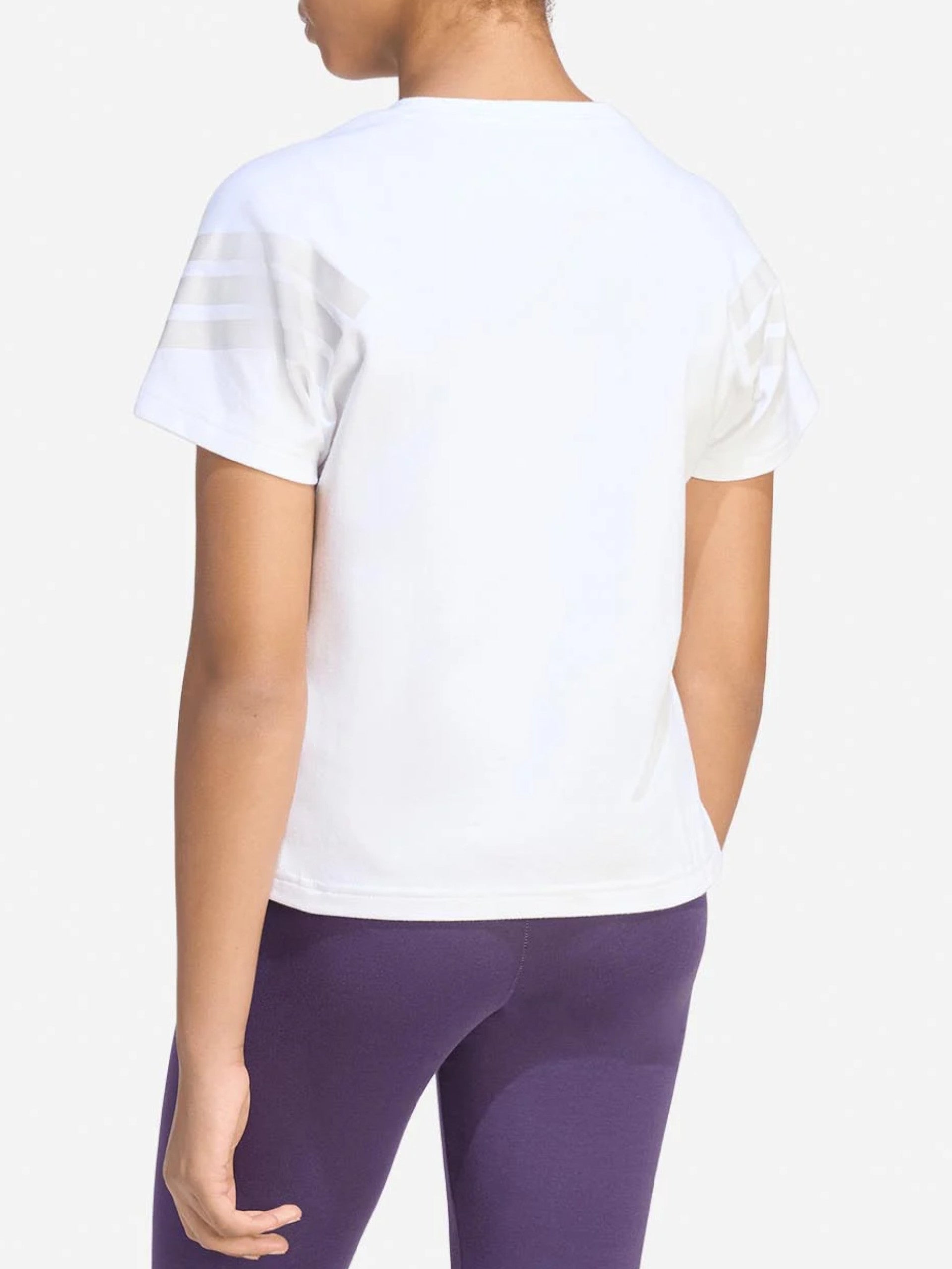 T-shirt bianca Adidas da bambina. Questa T-shirt bianca, realizzata in cotone, è caratterizzata dal girocollo, maniche corte con 3stripes e il logo del brand applicato sul davanti