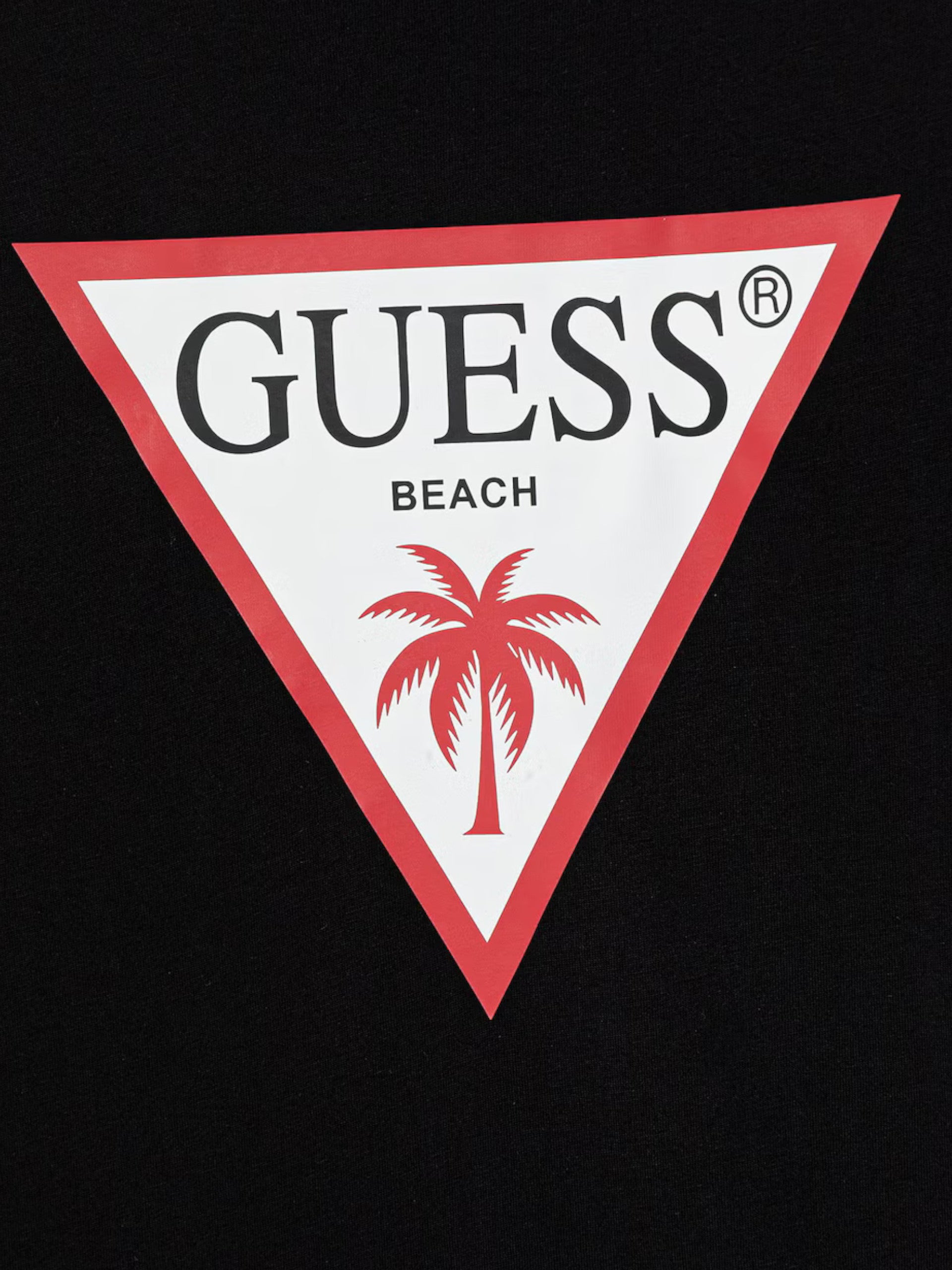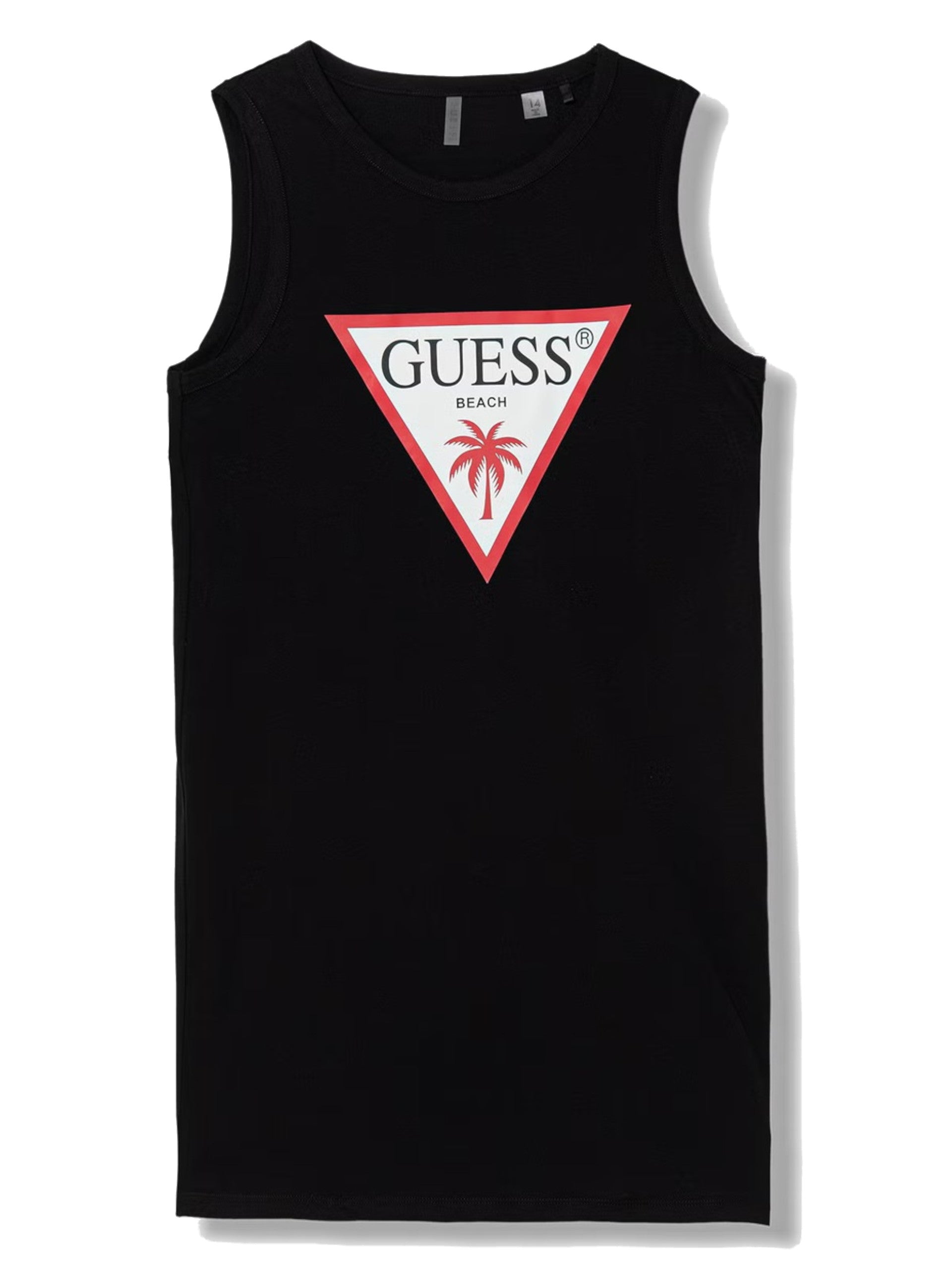 Abito a canotta nero da bambina Guess. Questo abito nero, realizzato in cotone, perfetto per la stagione estiva, è caratterizzato dallo scollo a giro, spalline grandi, l'iconico logo triangolo Guess applicato sul davanti e fondo regolare