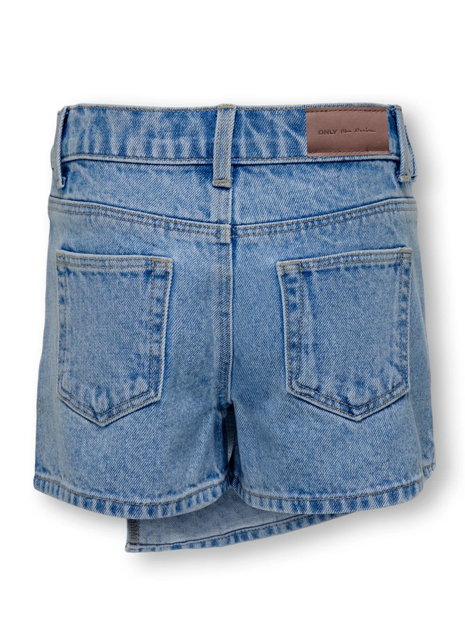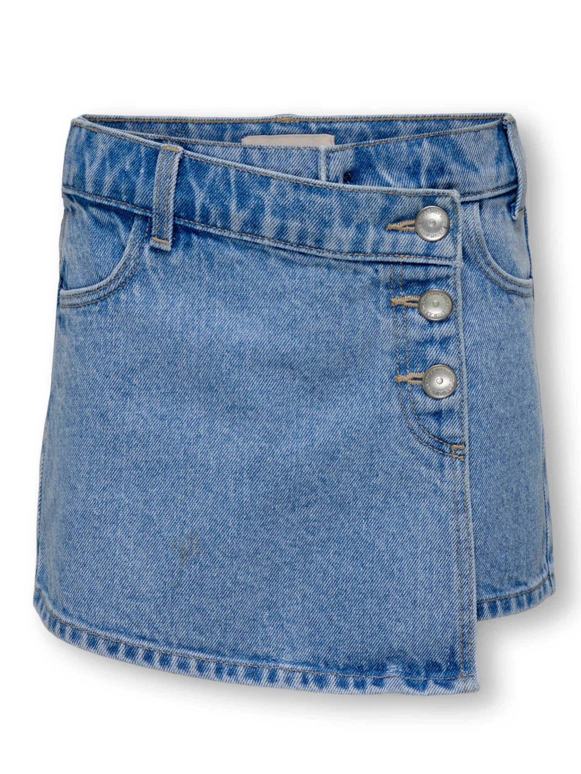 Gonna jeans Only blu da bambina 15295800, realizzata in 100% puro cotone. Questa gonna Only blu ha la chiusura con bottoni automatici, due tasche laterali aperte, due tasche posteriori a filo e il punto vita elasticizzato.
