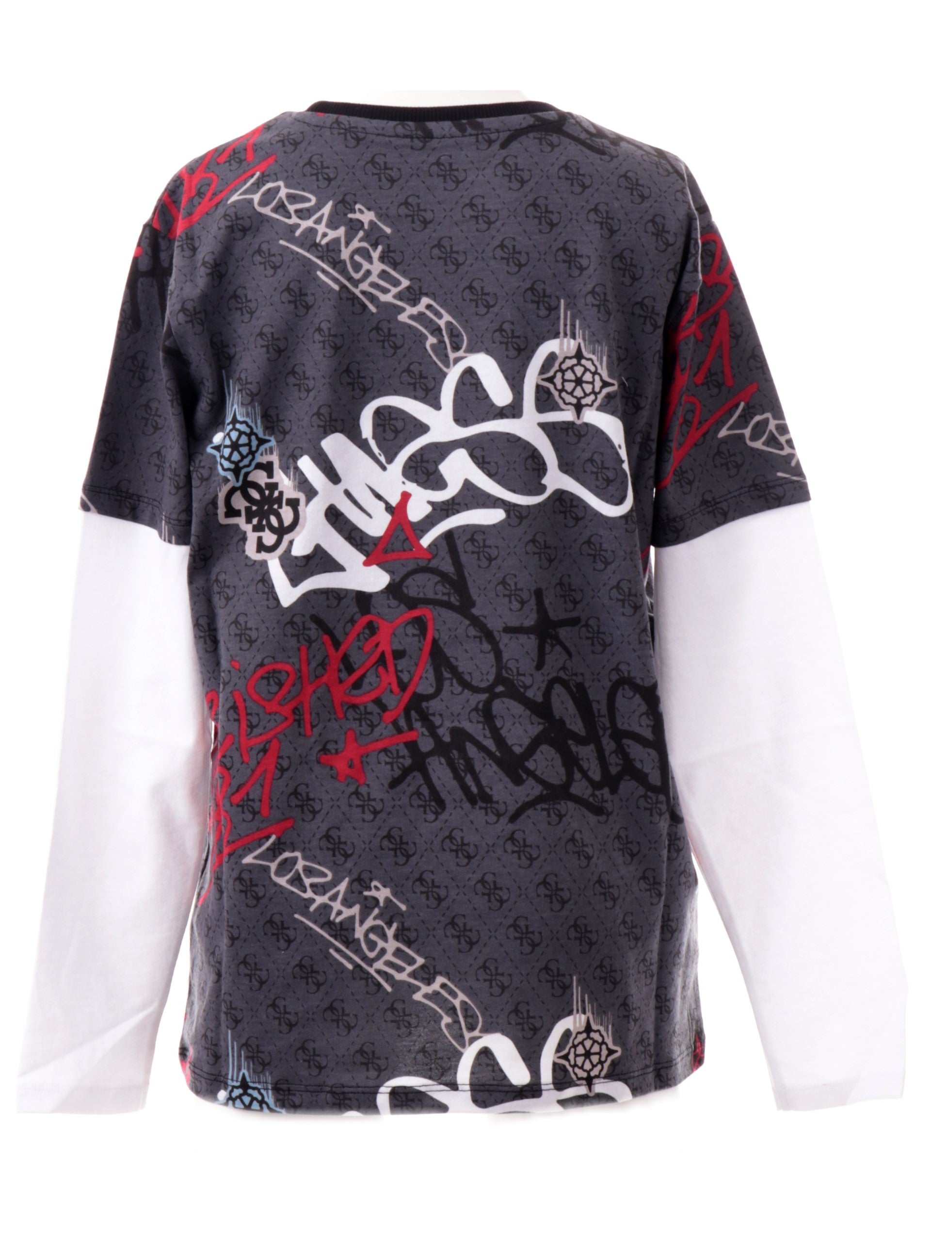 T-shirt grigia manica lunga Guess bambino. Questa maglia è realizzata in 100% cotone puro. Questa T-shirt girocollo a fantasia Guess ha le maniche lunghe bianche ed è caratterizzata da il logo biancocentrale