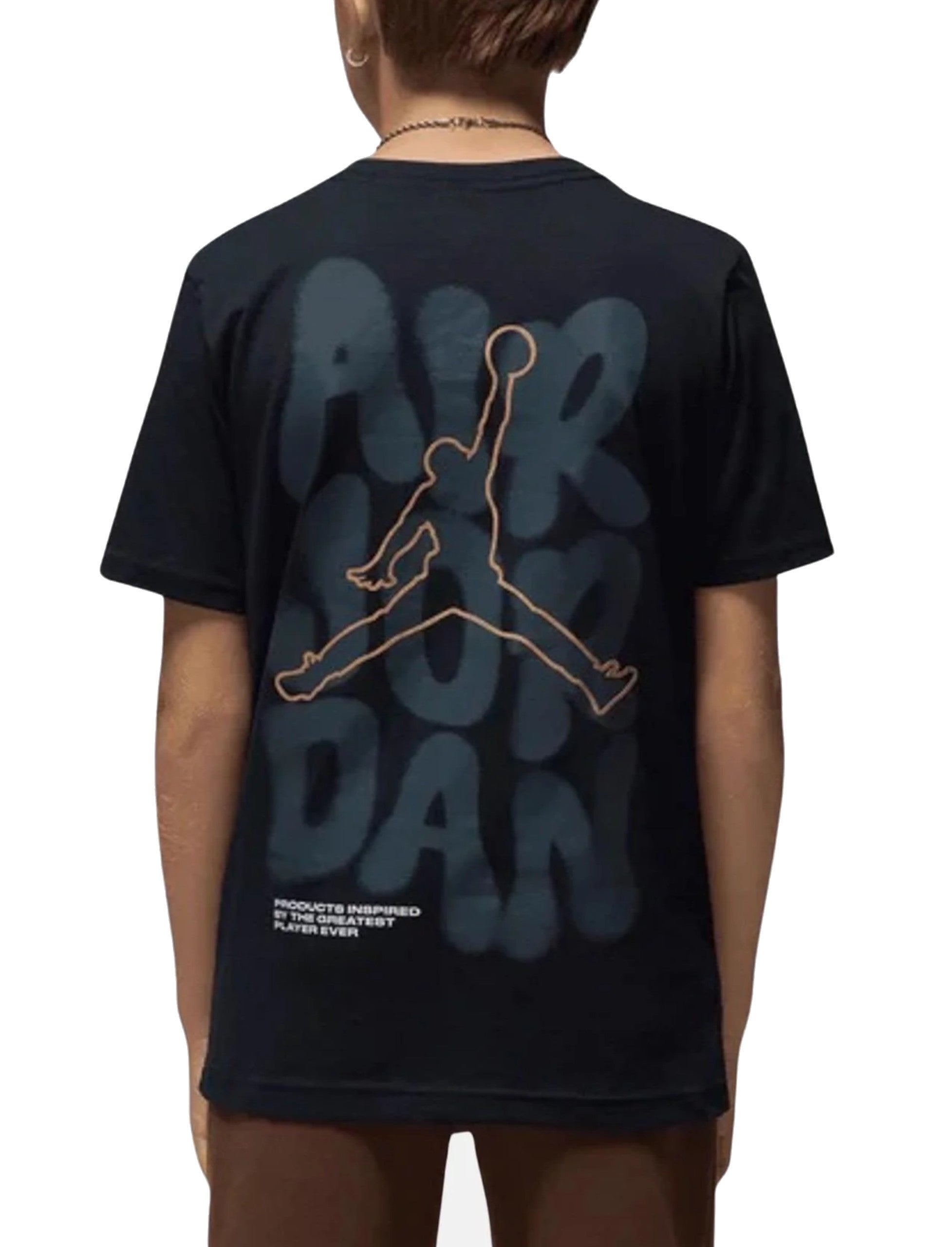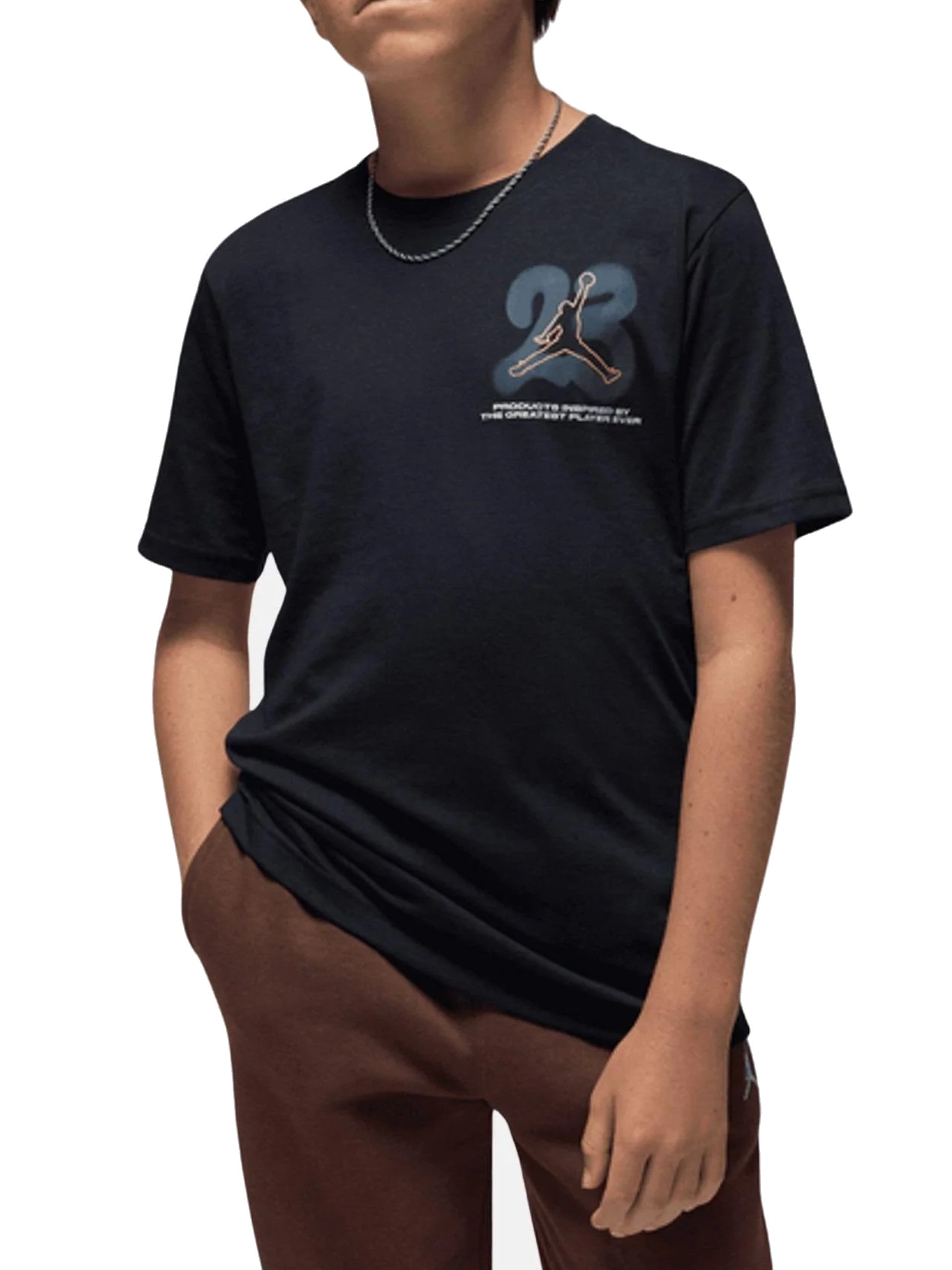 T-shirt Jordan nera da bambino maxi stampa 23 Throw Up. Questa T-shirt nera realizzata in cotone è caratterizzata dal girocollo, maniche corte e la maxi stampa Jordan sul retro e il logo Jordan a lato cuore