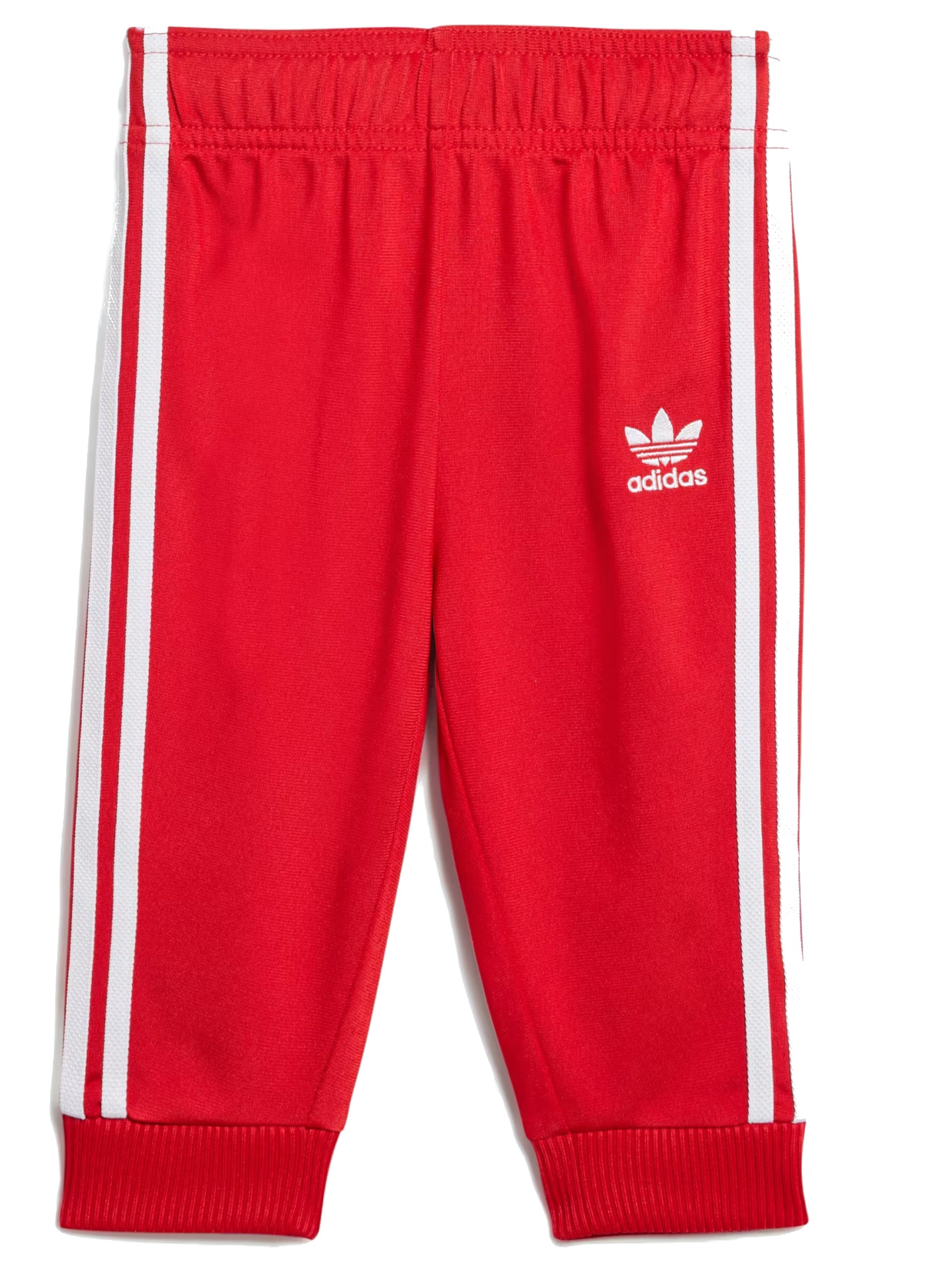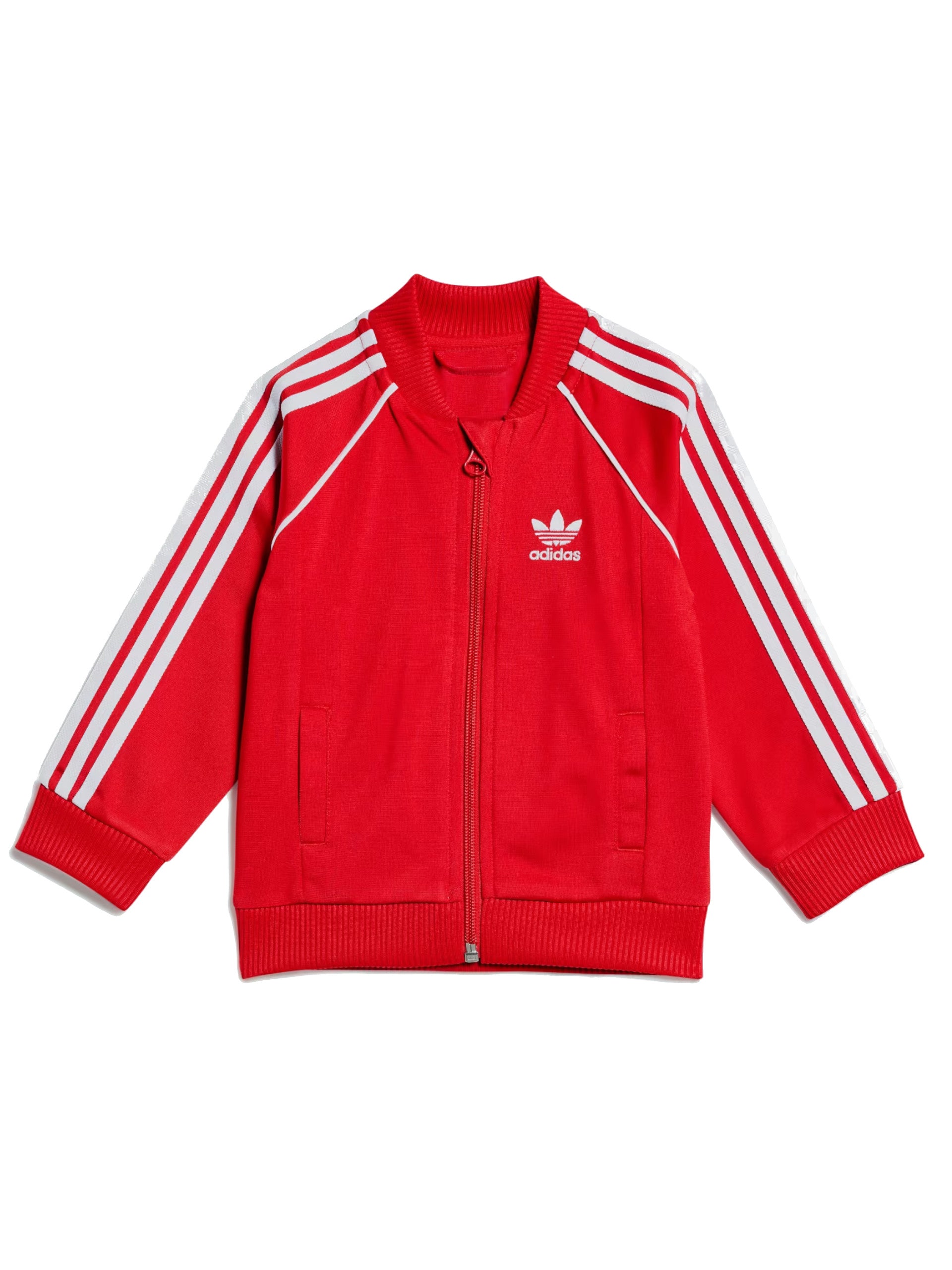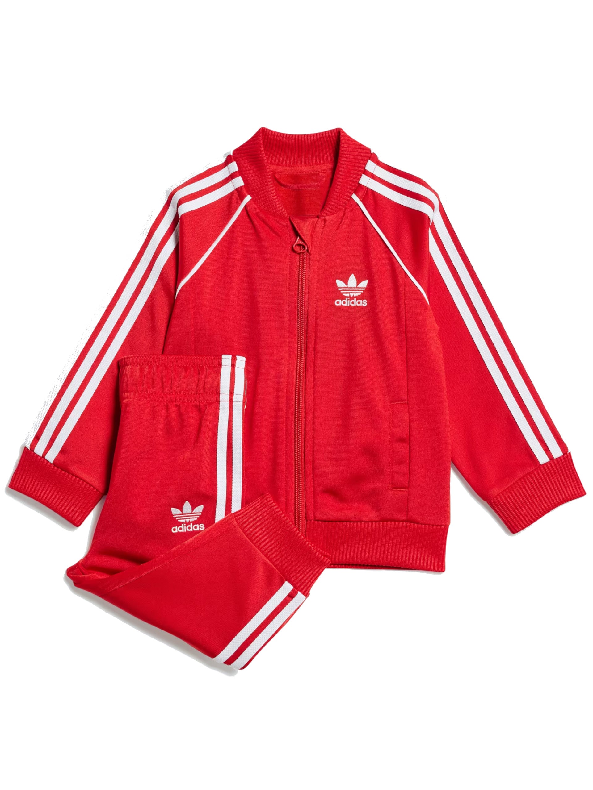 Tuta adidas rossa bambino. Questa tuta Adidas rossa ha la felpa con chiusura full zip centrale, due tasche laterali aperte, il logo Adidas ricamato, polsini e fondo elasticizzati. I pantaloni sono regolabili con i laccetti, polsini elasticizzati e il logo Adidas ricamato sul lato sinistro.