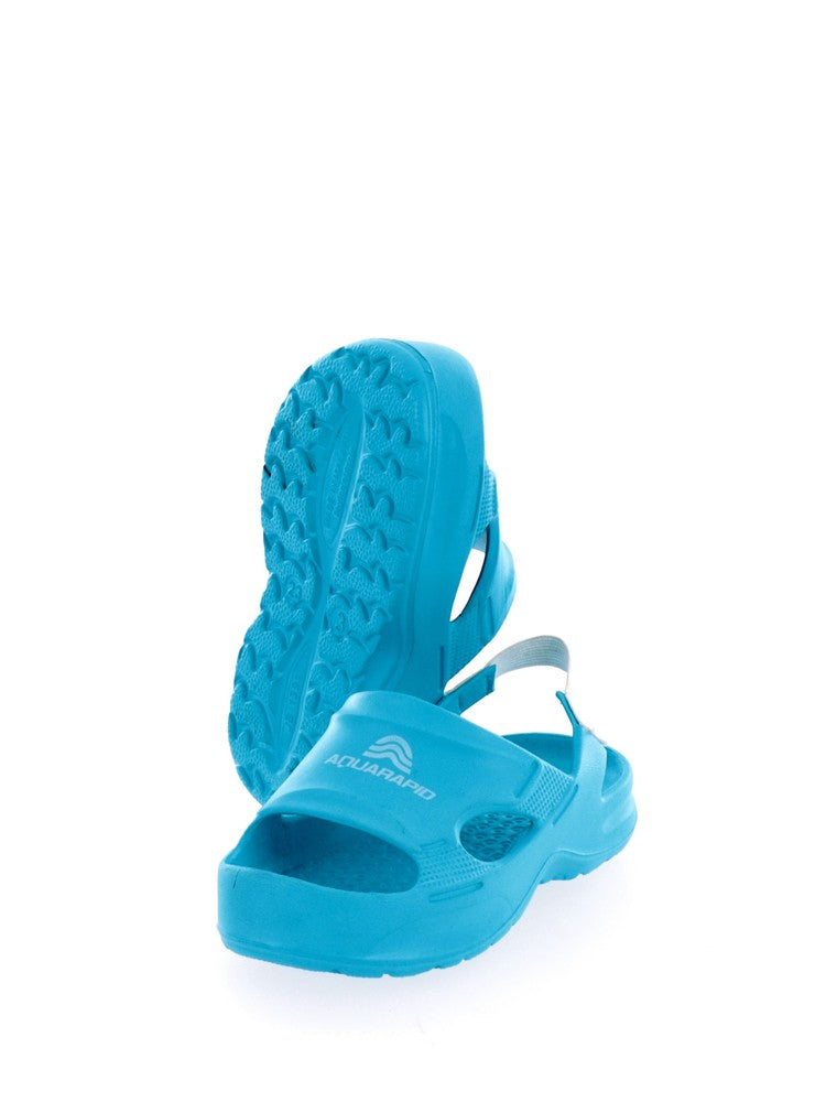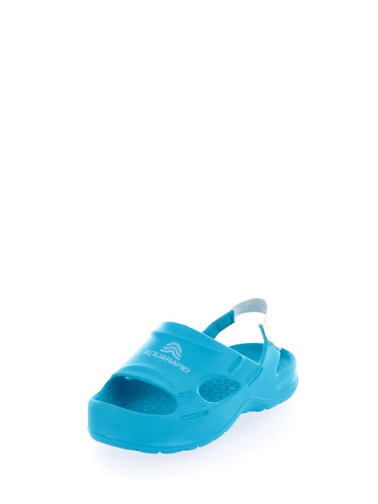 Ciabatte Aquarapid celesti da bambino con bordo della punta rialzato per non far fuoriuscire le dita, suola e sotto suola antiscivolo per una maggiore stabilità e laccetto elasticcizato sul talloneche ne migliora sicurezza e vestibilità. Queste ciabatte Aquarapid si adattano sia ad uso mare che piscina ed hanno l'iconico brand sul davanti in bianco a contrasto