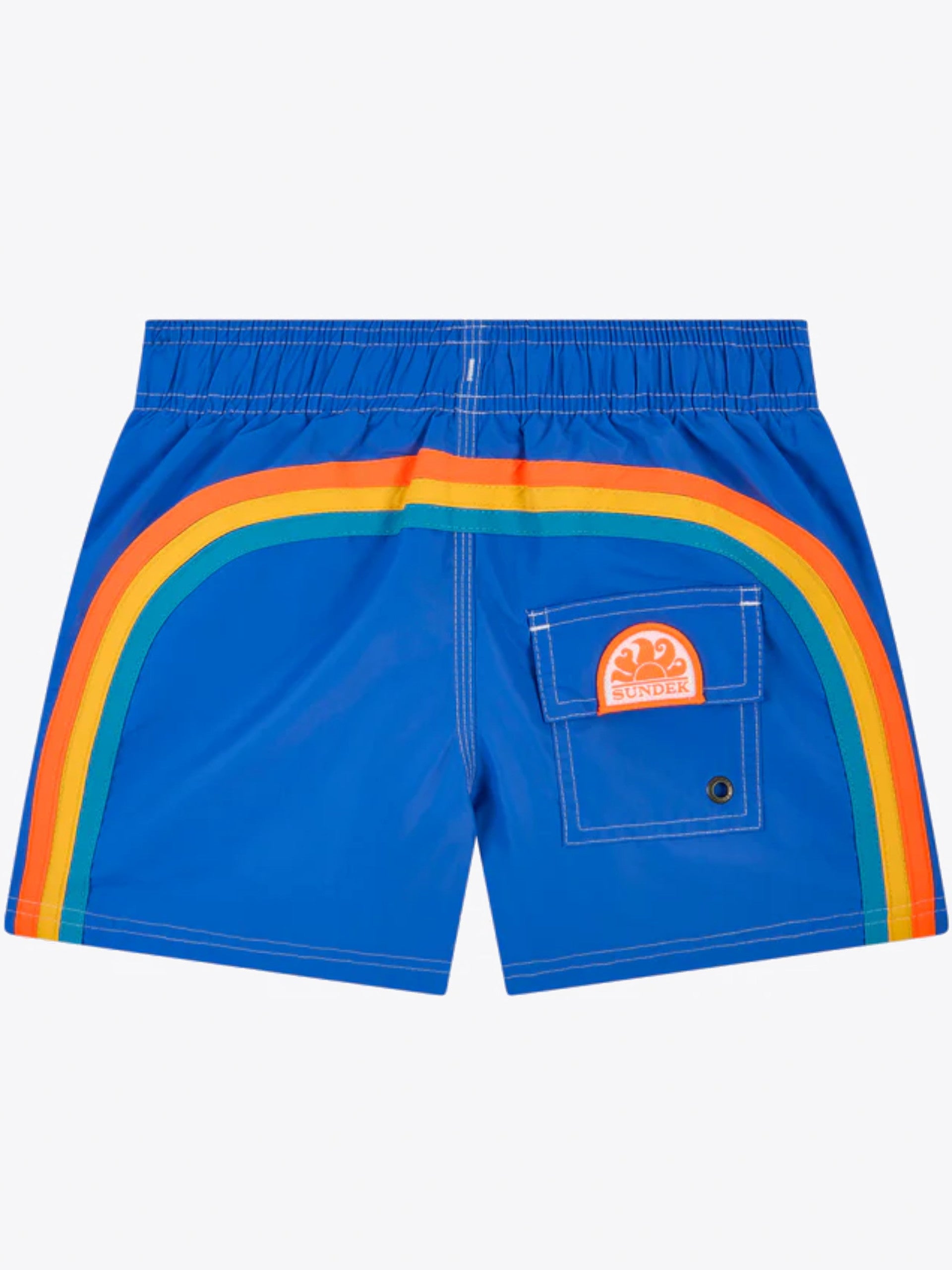 Costume mare Sundek blu royale da bambino Boardshort B504BDTA100001, è l'iconico boxer mare con arcobaleno sul retro del brand. Questo costume bambino Sundek è caratterizzato da cuciture a contrasto e tessuto nylon.