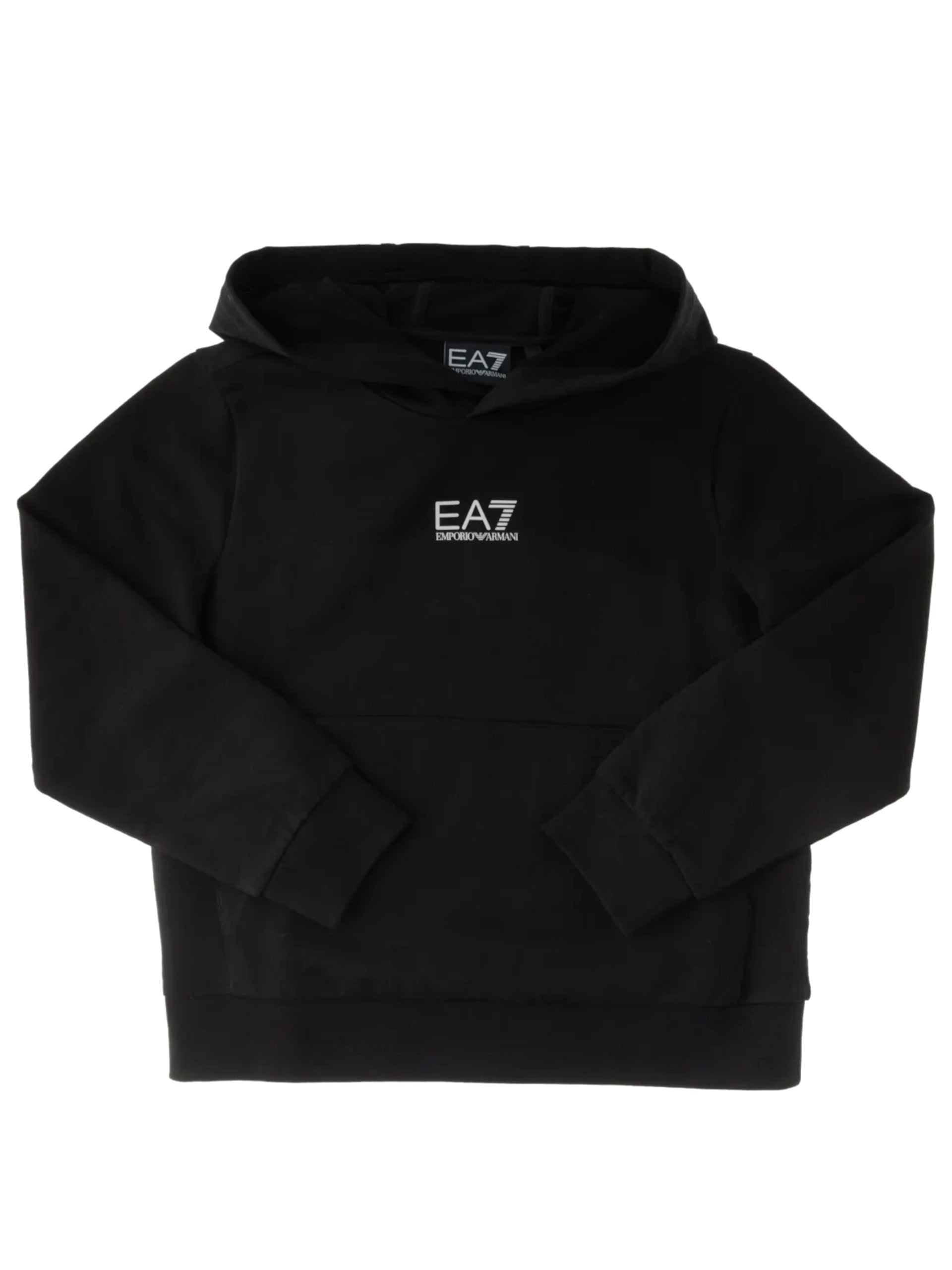 Felpa Emporio Armani EA7 nera da bambino con cappuccio 7B000024AF10380 UC001, realizzata in 100% puro cotone. Questa felpa EA7 nera ha il cappuccio fisso, una comoda tasca a marsupio, il logo EA7 applicato sul davanti, polsini e fondo elasticizzati.