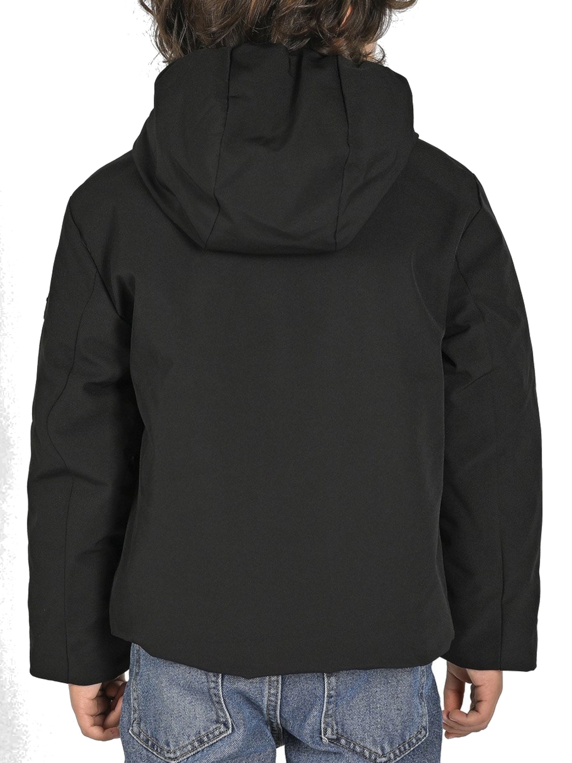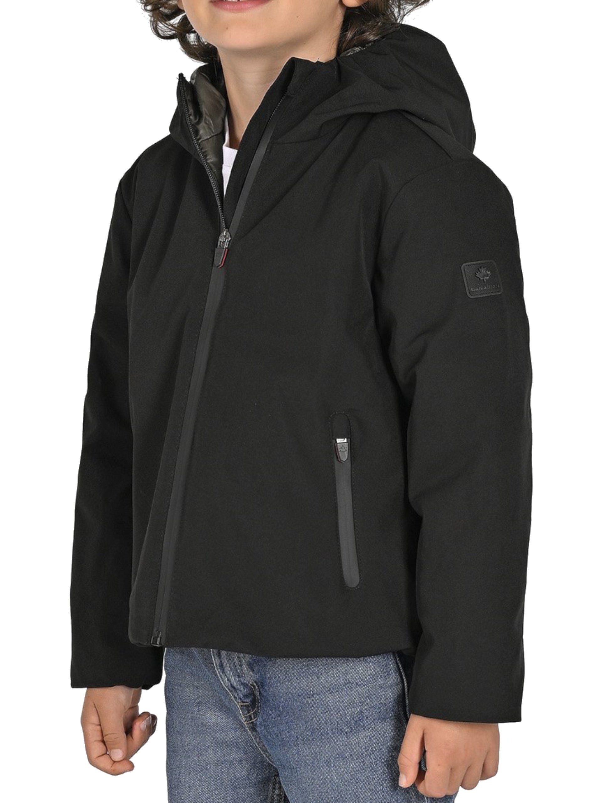Giacca Canadian nera bambino. Questa giacca Canadian è realizzato da un tessuto tecnico perfetto per il vento e la pioggia, questo piumino è caratterizzato da cappuccio fisso, chiusura full zip centrale, due tasche laterali, polsini a costine elasticizzati e fondo regolare, questa giacca è perfetto sia su un outfit elegante sia su un outfit sportivo
