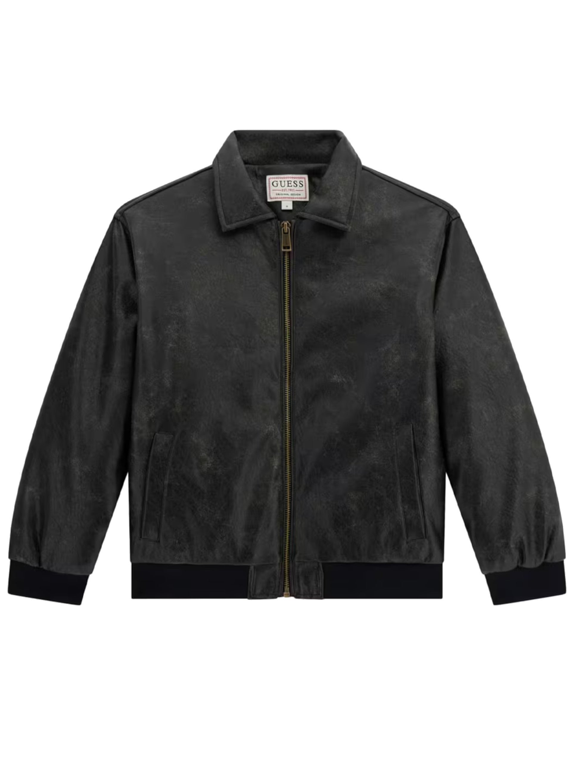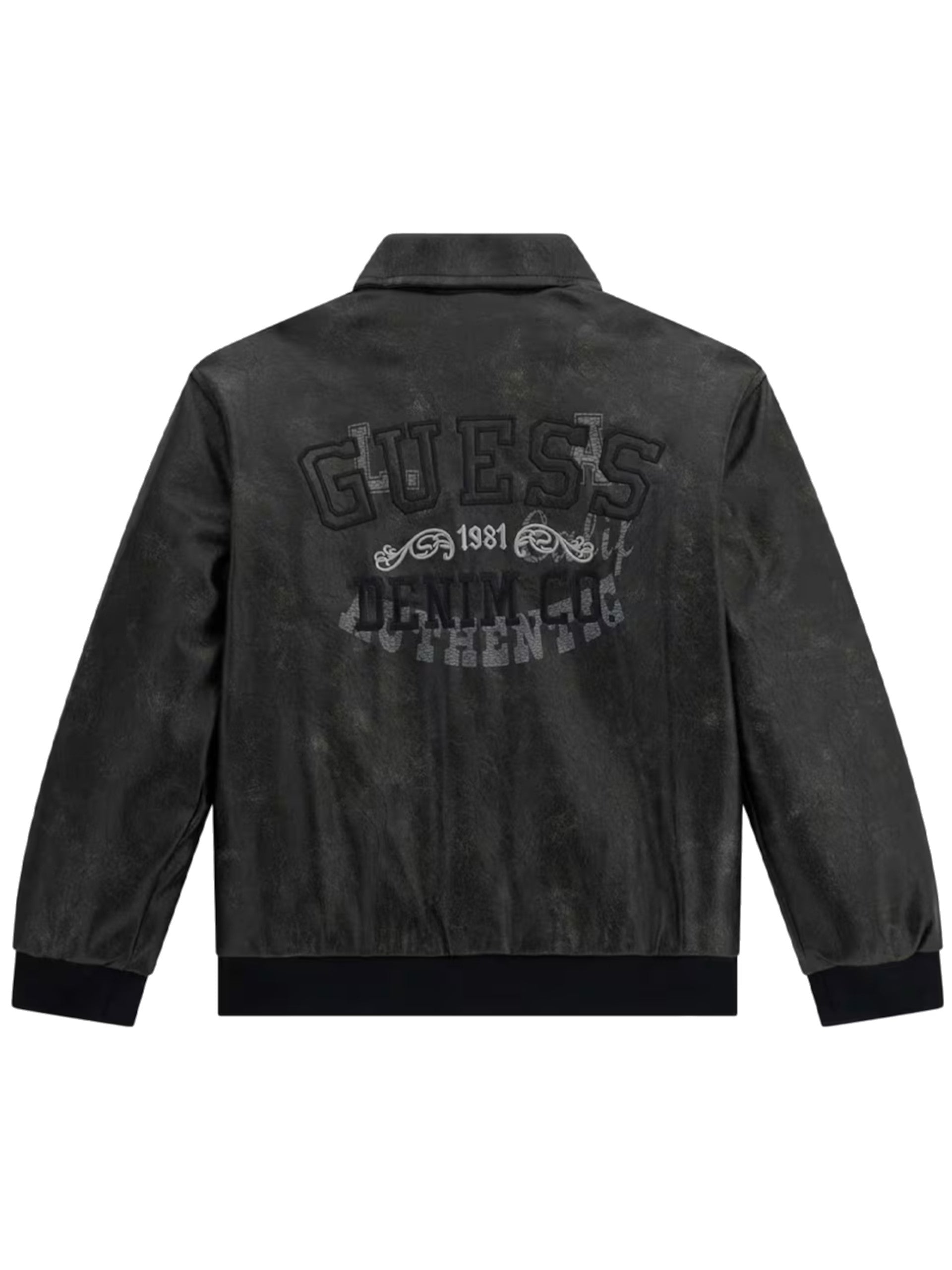Giacca pelle Guess nera da bambino con ricamo posteriore L5YL03W0100, realizzata con materiale eco-friendly. Questo giubbino pelle Guess nero ha il colletto alla francese, la chiusura full zip centrale, due tasche laterali aperte, un maxi ricamo sul lato posteriore, polsini e fondo elasticizzati.