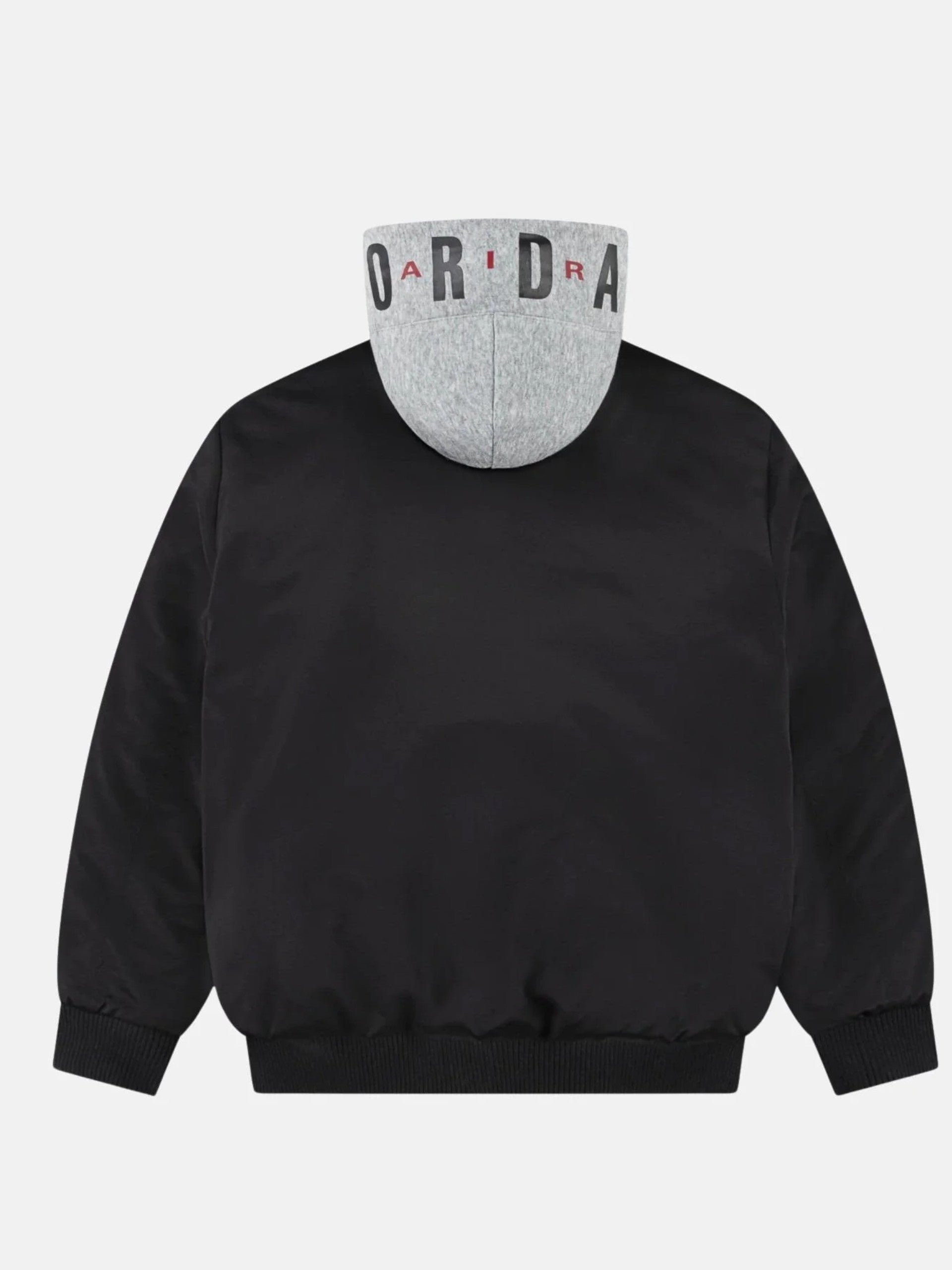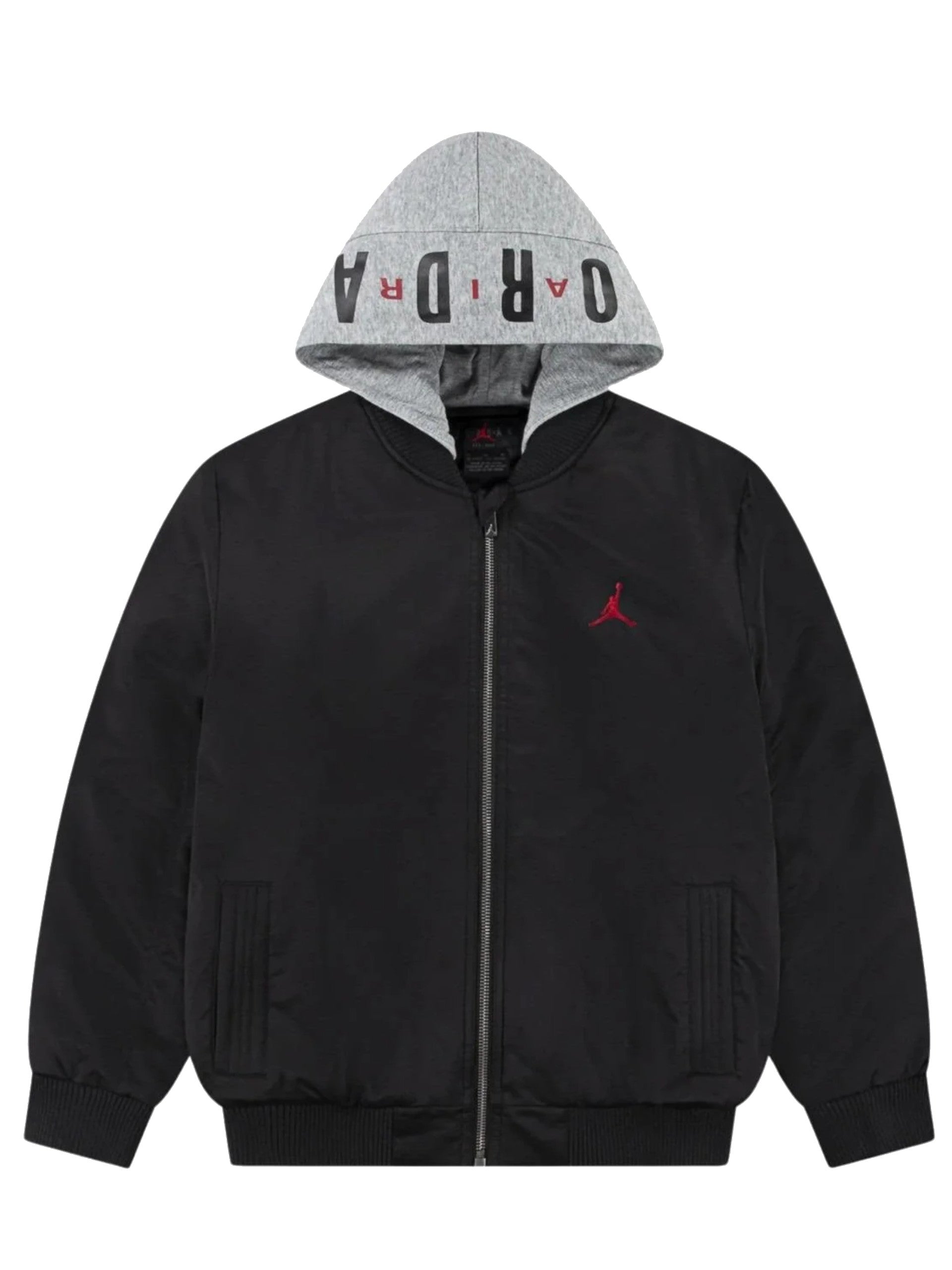 Giubbino Jordan nero da bambino con cappuccio. Questo giubbino Jordan nero da bambino è caratterizzato dal cappuccio fisso con scritta Jordan applicata chiusura centrale full zip, due tasche lateraliaperte, polsini e fondo elasticizzati a costine e su lato cuore troviamo l'iconico logo Jordan rosso, all'interno di questo giubbino troviamo un tessuto caldo ed avvolgente perfetto per la stagione invernale