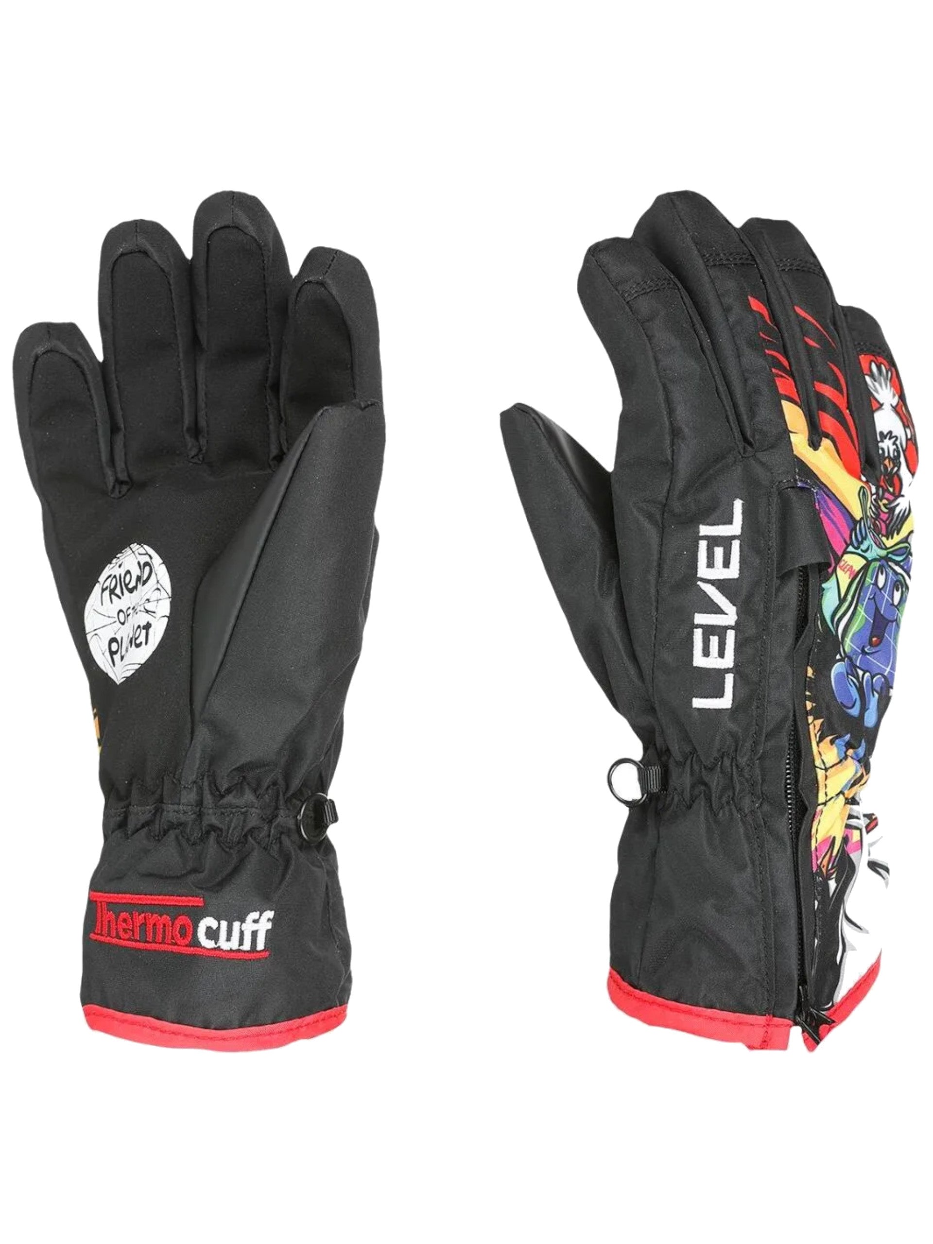 Guanti da sci Level nero da bambino. Questi guanti sono realizzati da starti interni con Membra-therm Plus massimizzano il calore e l'impermeabilità. Questo modello è perfetto per ogni condizione atmosferica e può resistere a temperature bassissime, all'interno di questi guanti troviamo un tessuto felpato e sono caratterizzati da molti personaggi di fantasia stampati sul dorso della mano, rendendo questi guanti la scelta perfetta