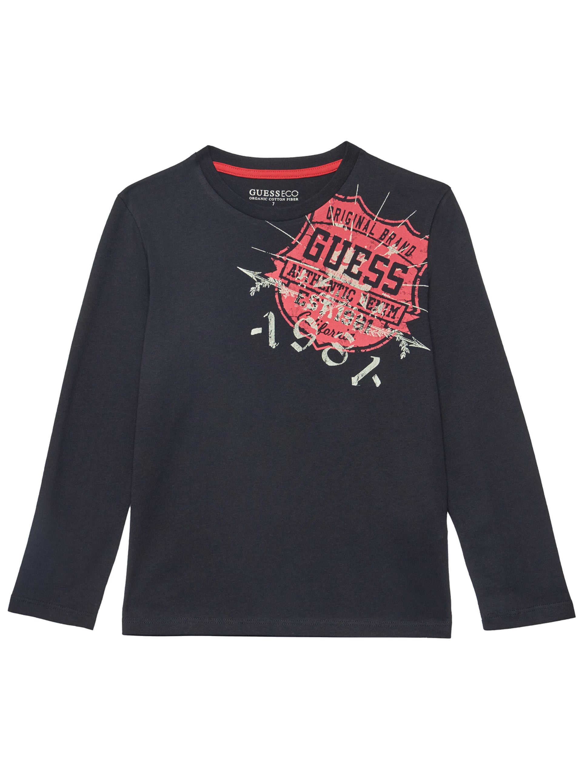 Maglia Guess nera da bambino maniche lunghe con stampa Guess rossa L5YI16K8HM4, realizzata in 100% puro cotone. Questa t-shirt Guess nera girocollo ha le maniche lunghe e la stampa Guess rossa sul davanti.