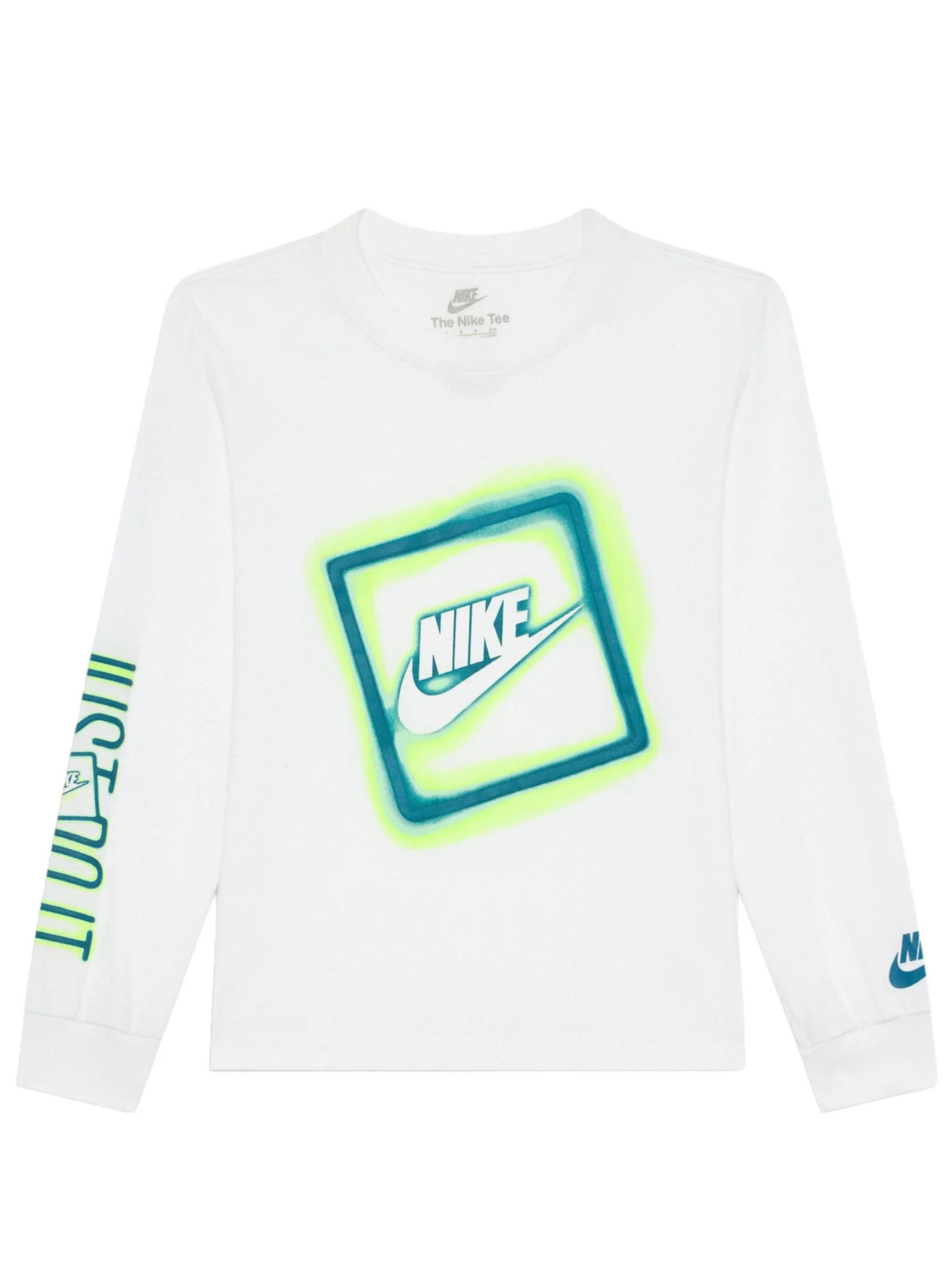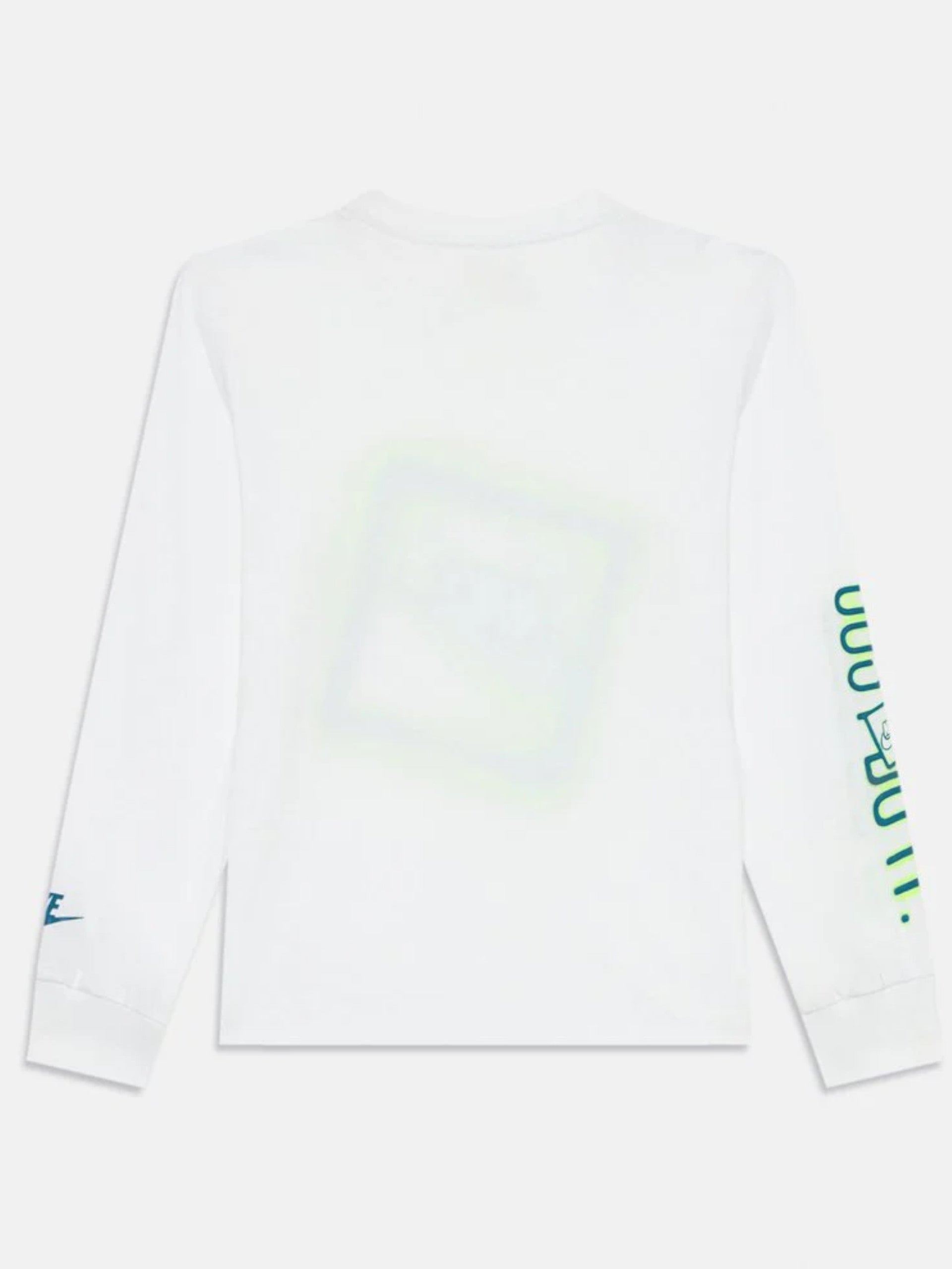Maglia maniche lunghe bianca da bambino con scritta box futura neon. Questa maglia Nike bambino bianca maniche lunghe è perfetta per essere utilizzata in ogni stagione grazie al design grafico e di tendenza e il tessuto in puro cotone.