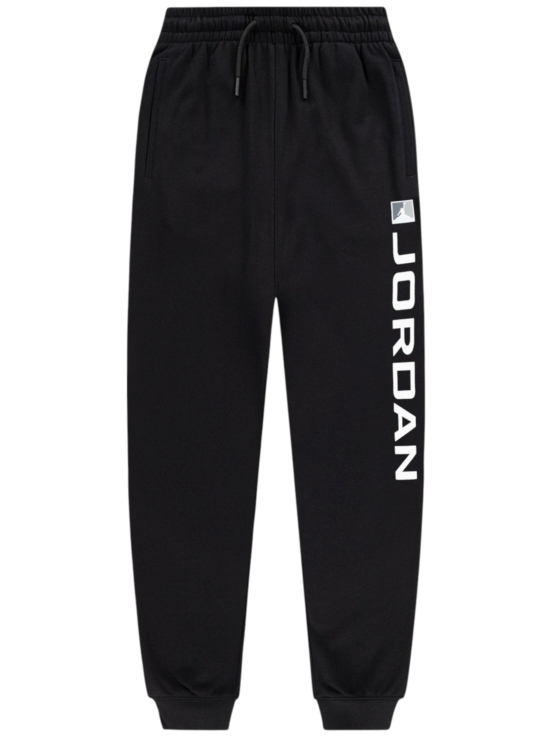 Pantaloni tuta Jordan neri da bambino con stampa Jordan 95F087, realizzati in cotone. Questi pantaloni Jordan neri hanno la banda elastica sul punto vita regolabile con laccetti, due tasche laterali aperte, una tasca posteriore, polsini elasticizzati e stampa Jordan.