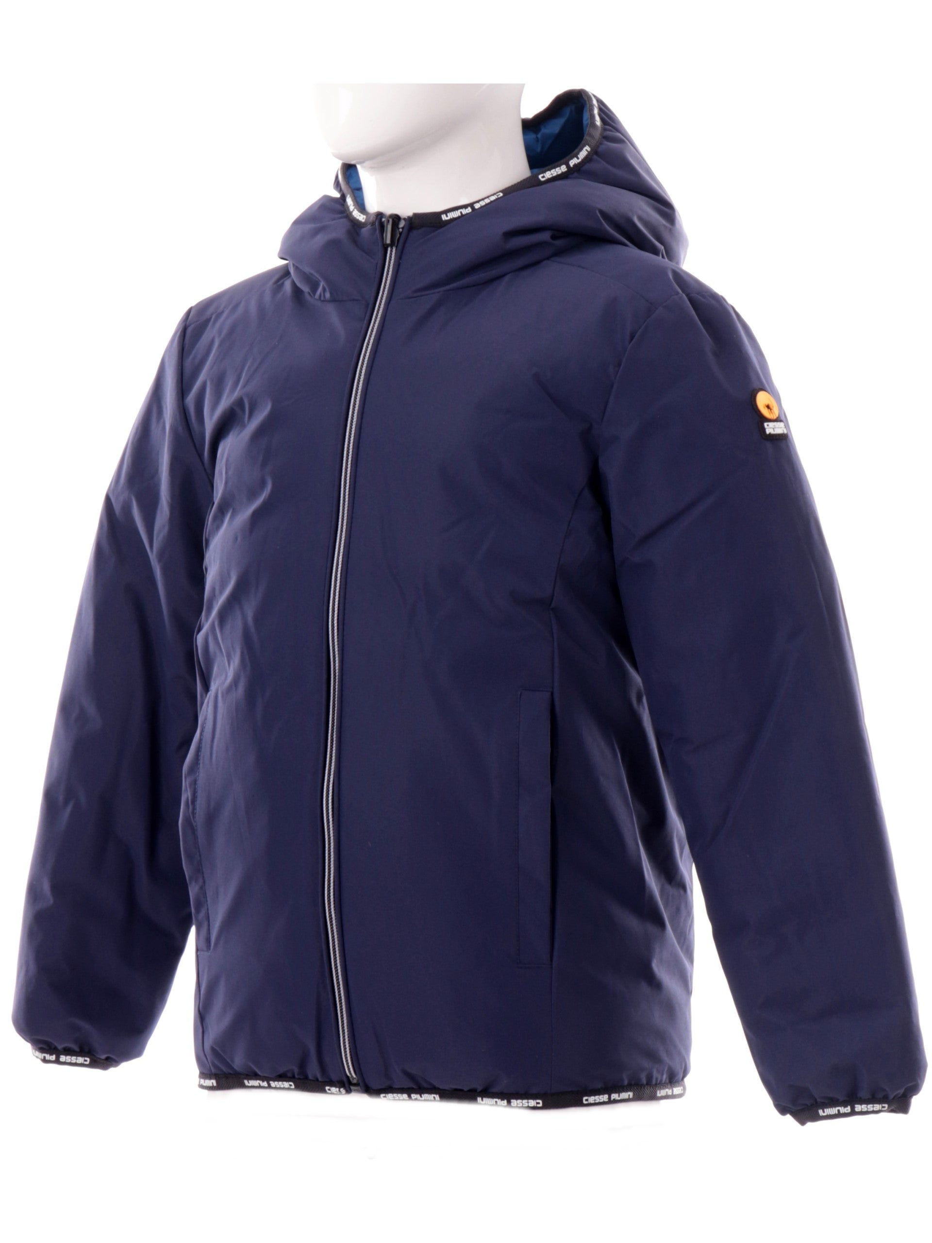 Piumino Ciesse reversibile blu e celeste bambino. Questa giacca Ciesse antivento è caratterizzata da cappuccio fisso, due tasche laterali, chiusura con zip, polsini e fondo elasticizzati e il logo giallo del brand stampato sul lato sinistro.