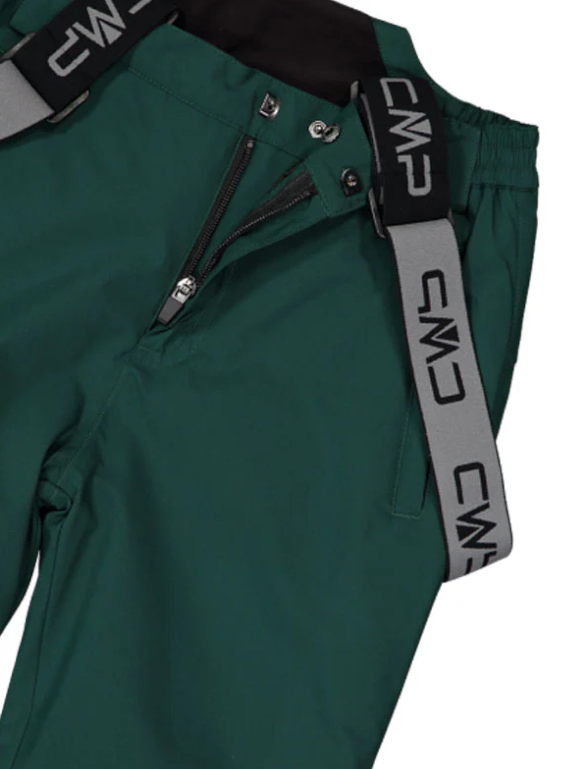 Salopette da sci verde da bambino CMP. Questa salopette da bambina dotata di cuciture termonastrate e tecnologia Clima Protect che garantiscono un buon livello di impermeabilità, traspirabilità, idrorepellenza e protezione. Modello ergonomico, comodo e funzionale grazie alle bretelle regolabili, staccabili sul fronte e alle ghette sul fondo. Questa salopette è caratterizzata dalla chiusura a bottone più zip, due tasche laterali con zip e fondo con zip.