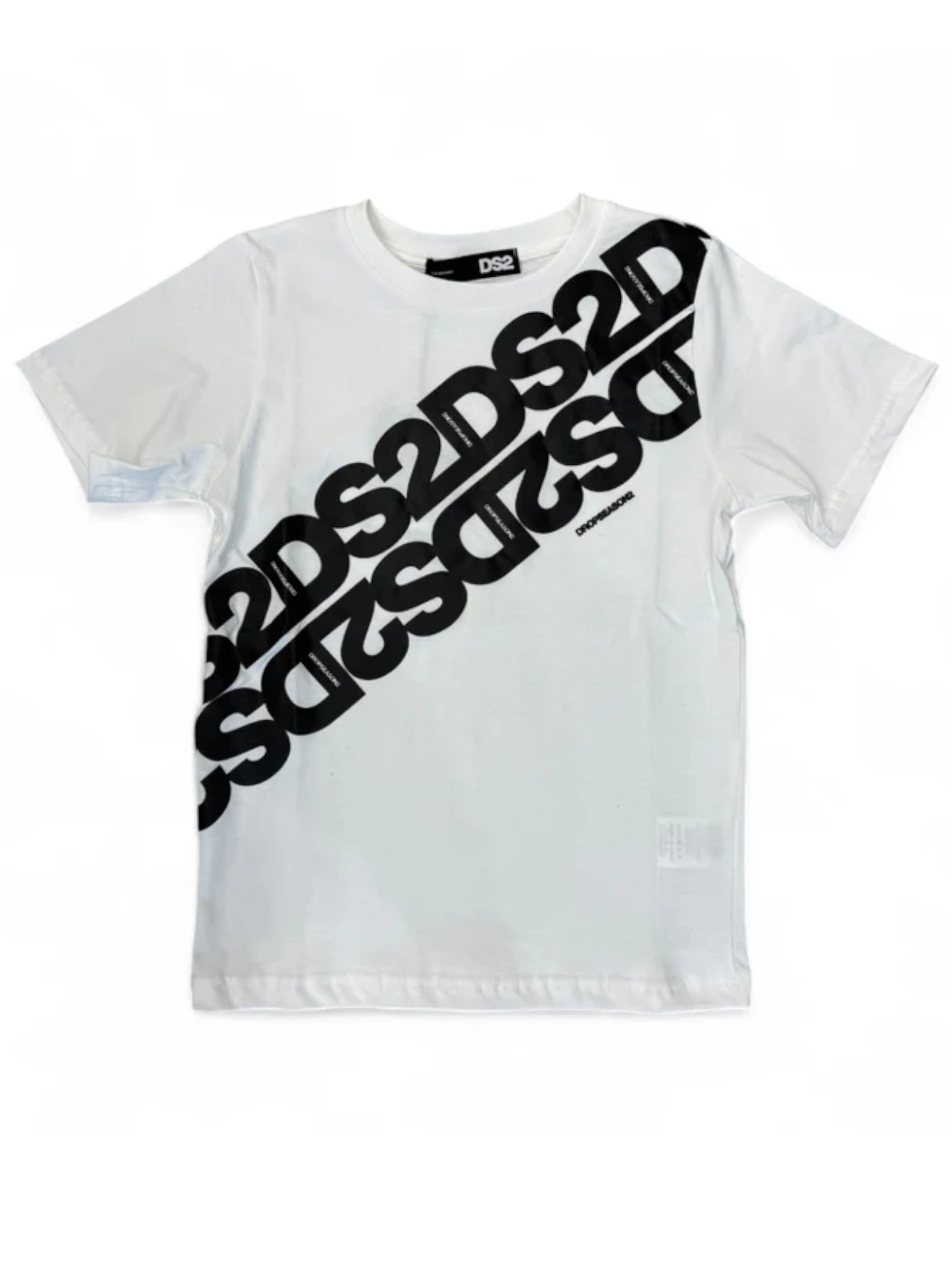 T-shirt DS2 bianca bambino. Questa T-shirt a maniche corte DS2 bianca è realizzata da 100% cotone puro, caratterizzata da maxi logo DS2 nero