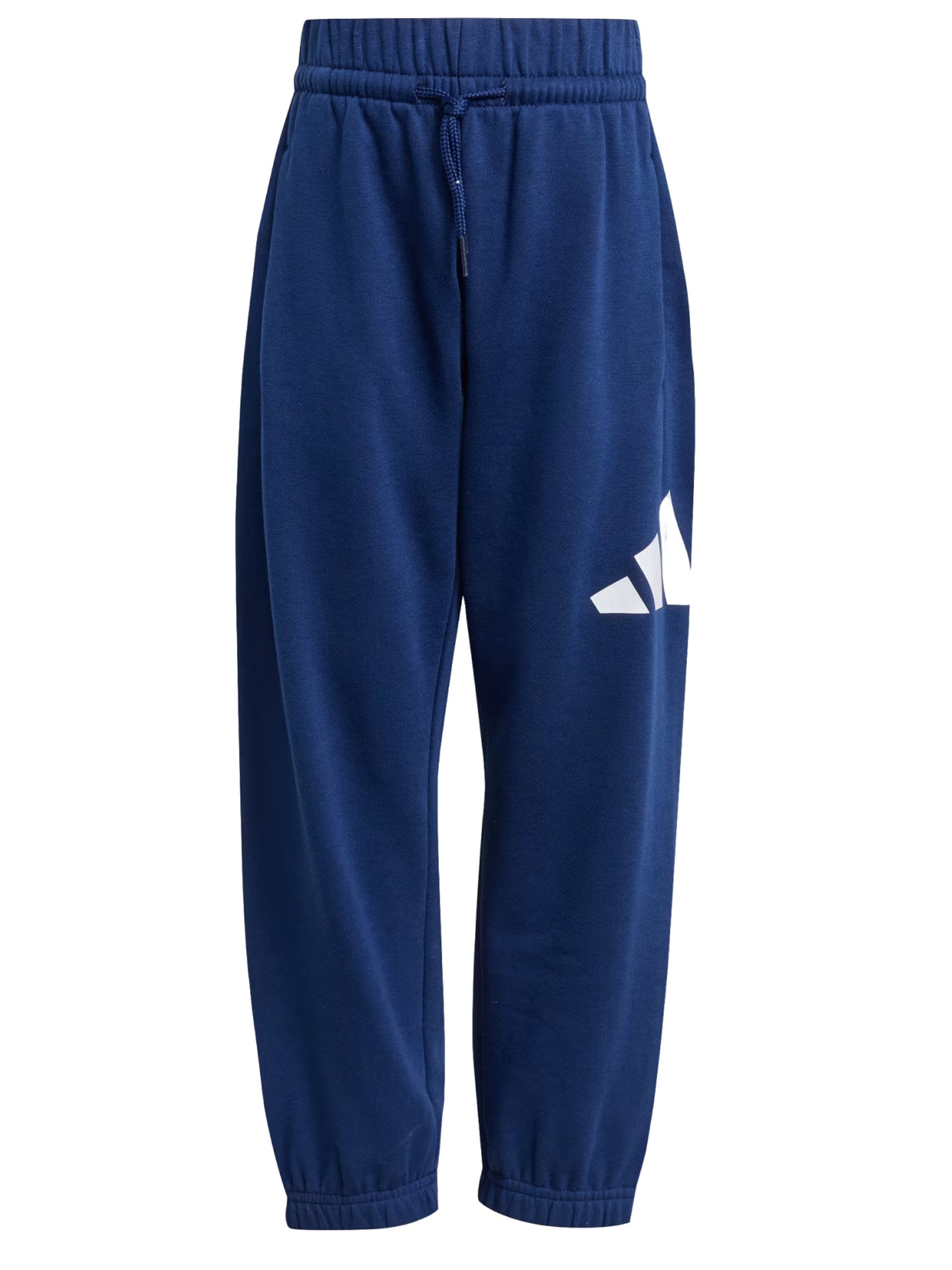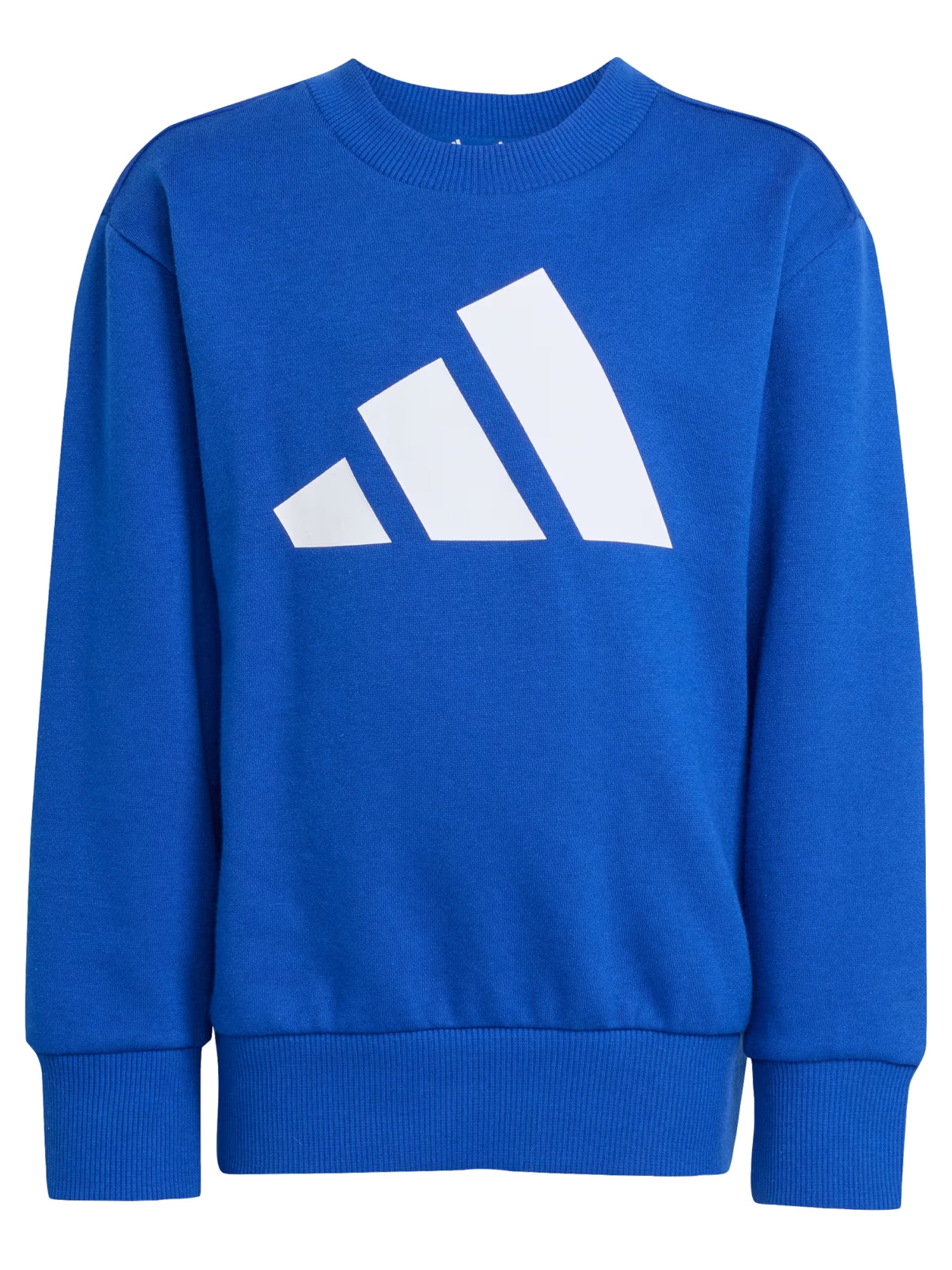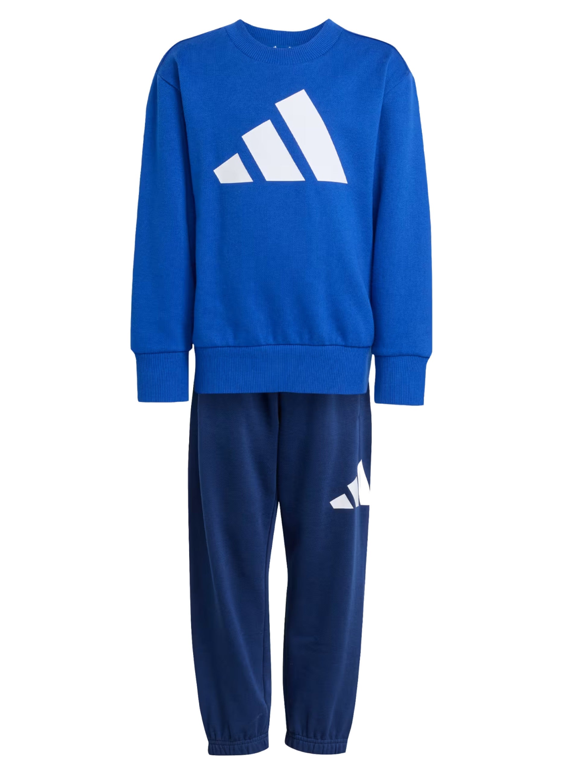 Tuta Adidas blu da bambino in cotone felpata con felpa logo stampato bianco sul davanti . Questa tuta blu Adidas bambino JM0881 è composta da felpa Adidas bambino in cotone felpato con tasche e pantaloni con vita elastica e polsini sul fondo.