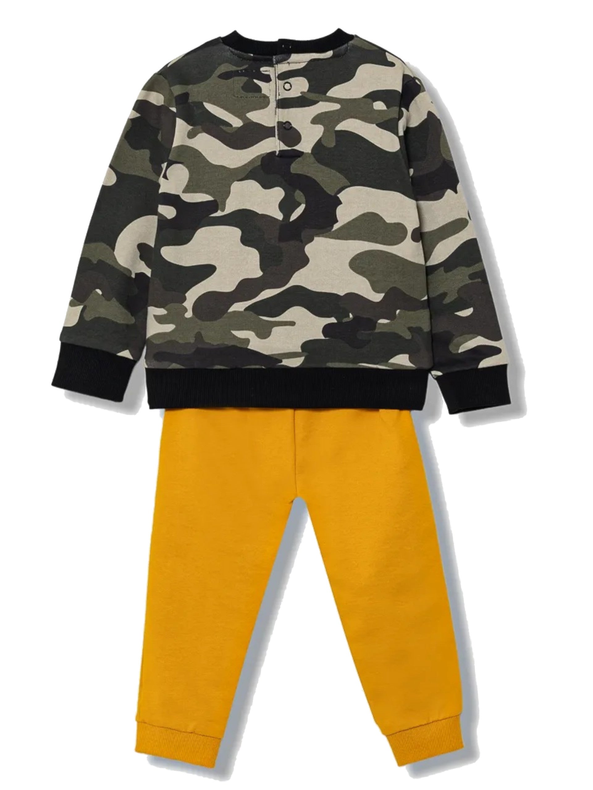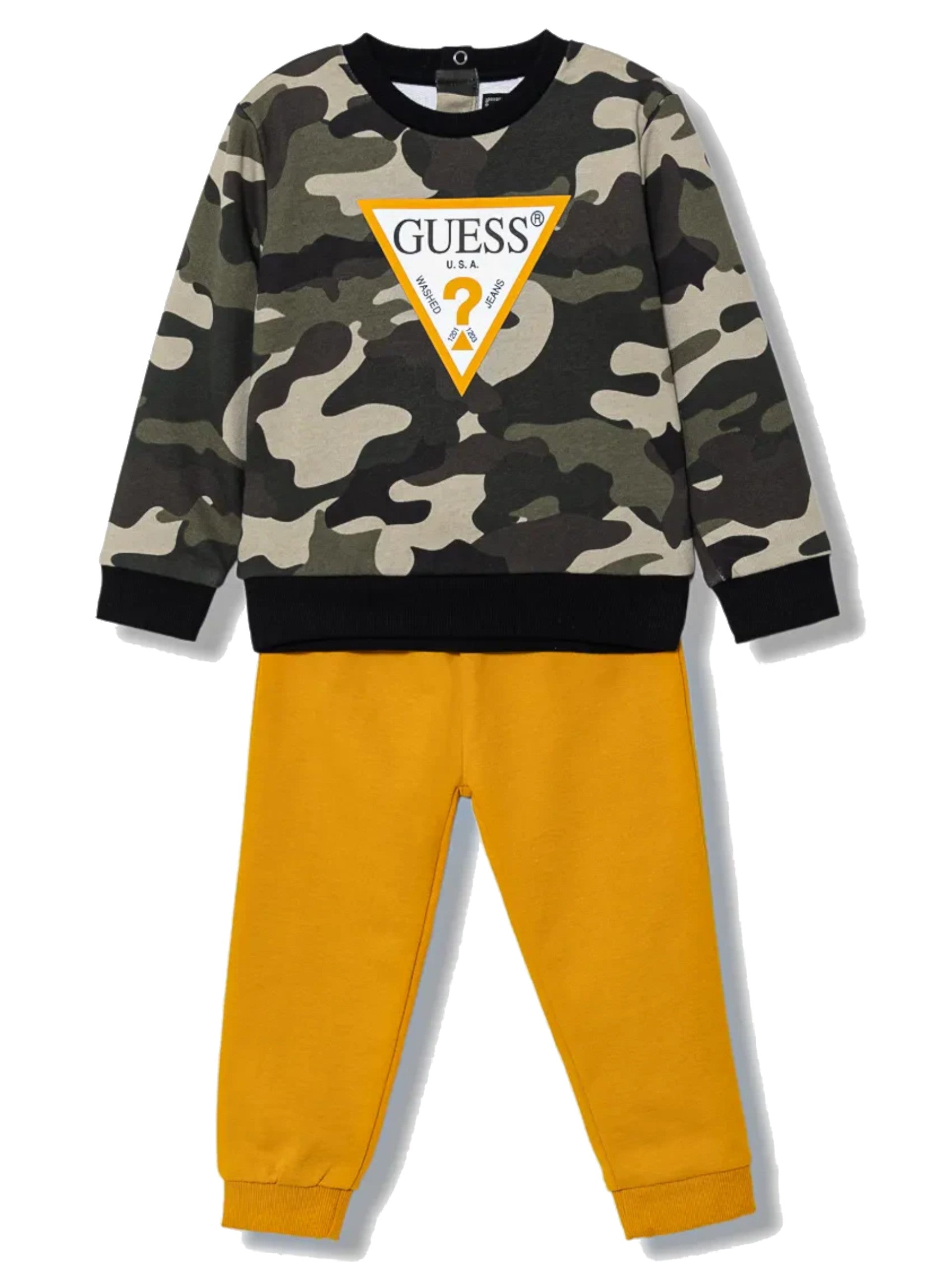 Tuta Completo Guess felpa e pantaloni da neonato verde-giallo. Questo completo Guess da bambino è caratterizzati dalla felpa verde e da pantaloni tuta gialli, realizzati in 100% puro cotone. La felpaGuess verde è caratterizzata dal girocollo la maxi stampa Guess sul davanti, maniche lunghe con polsini e fondo elasticizzati a costine. Pantaloni Guess gialli hanno la banda elastica in vita con i lacci e il fondo elasticizzato a costine.