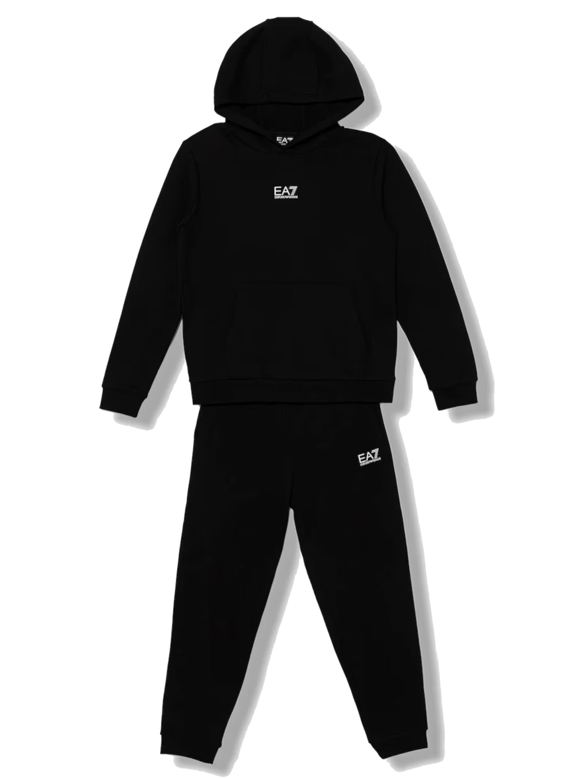 Tuta Emporio Armani EA7 nera da bambino chiusa con cappuccio 7B000164AF10368. Questa tuta completa Armani bambino è caratterizzata da pantaloni jogger con polsini e tasche e felpa Armani nera con cappuccio e logo sul davanti.