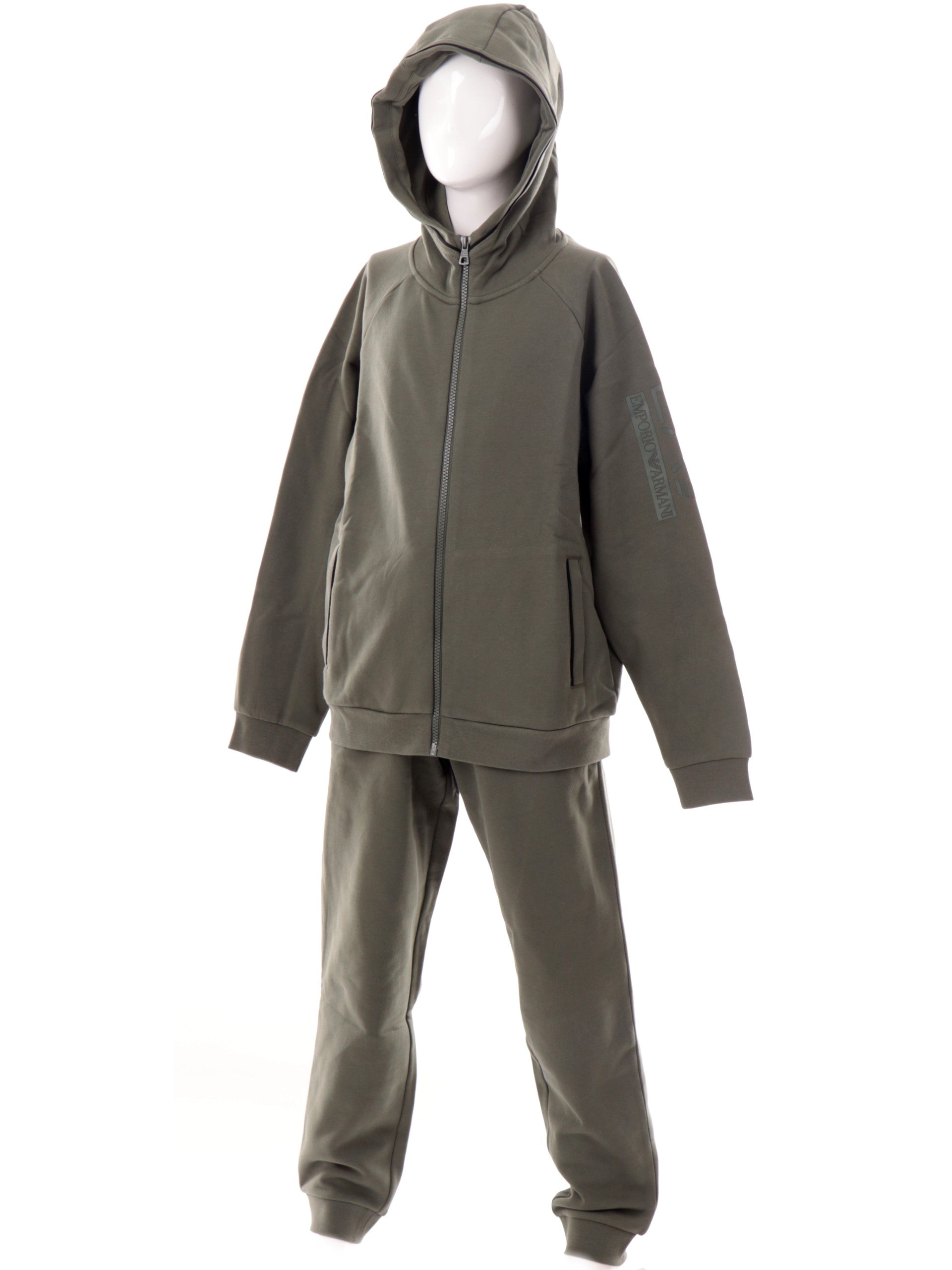 Tuta felpata EA7 verde bambino. Questa tuta EA7 verde da bambino è caratterizzata da una felpa e pantaloni. La felpa è realizzata da un tessuto felpato ed è caratterizzata da cappuccio e con la chisura a zip e la scritta EA7 sulla manica sinistra. Il pantalone è realizzato sempre da un tessuto felpato regolabile con i lacci che si trovano all'interno, caratterizzato da due tasche laterali e dal logo EA7 sul lato sinistro