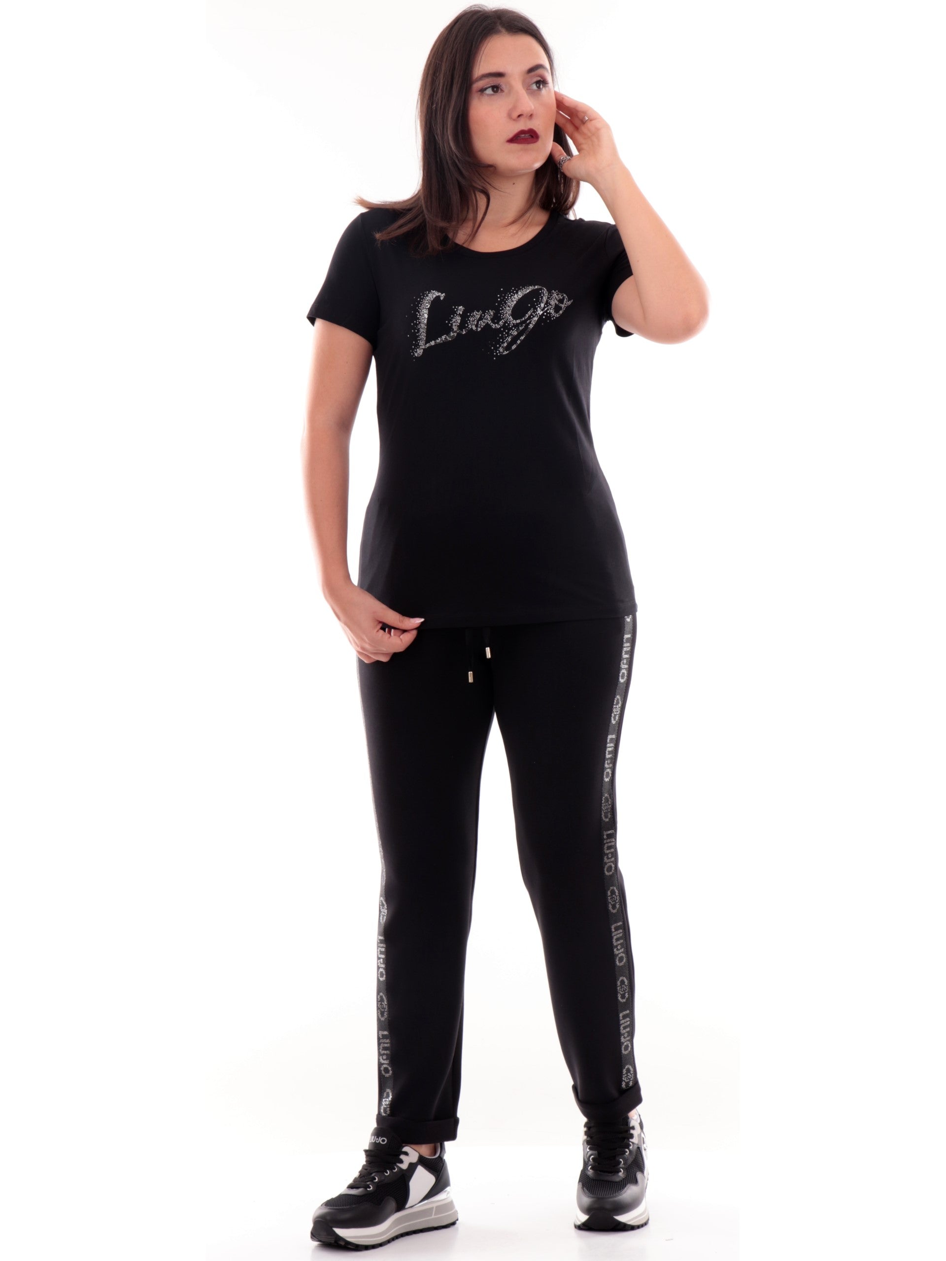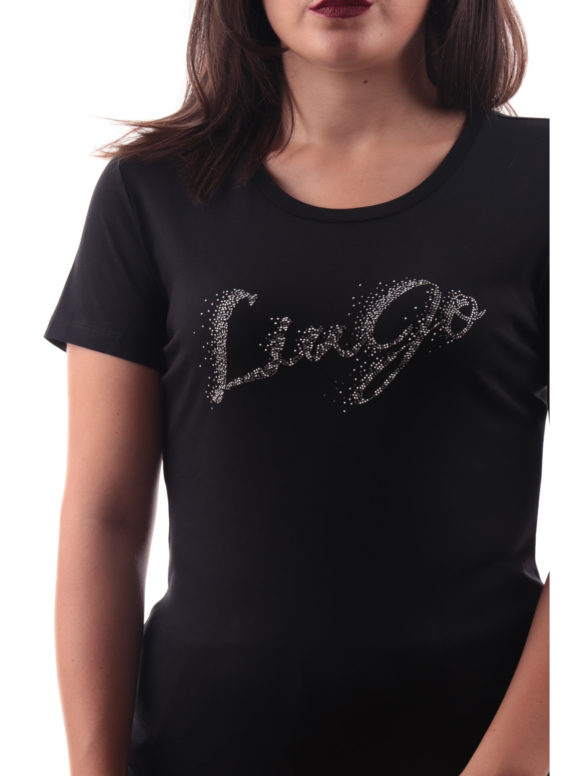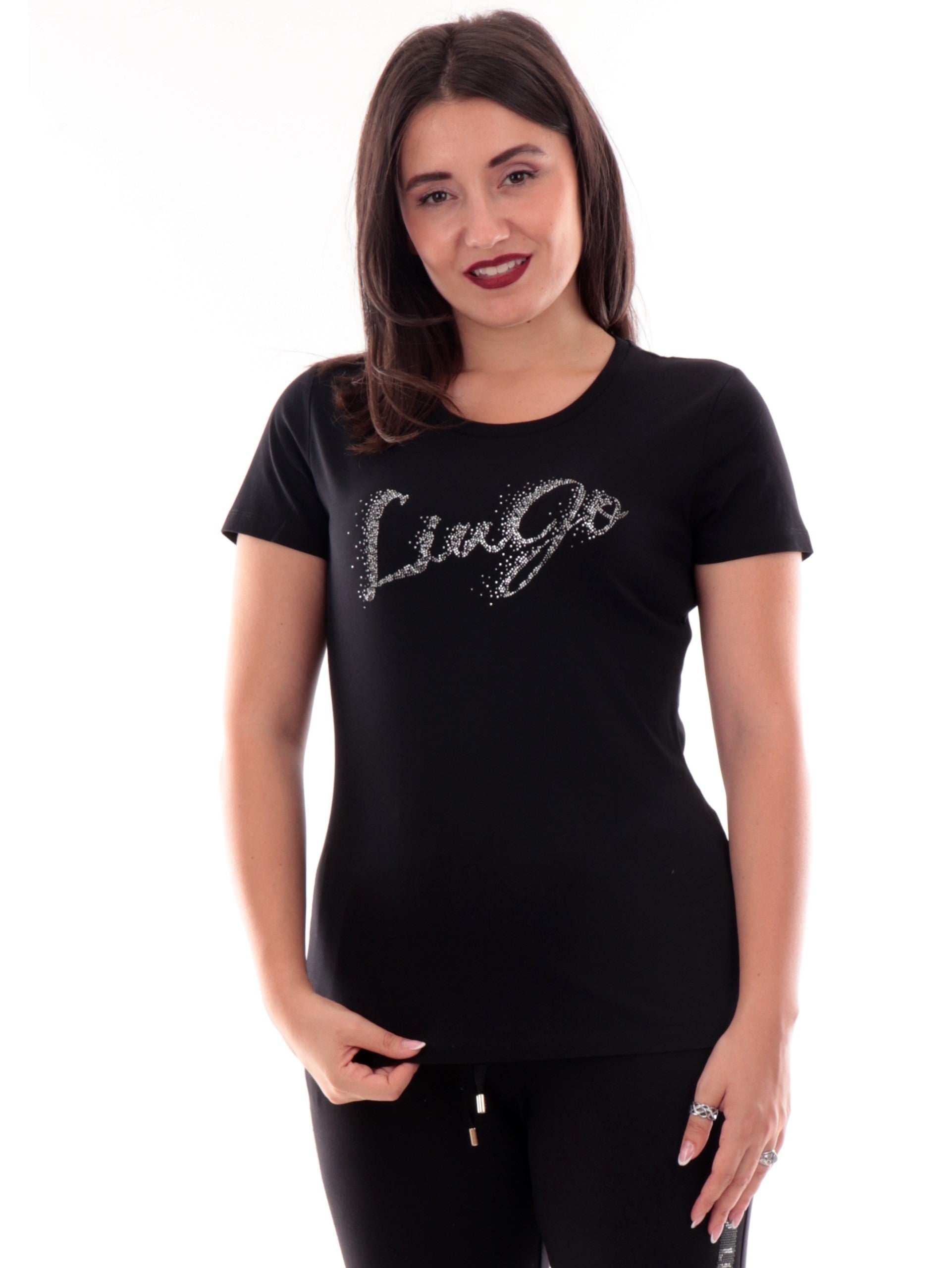 T-shirt Liu jo Nera da donna con logo strass argento UF5266JS904P900