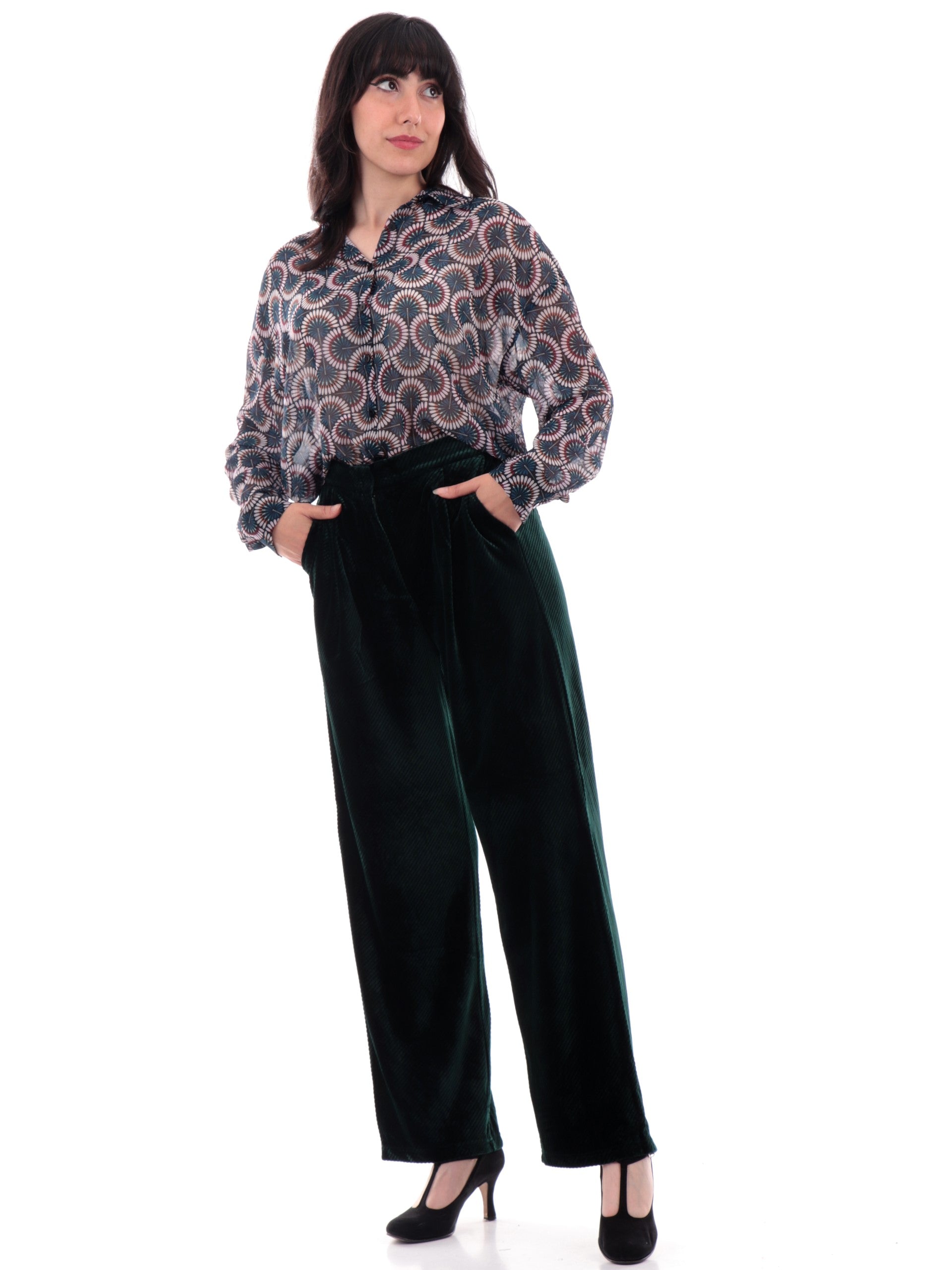 Pantaloni velluto Molly Bracken verdi da donna rigati T1695ACHDK. Questi pantaloni Molly verdi hanno la chiusura con bottone più zip, la banda elastica sul punto vita, due tasche laterali aperte con taglio obliquo e il fondo ampio.