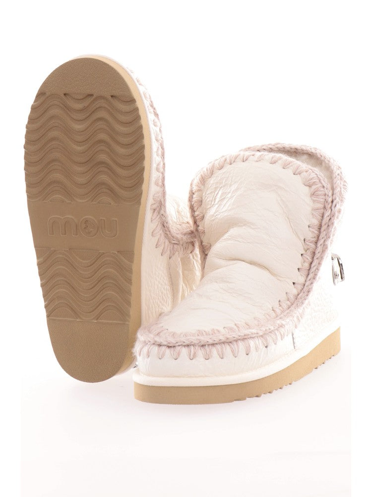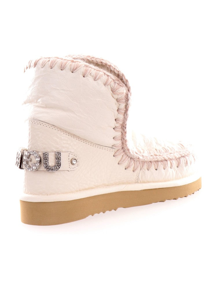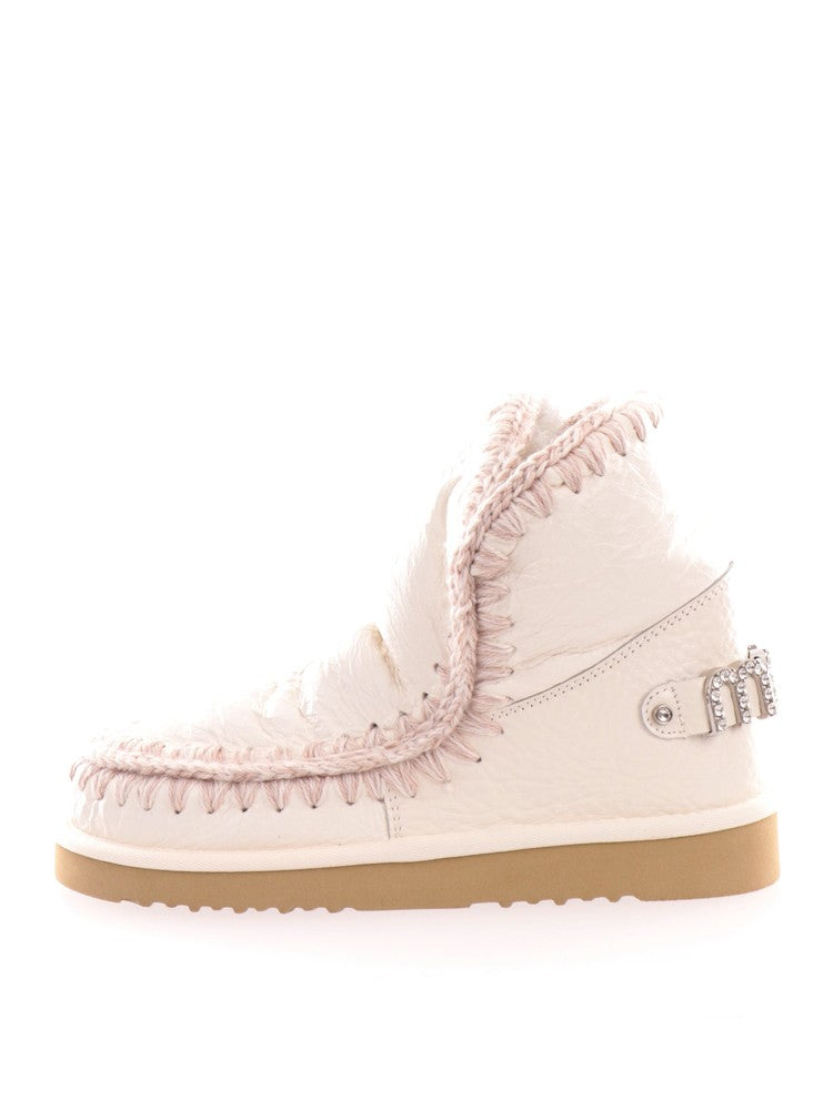 Scarpe Mou bianche da donna Eskimo 18 Rhinestones 101036C. Questi stivali Mou bianchi hanno la tomaia realizzata in 100% pura lana con inserti in pelle, la suola in gomma per il massimo comfort e la fodera in shearling. Sul davanti di questi stivaletti Mou neri troviamo la 'chiusura' slip on e il patch del brand applicato sulla zona tallonare con strass.