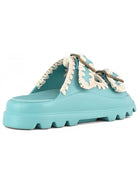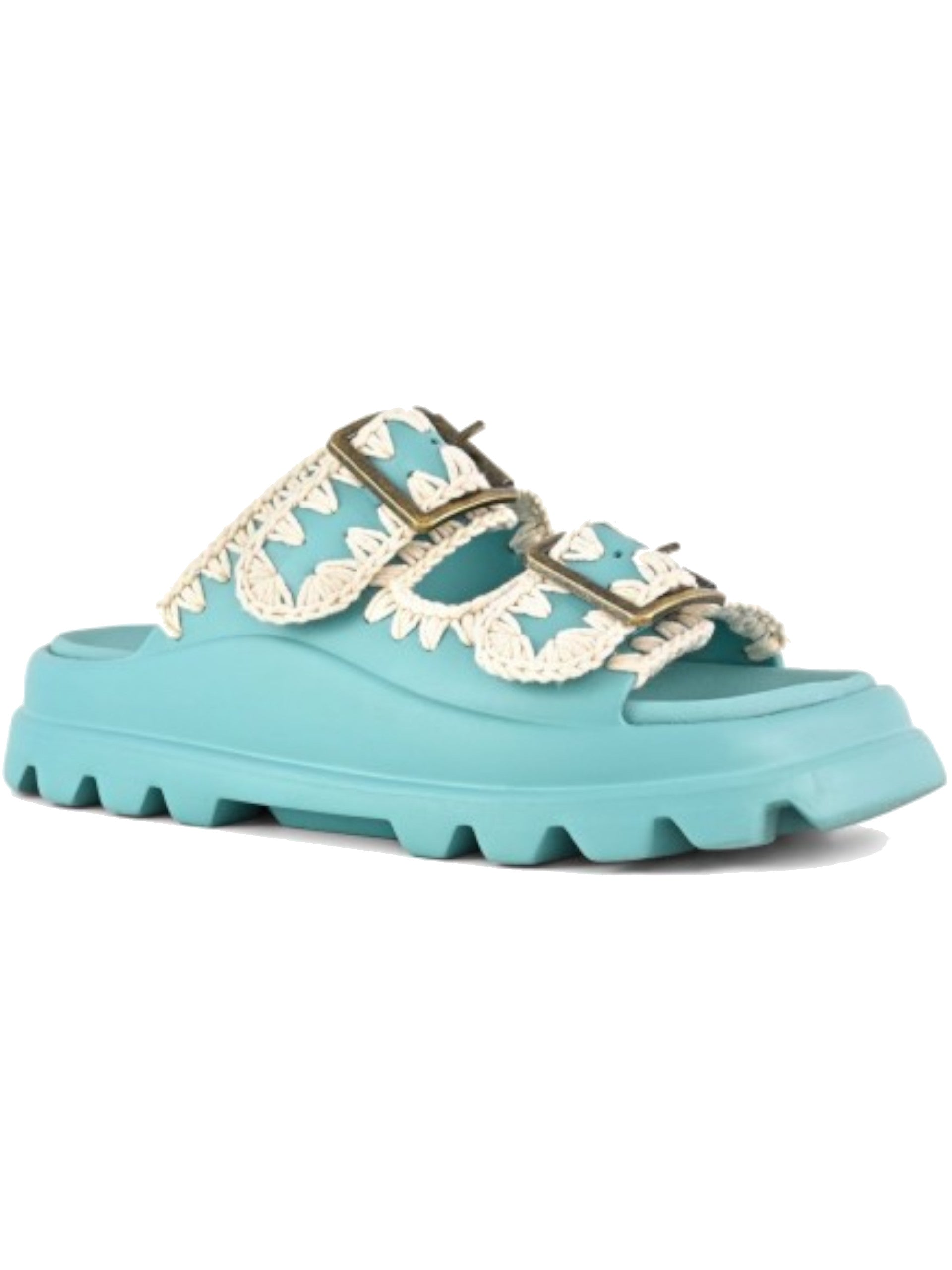 Scarpe Mou celesti Eva One-Piece Slide Two-Buckle in gomma 661001N. Scarpe Mou Ciabatte bio sandal monocromatico presenta due fantastiche fibbie ed è perfetto per uno stile chic, ma semplice, anche in estate. Queste Ciabatte Mou Donna hanno le cuciture all'uncinetto distintive di Mou, la resistente ma leggerissima suola in EVA è rifinita con un plantare imbottito in microsuede per un comfort ancora maggiore.