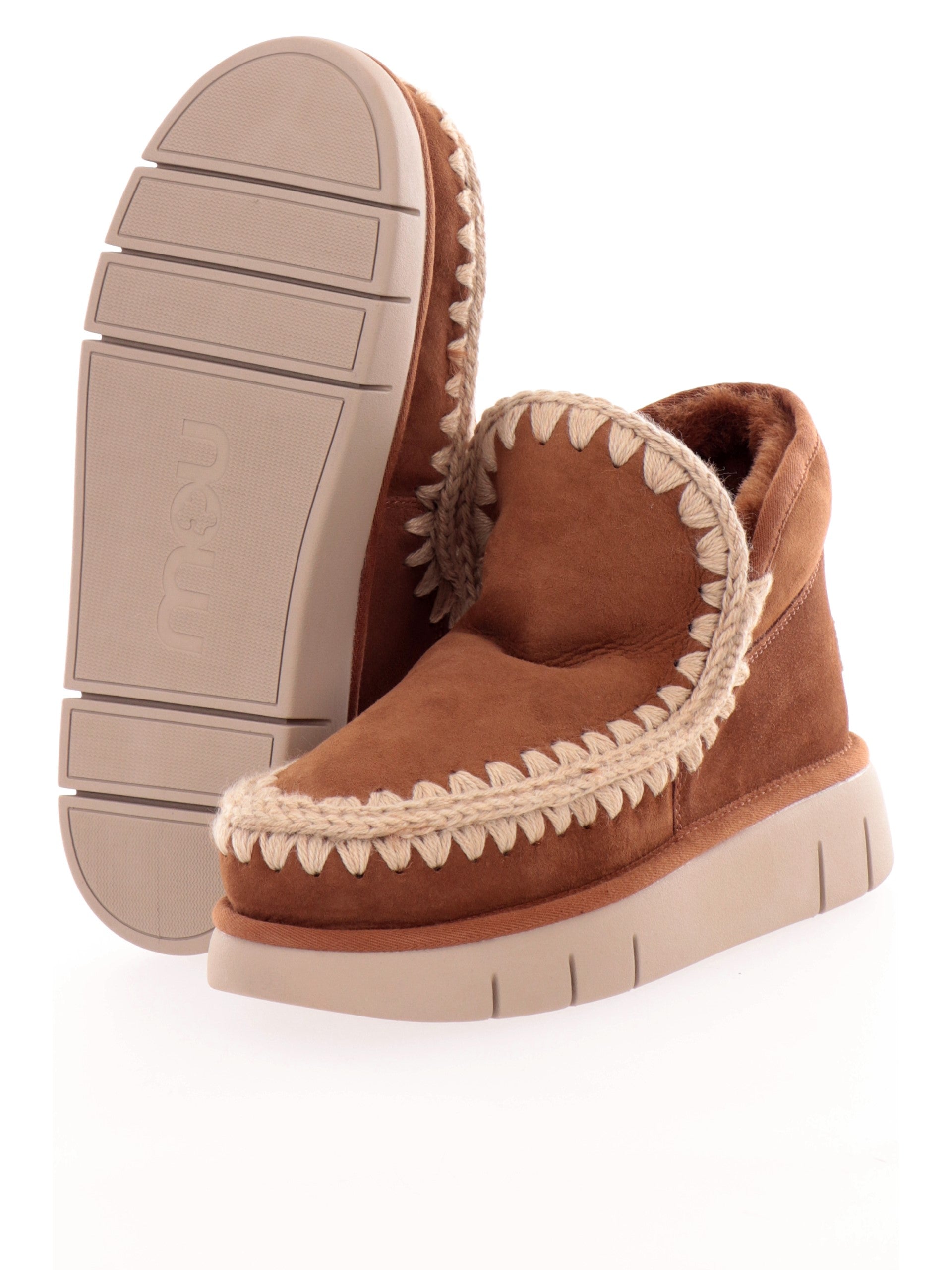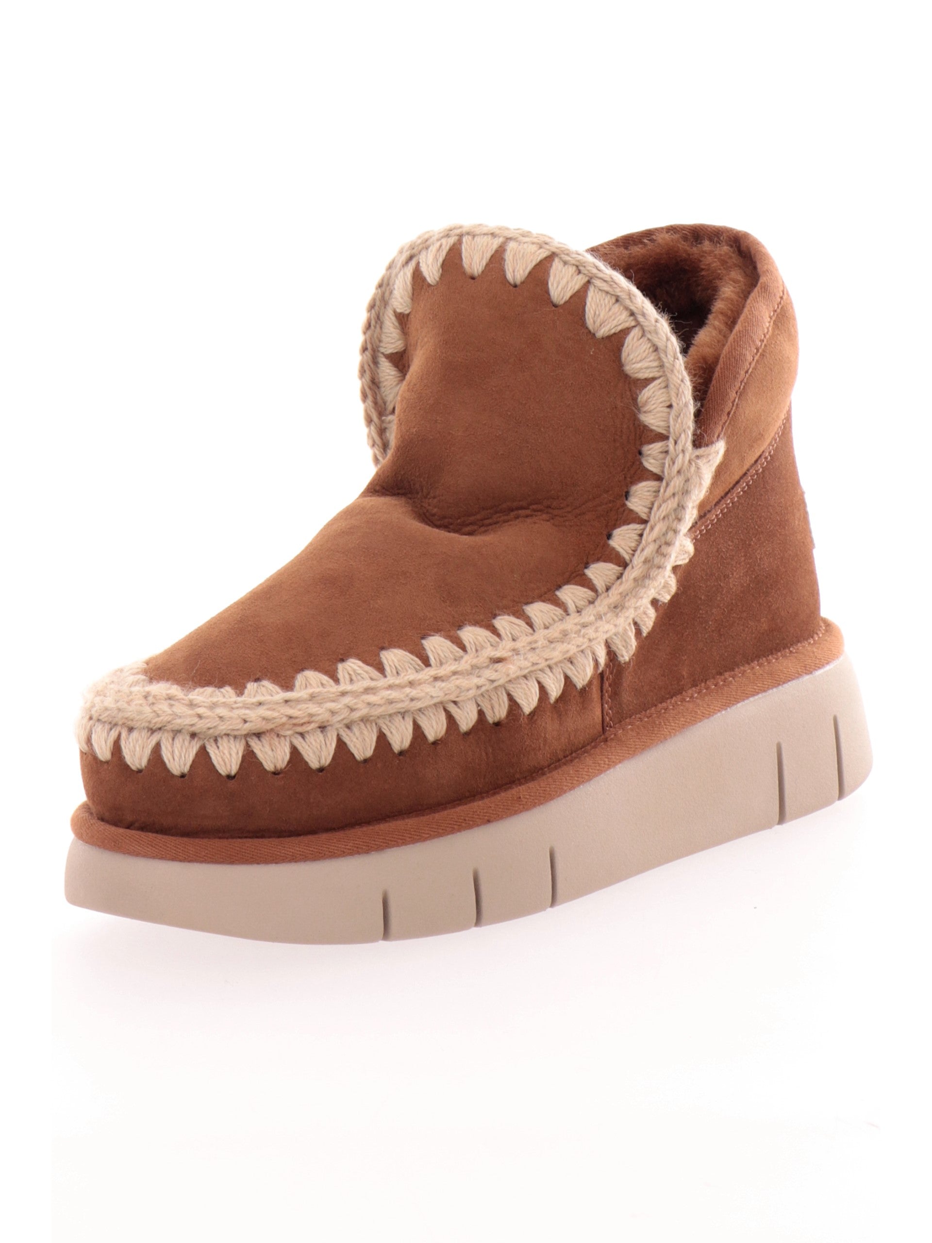 Stivali Mou bounce Eskimo platform FW531009A marroni . Questi stivali Mou marroni platform hanno la tomaia realizzata in 100% pura lana, la suola in gomma per il massimo comfort e la fodera in shearling . Sul davanti di questi stivaletti Mou bassi platform troviamo il patch del brand applicato sulla zona tallonare a contrasto colore.