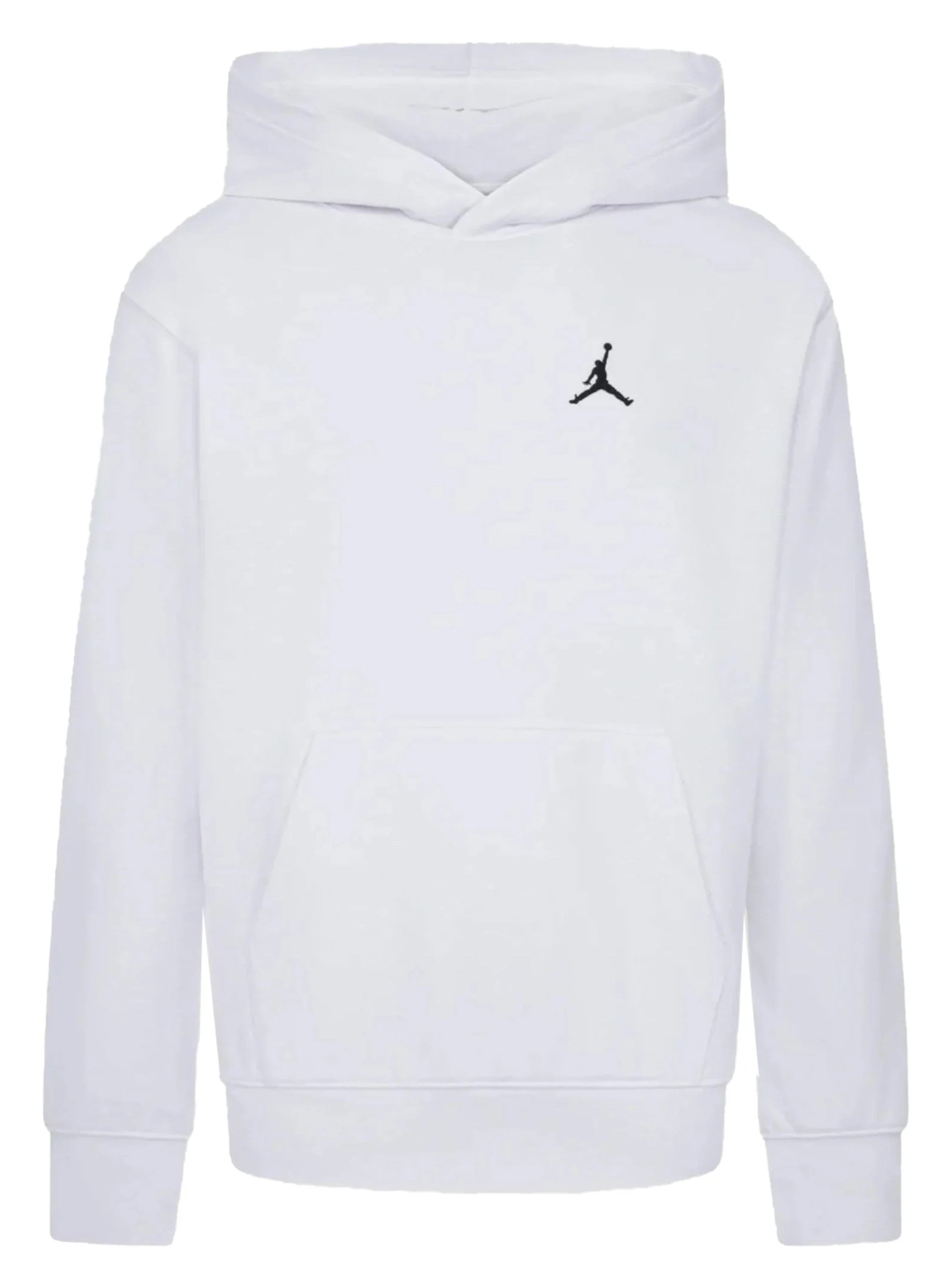 Felpa Jordan bianca da bambino con cappuccio e logo ricamato 95F121, realizzata in cotone garzato. Questa felpa Jordan bambino ha il cappuccio fisso, una comoda tasca a marsupio e il logo Jordan ricamato lato cuore a contrasto colore.