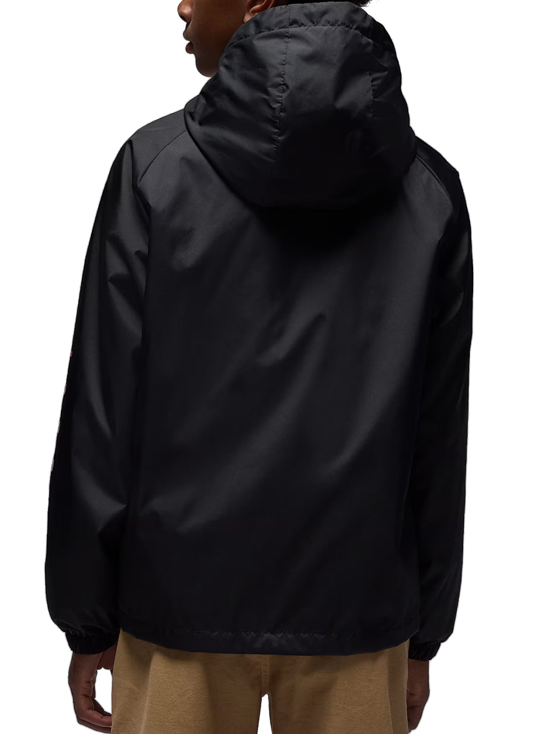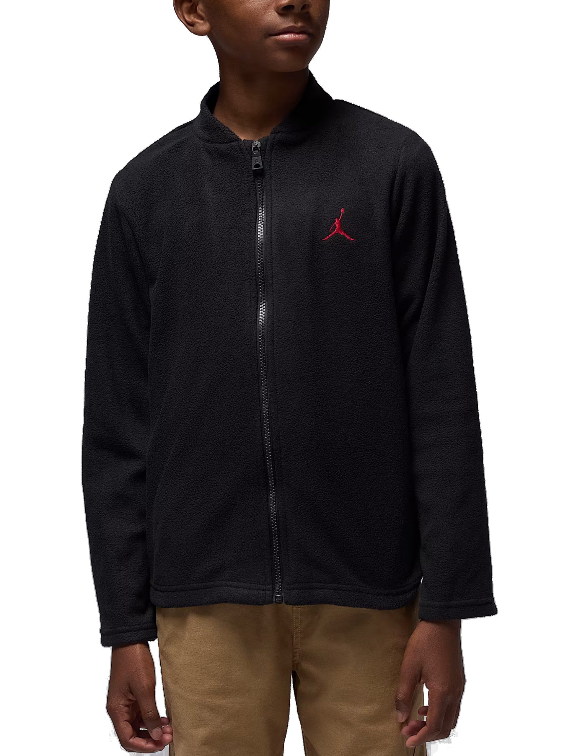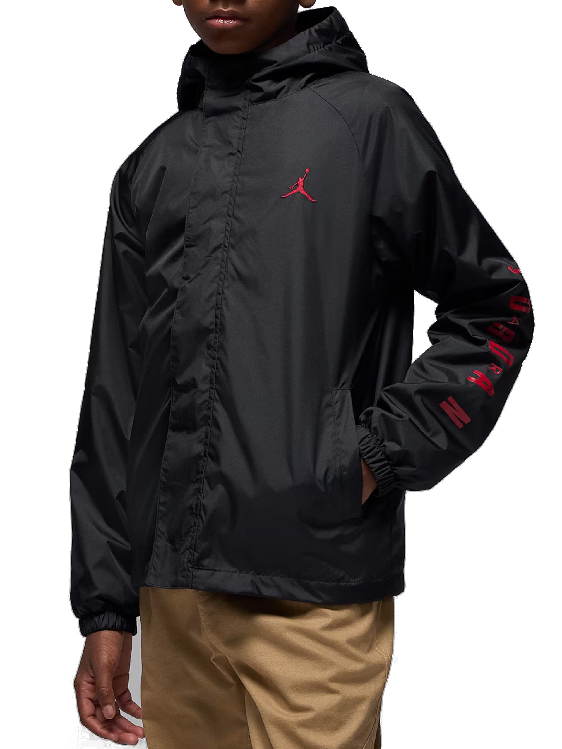 Giacca Jordan nera da bambino System Jacket tessuto tecnico, antivento. All'interno di questa giacca troviamo un pile con zip che si può togliere. La giacca è caratterizzata da due tasche laterali aperte, cappuccio, stampa rossa sul lato sinistro e con la chiusura zip