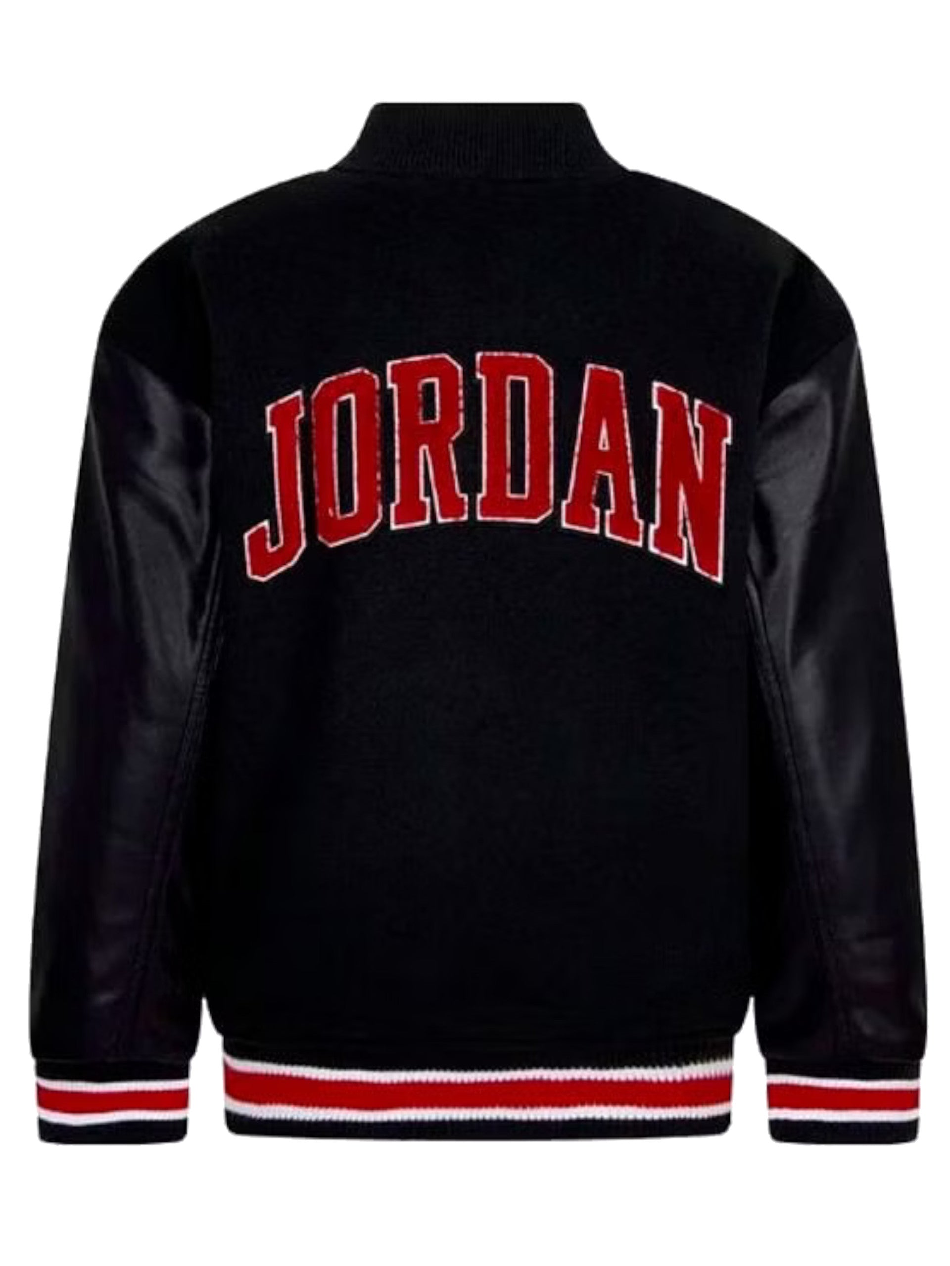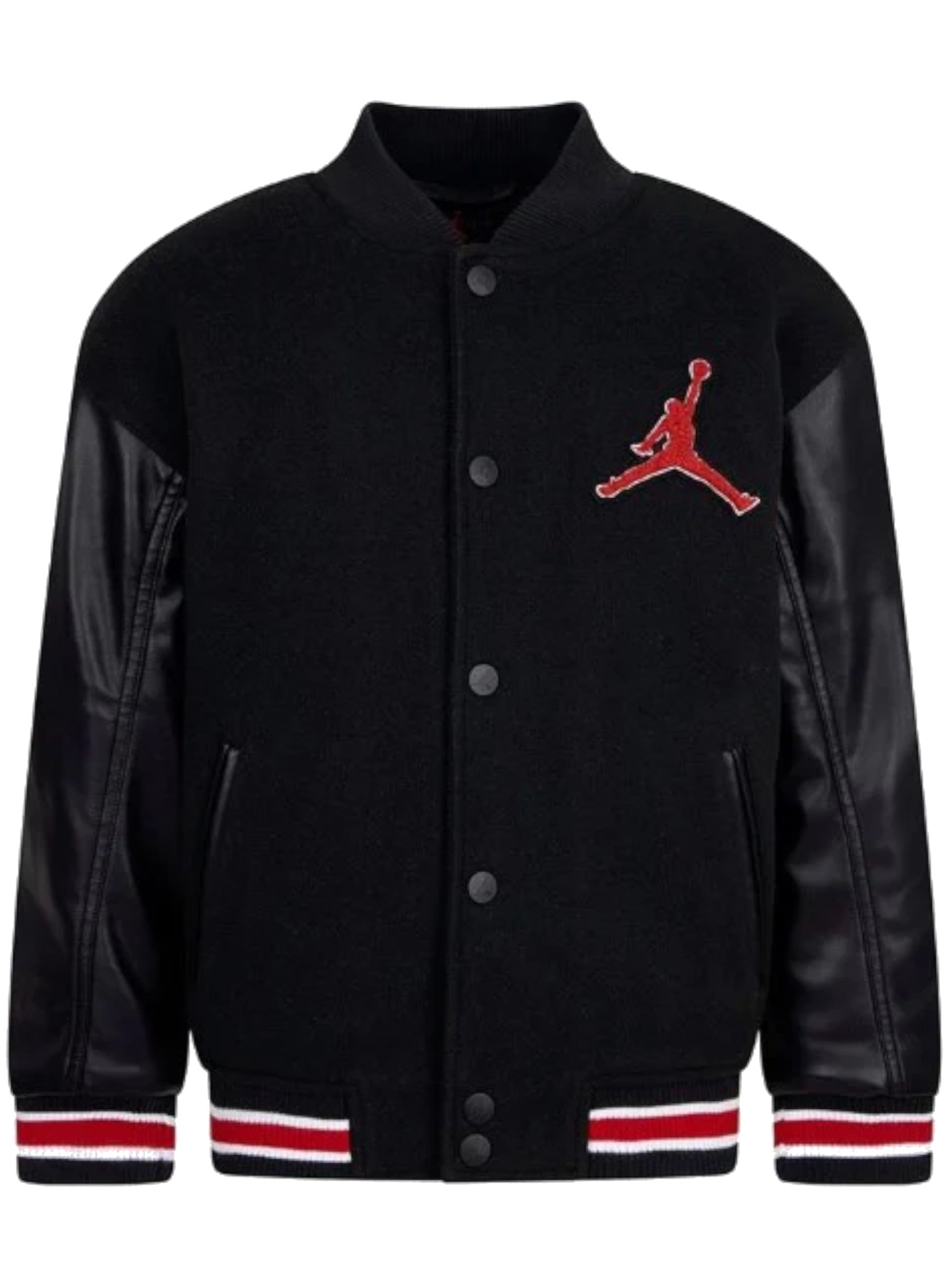 Giacca Jordan nera Varsity da bambino bottoni automatici 95D197. Questo giubbino Jordan nero Americano ha la chiusura con bottoni automatici, due tasche laterali aperte, il patch del brand applicato sul cuore a contrasto colore, polsini e fondo elasticizzati a costine.