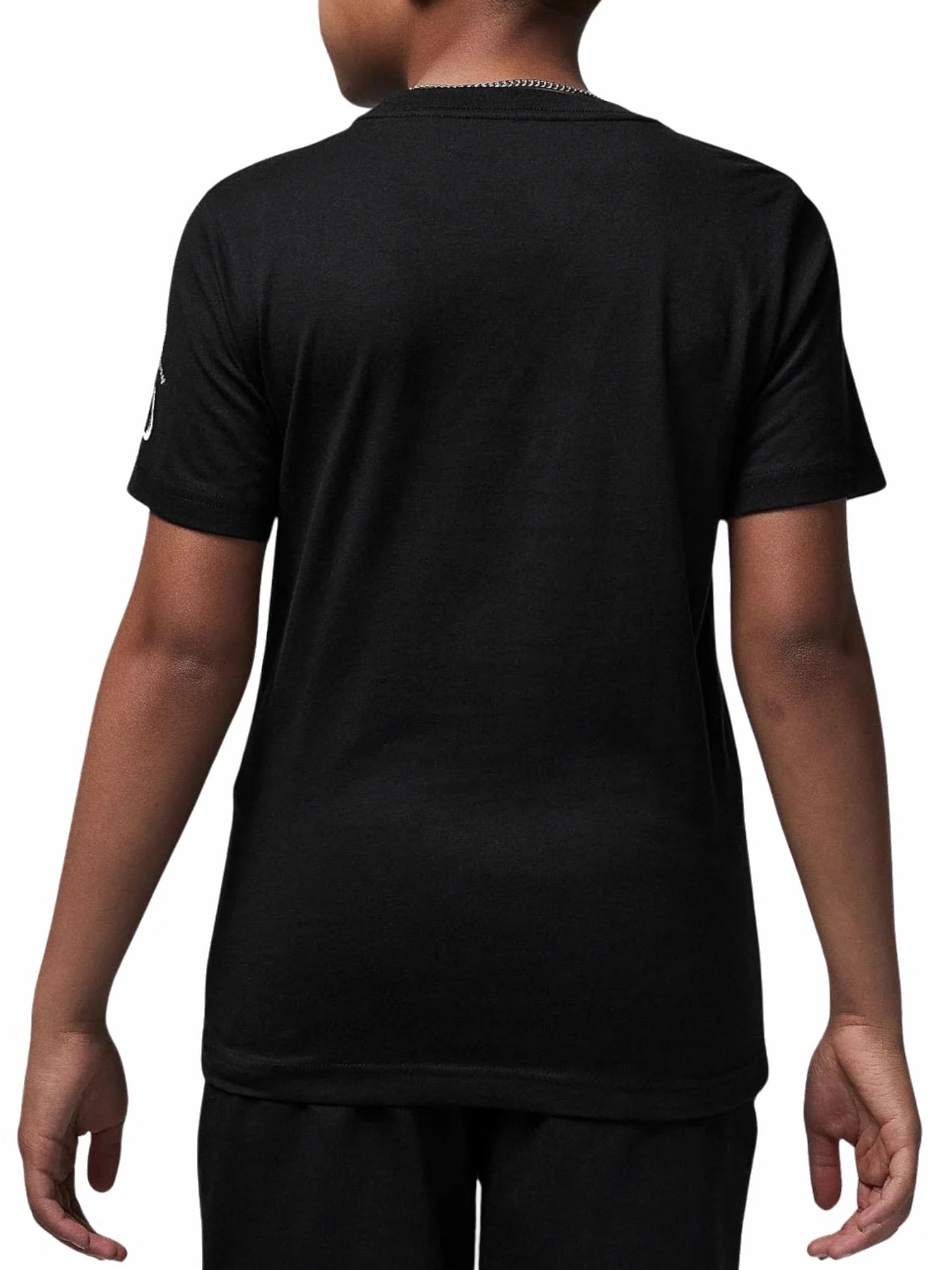 Maglia Jordan nera da bambino con stampa e logo ricamato 95F052. Questa t-shirt Jordan girocollo ha le maniche corte (una con logo Jordan ricamato) e la stampa del brand sul davanti.