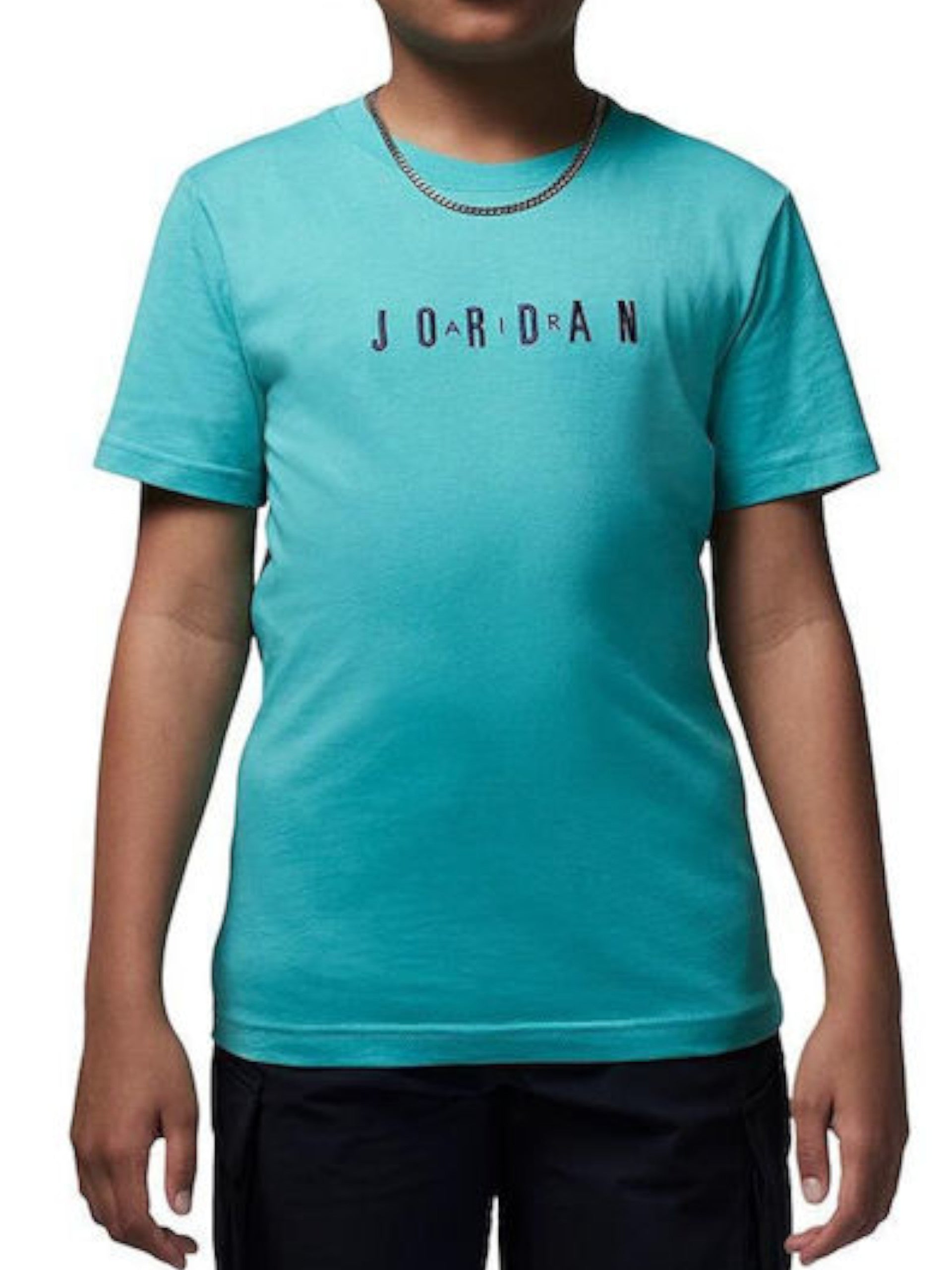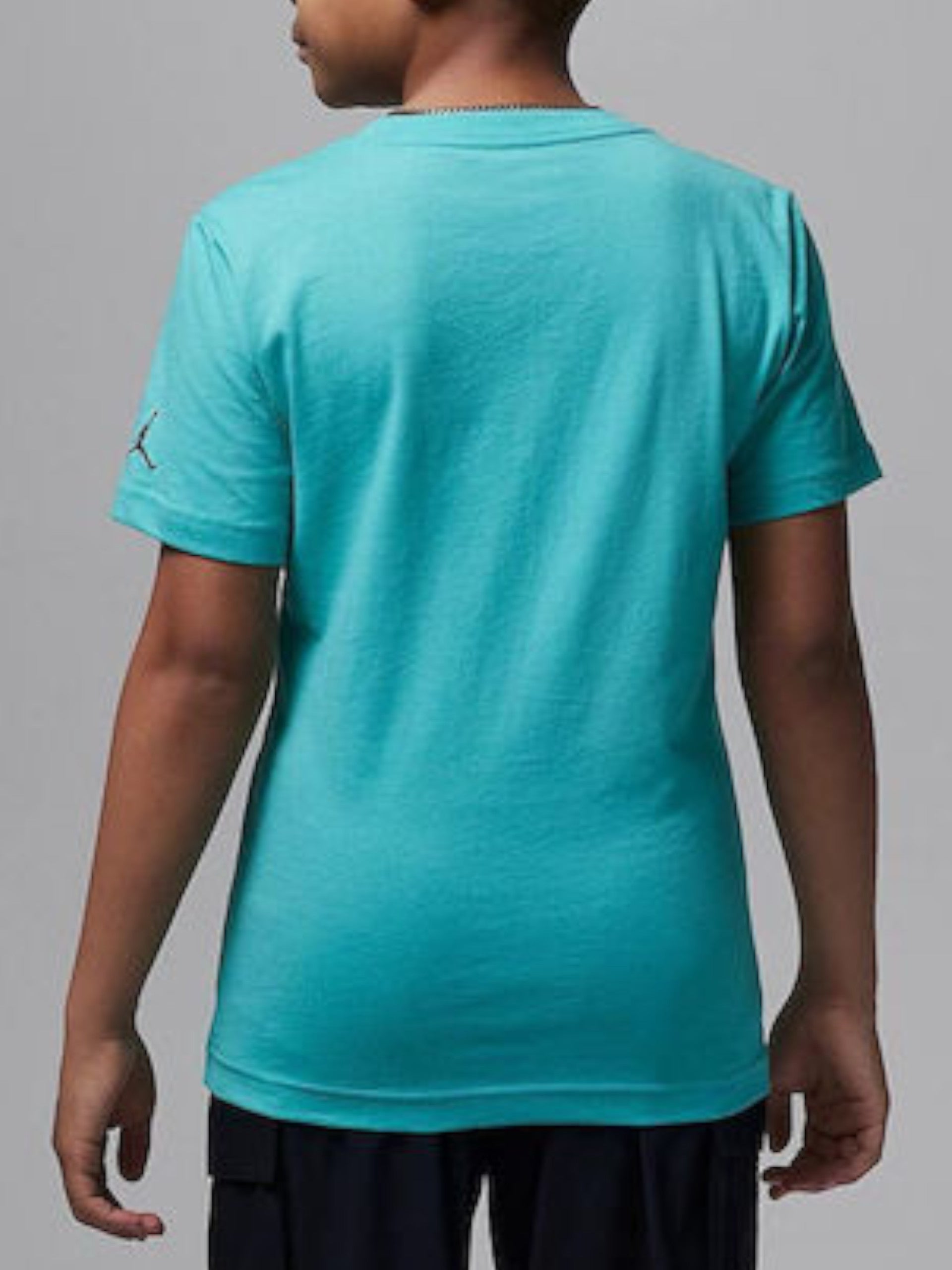 Maglia Jordan verde acqua da bambino con logo ricamato 85D634. Questa t-shirt Jordan girocollo ha le maniche corte e il logo Jordan ricamato sul davanti.