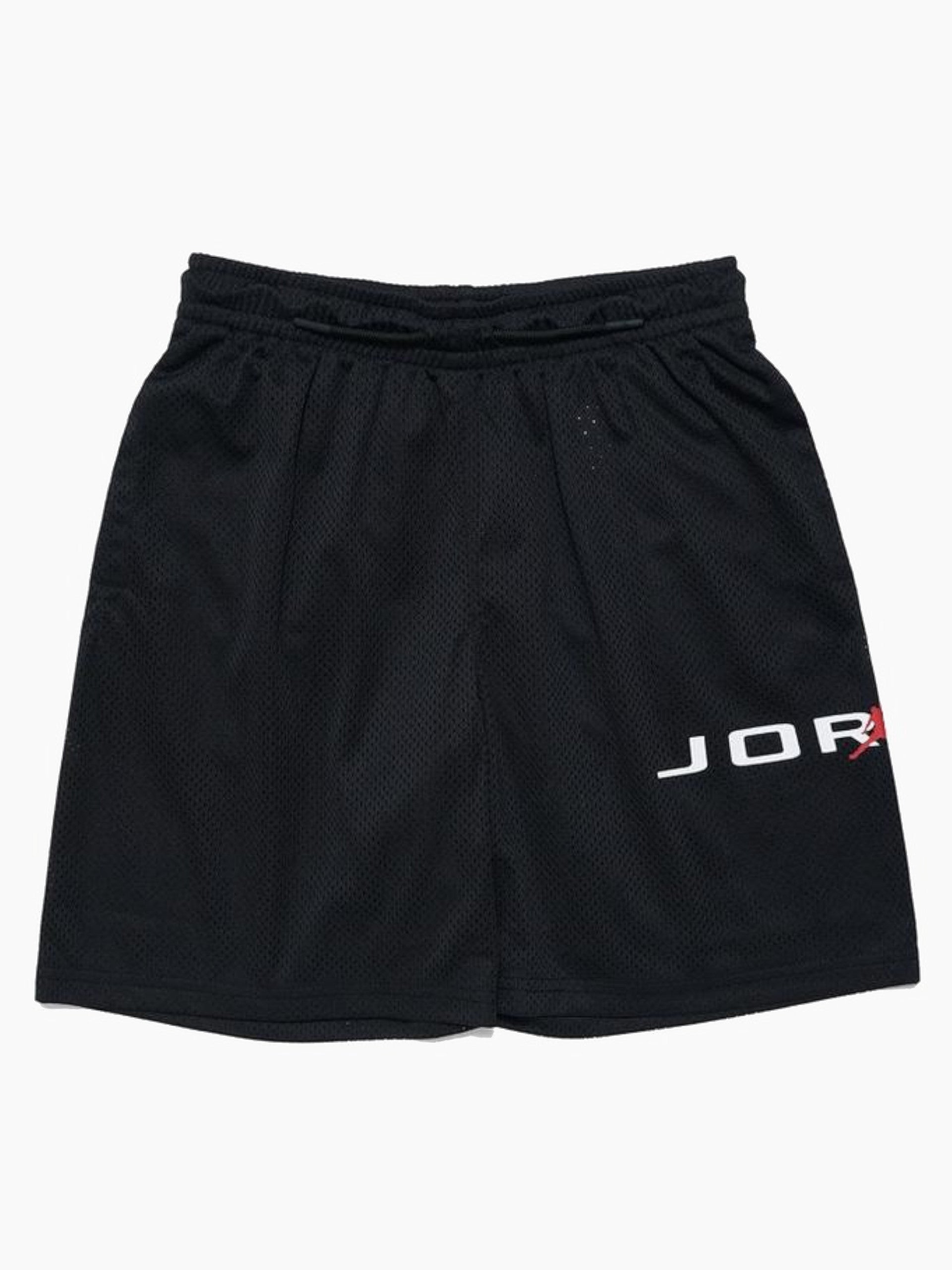 Pantaloncini Jordan neri da bambino tessuto tecnico traspirante 95D667. Questi bermuda Jordan neri hanno la banda elastica sul punto vita regolabile con laccetti, due tasche laterali aperte e il logoJordan applicato sul fondo a contrasto colore.