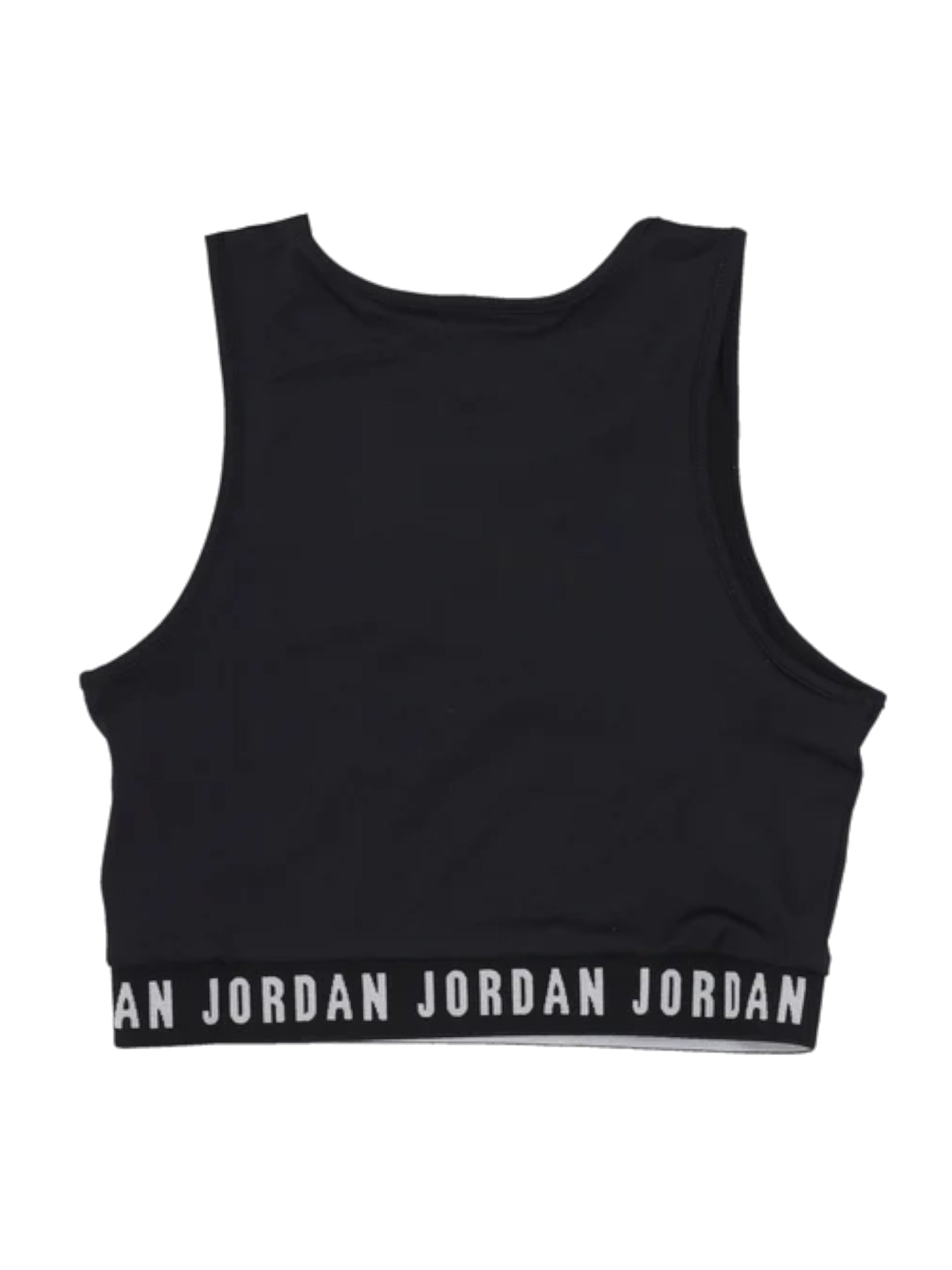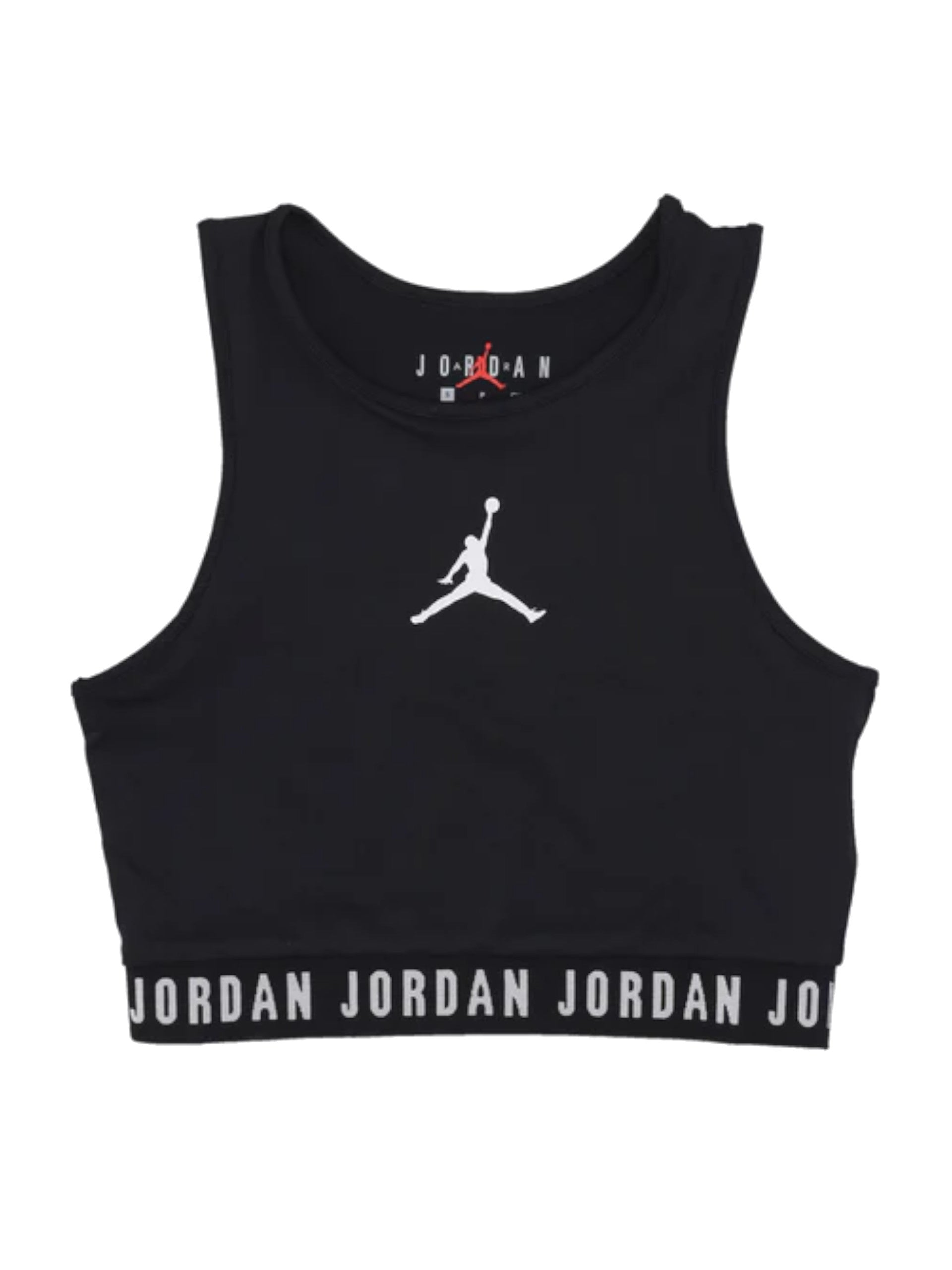Top Jordan nero da bambina con banda logata 45A855, realizzato in tessuto tecnico traspirante. Questa canotta Jordan bambina è caratterizzata dal Jumpman stampato lato cuore e dalla banda Jordan logata sul fondo.