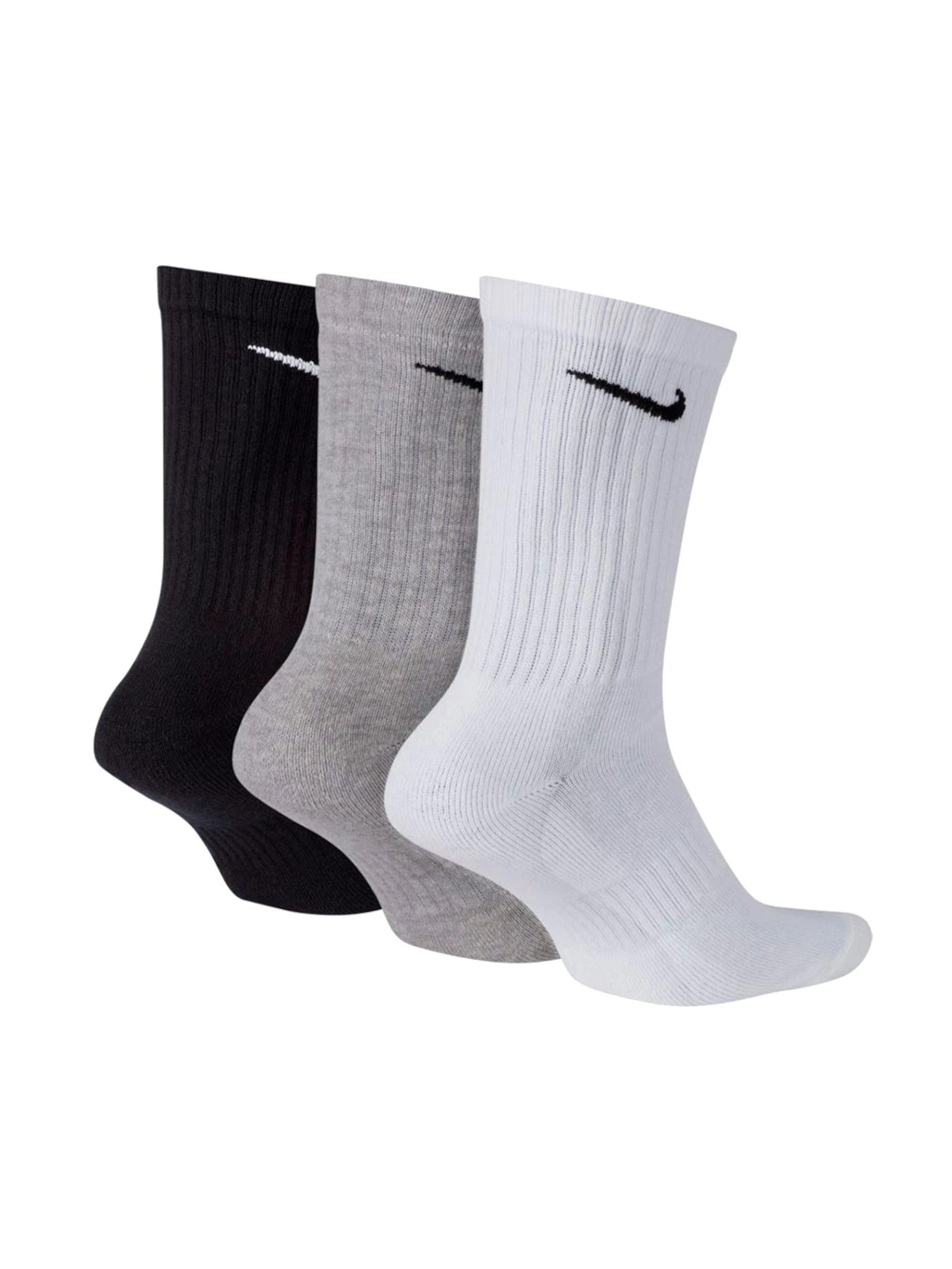 Calzini Nike bianchi, neri e grigi Basic UN0027. Questo set di calzini Nike Bambino si compone di tre paia di calzini tutti con logo Nike a contrasto colore.