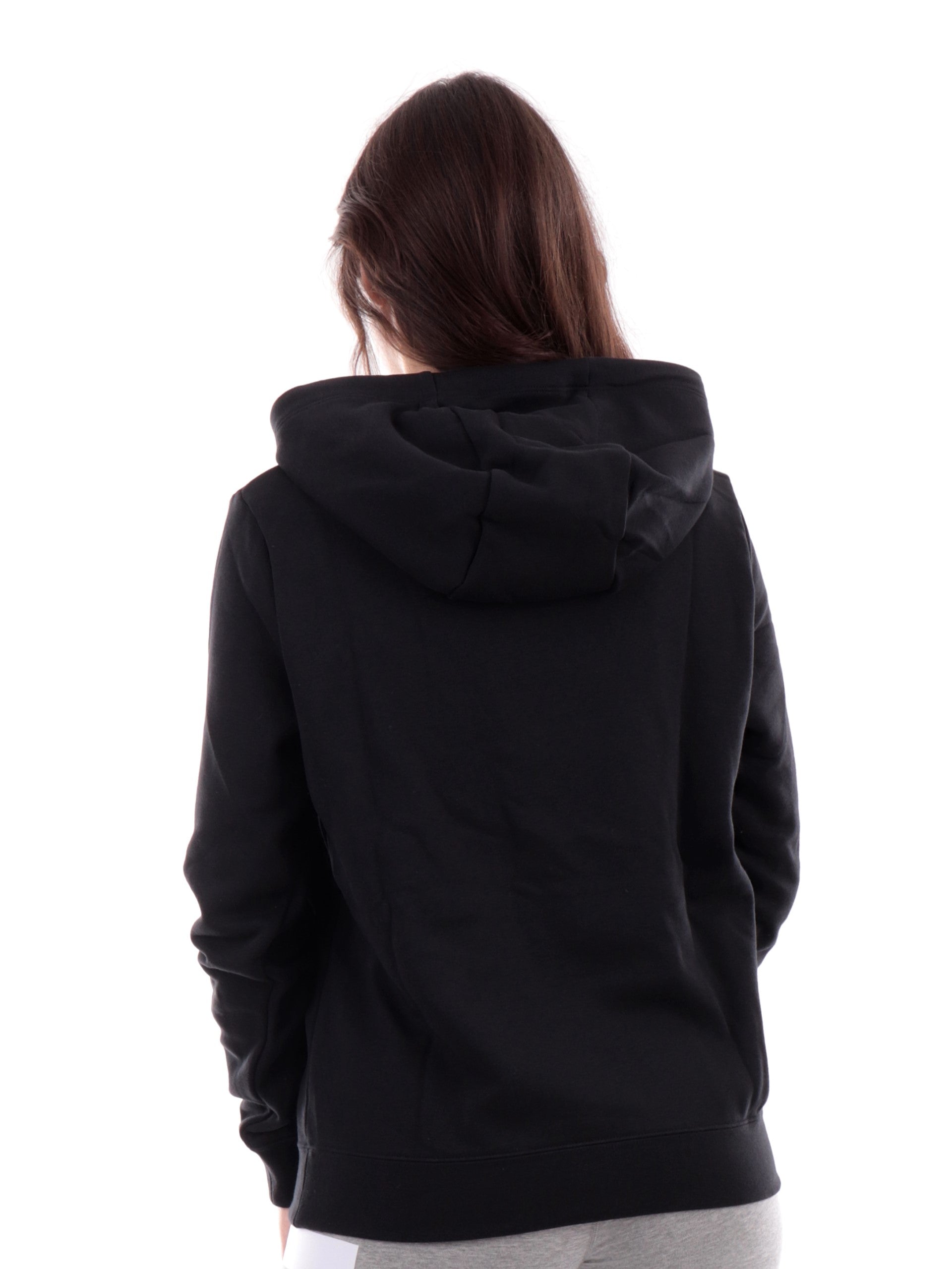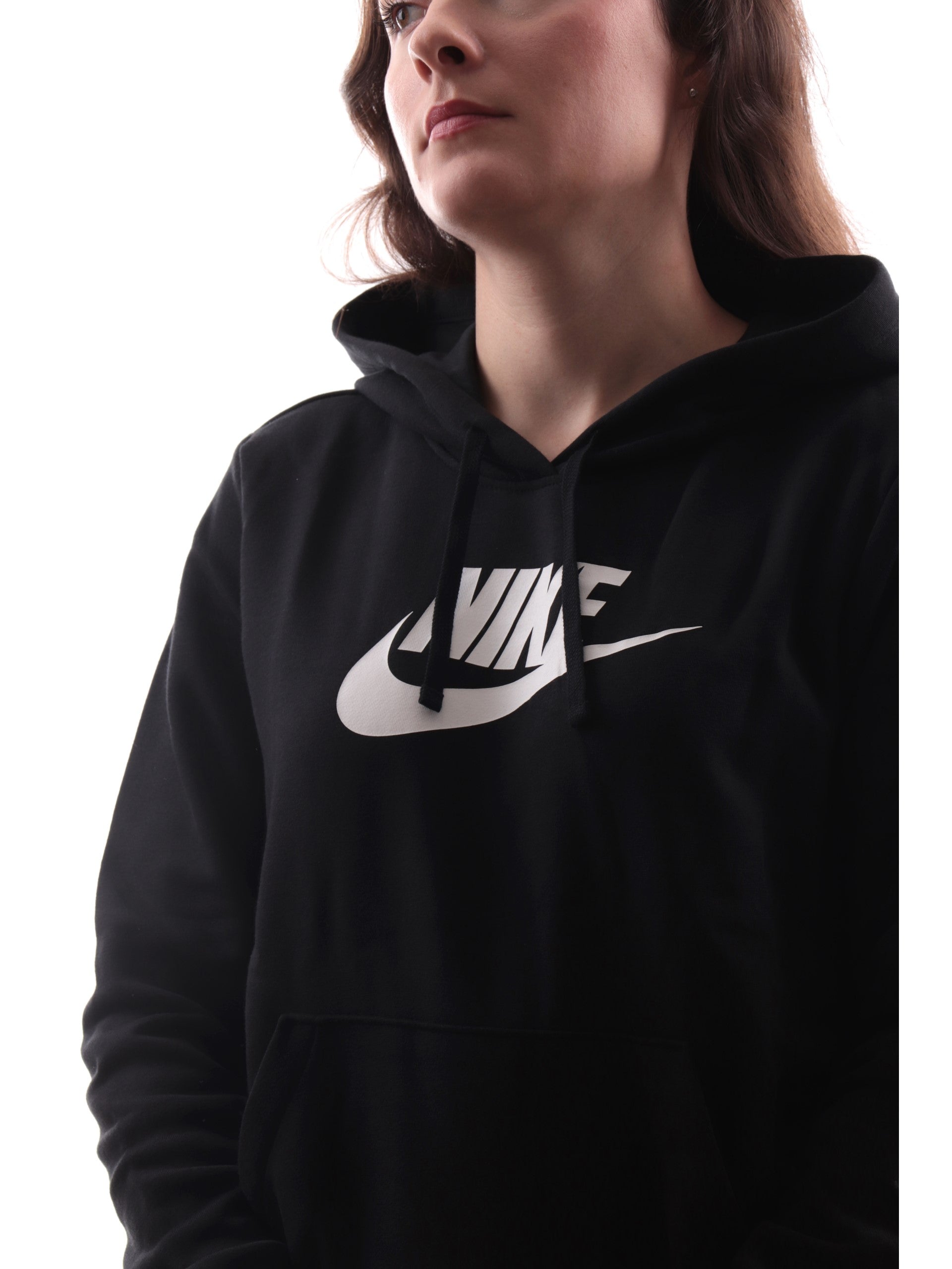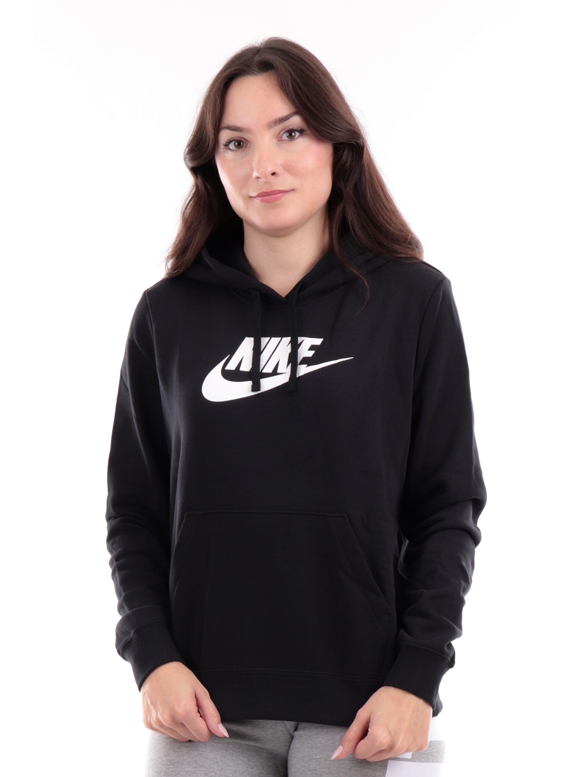 Felpa Nike nera da donna realizzata in morbido cotone. Questa felpa Nike nera ha il cappuccio fisso regolabile con laccetti, la maxi stampa del brand sul davanti a contrasto colore, la tasca a marsupio, i polsini e il fondo elasticizzati.
