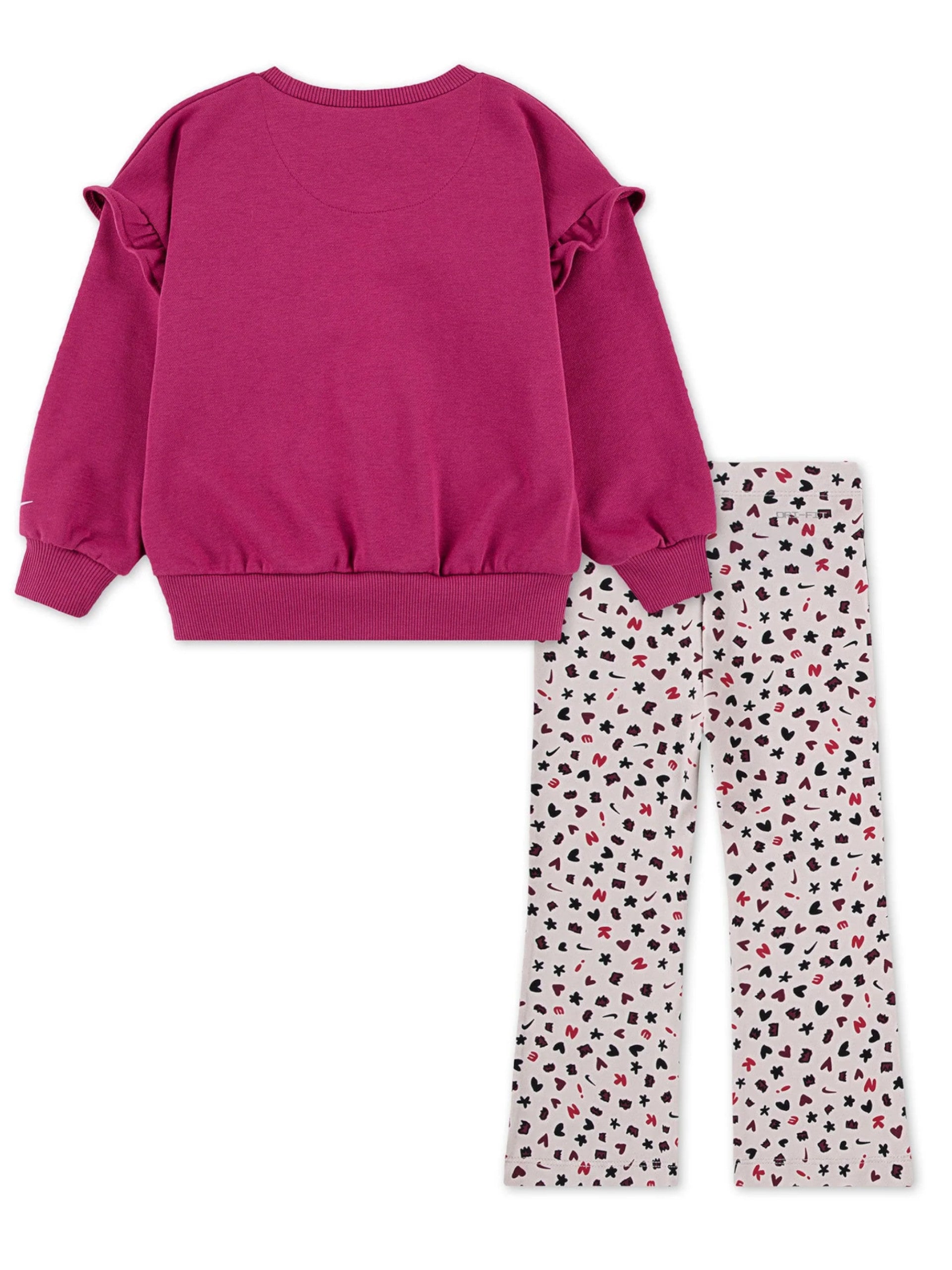 Tuta Nike bambina con leggins a zampa a fantasia e felpa girocollo fucsia lampone con logo grafico stampato lato cuore . Questo set Nike bambina è composto da una felpa in cotone garzato e una tuta leggins a zampa stampati.