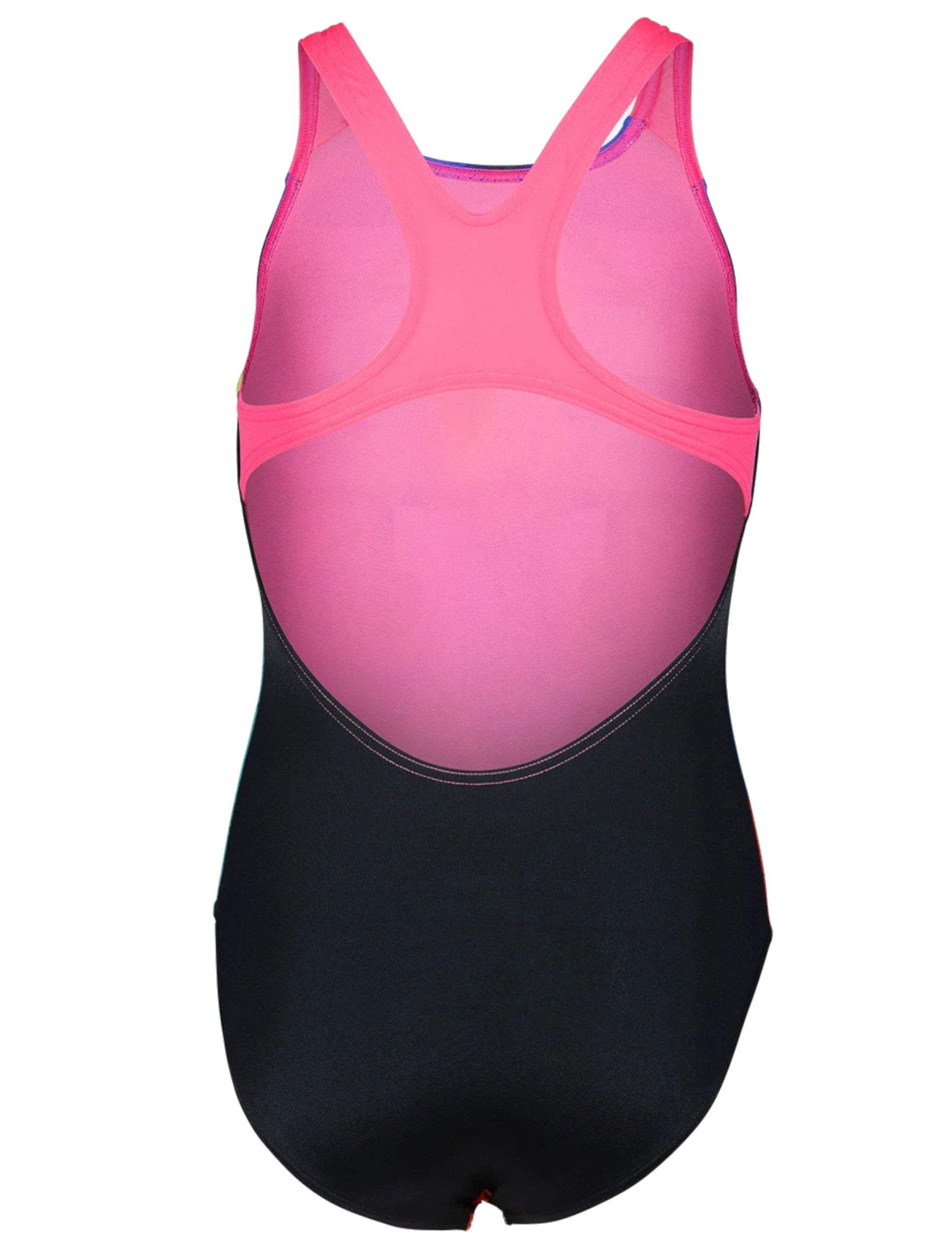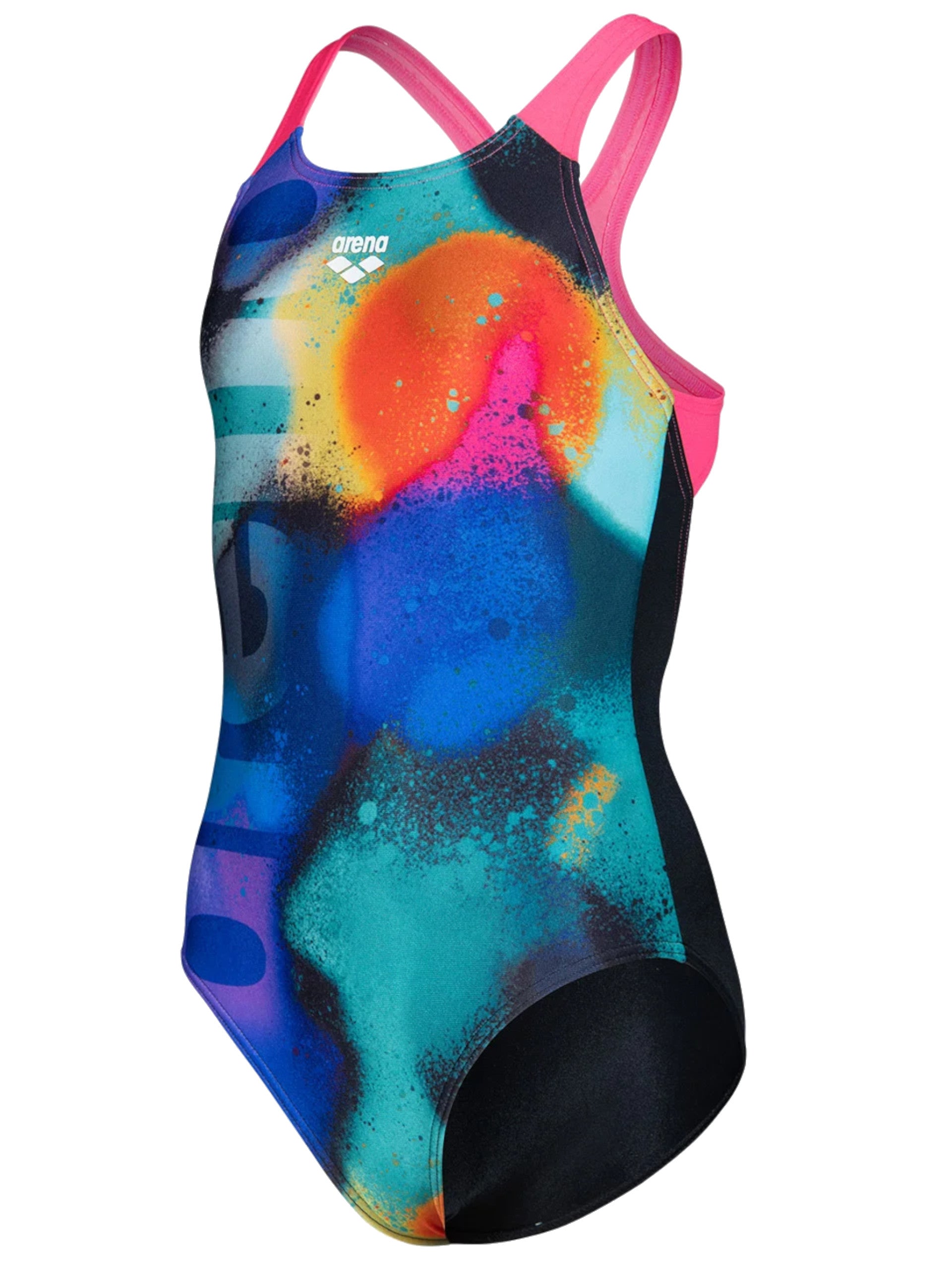 Costume Intero Arena bambina multicolore Spray Paint Swimsuit swim. Questo costume Arena da bambina è caratterizzato da un maxi logo laterale, il logo del brand sul davanti a contrasto colore, bretelle larghe e fisse e la fantasia multicolore. Questo costume realizzato in un tessuto tecnico resistente al cloro di arena, realizzato in parte con materiali riciclati. La vestibilità Swim Pro offre sostegno extra e massima libertà di movimento. il tessuto MaxLife Eco offre la massima resistenza al cloro assicurandoti che il costume da bagno durerà a lungo.