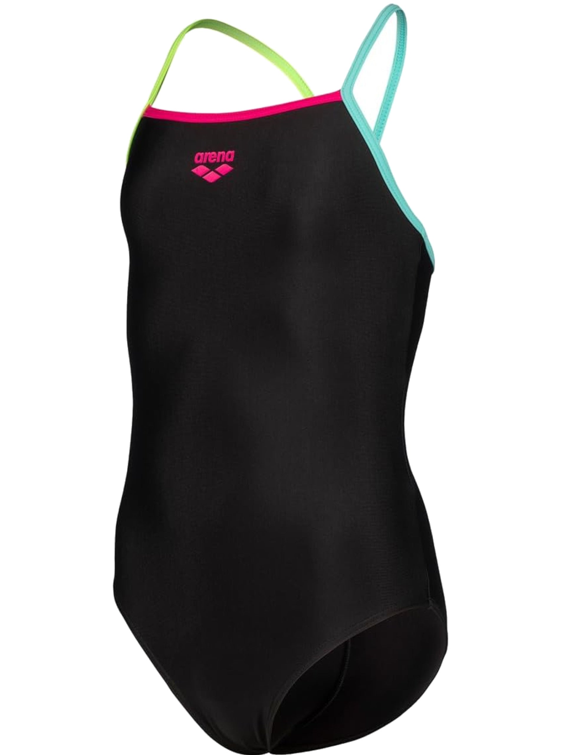Costume Intero Arena bambina nero Swimsuit Light Drop Solid. Questo costume Arena ha il logo del brand sul davanti a contrasto e le bretelle bicolore fisse. Questo costume Arena intero da bambina è realizzato con un tessuto incredibilmente morbido, il tessuto in fibra Repreve è resistente al cloro, ed è estremamente elastico