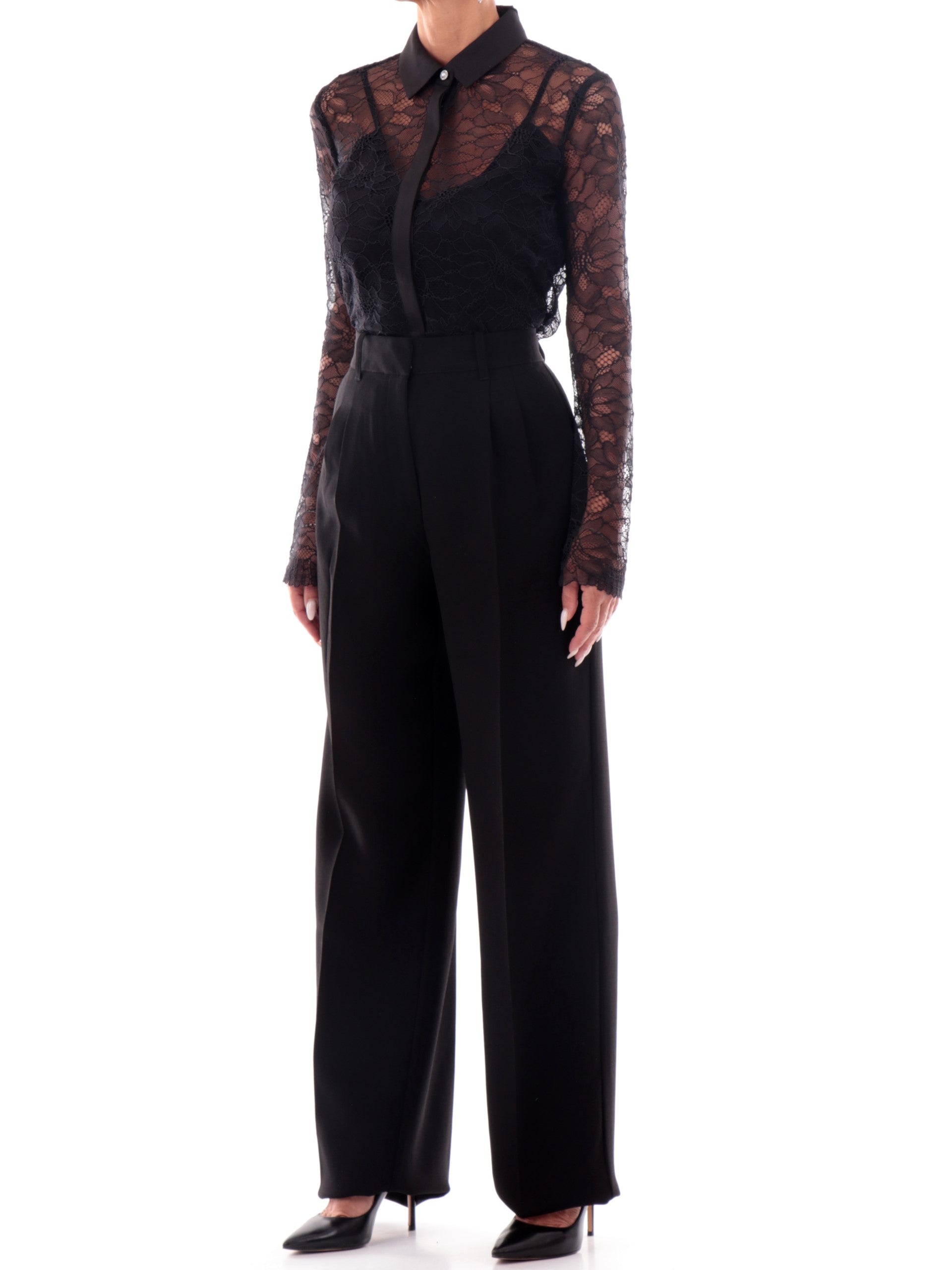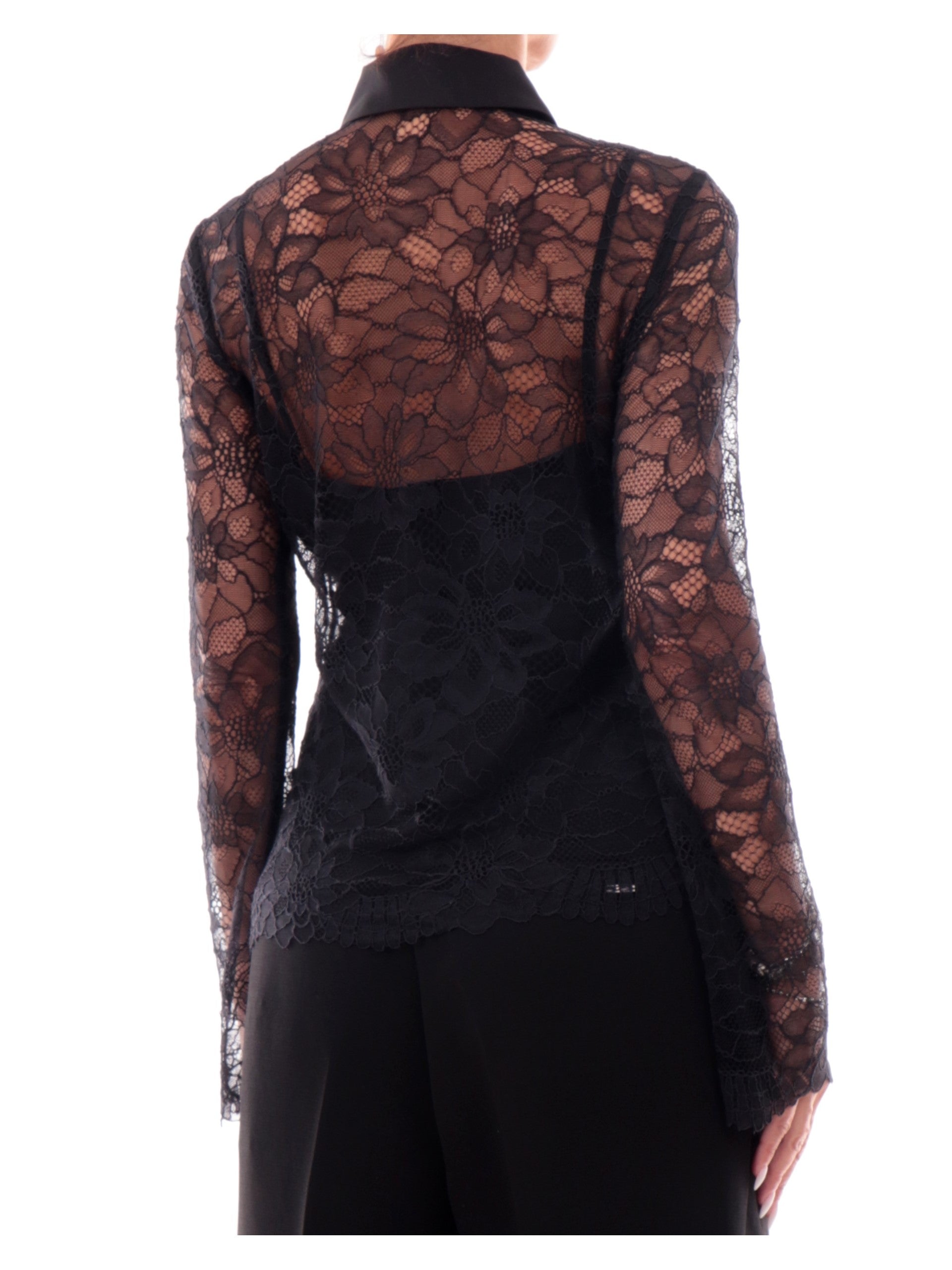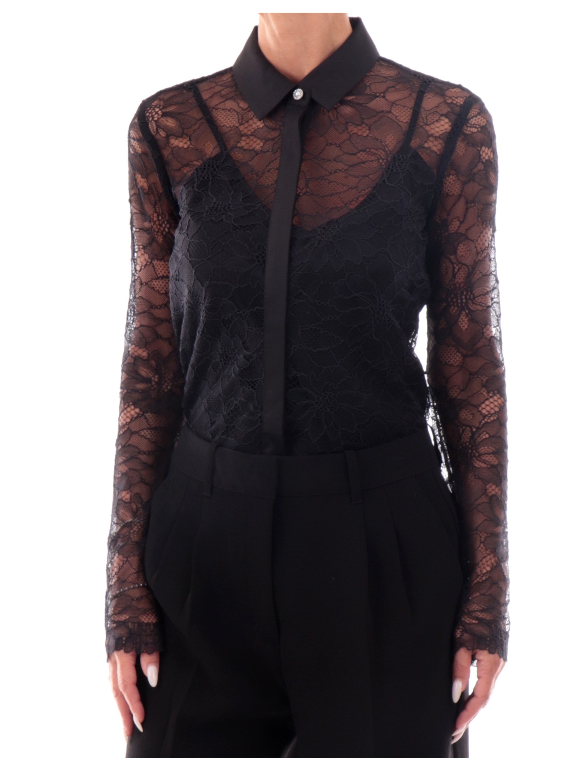 Camicia Guess Donna realizzata in elegante pizzo nero con colletto e copribottoni in raso. La camicia pizzo Guess ha un elegante top Guess sottogiacca in raso con spalline bralette da utilizzare anche in altri outfit.