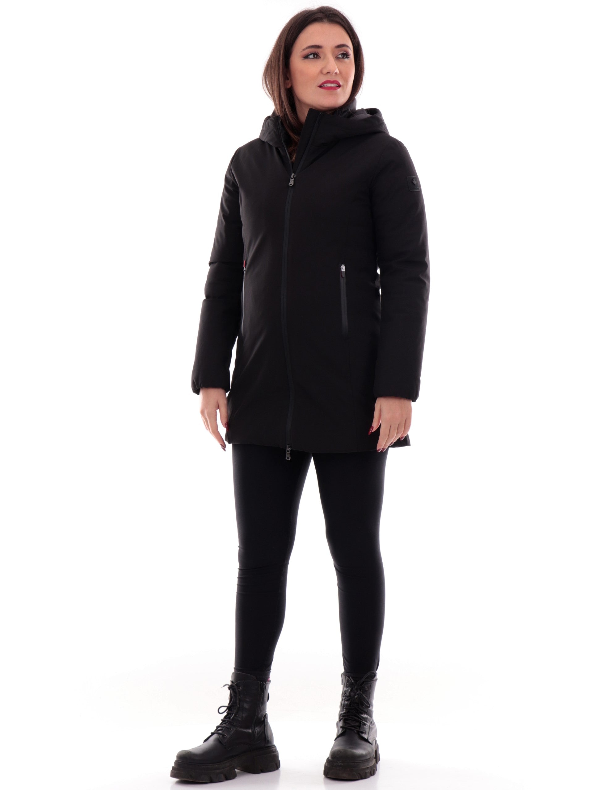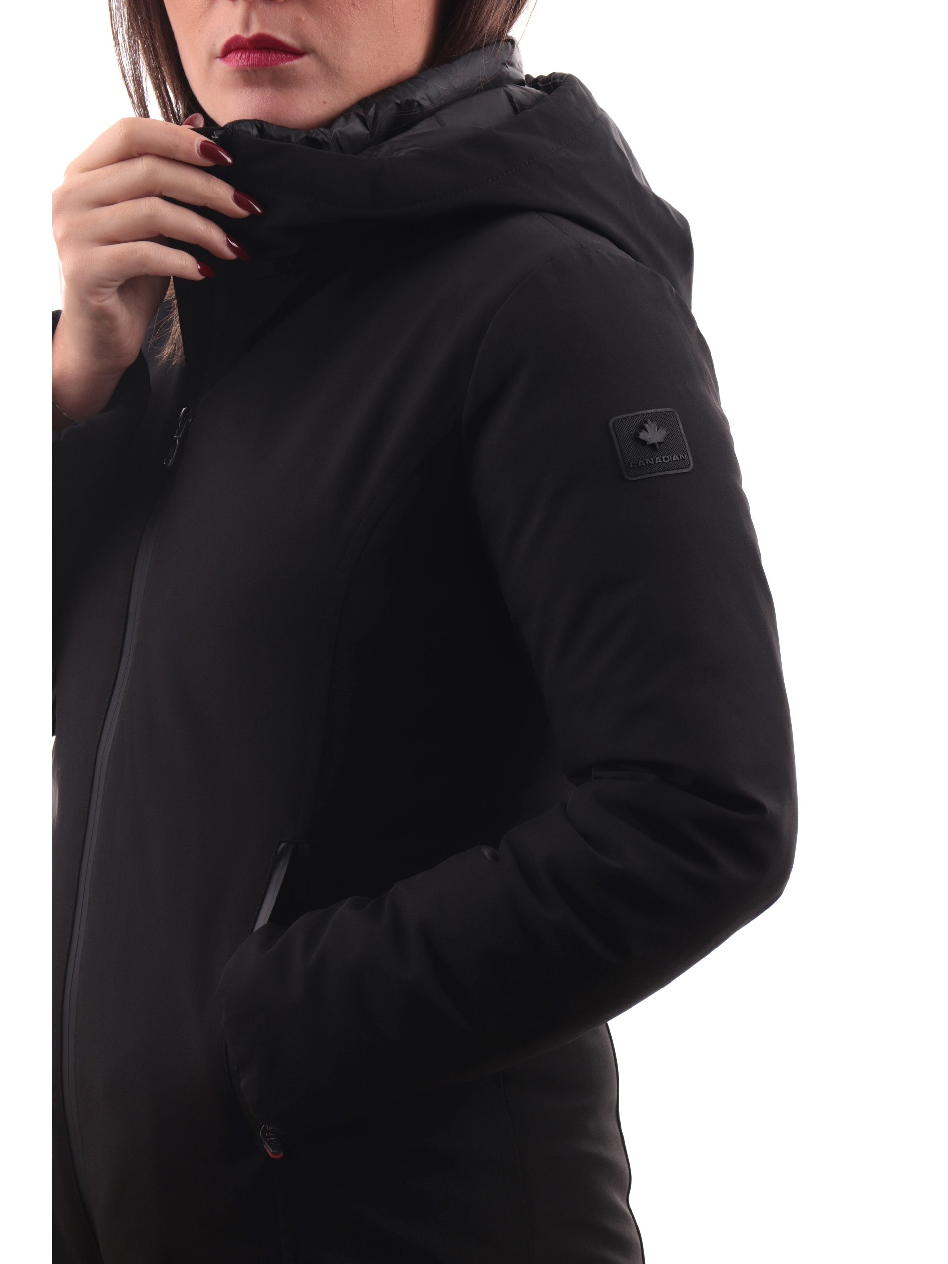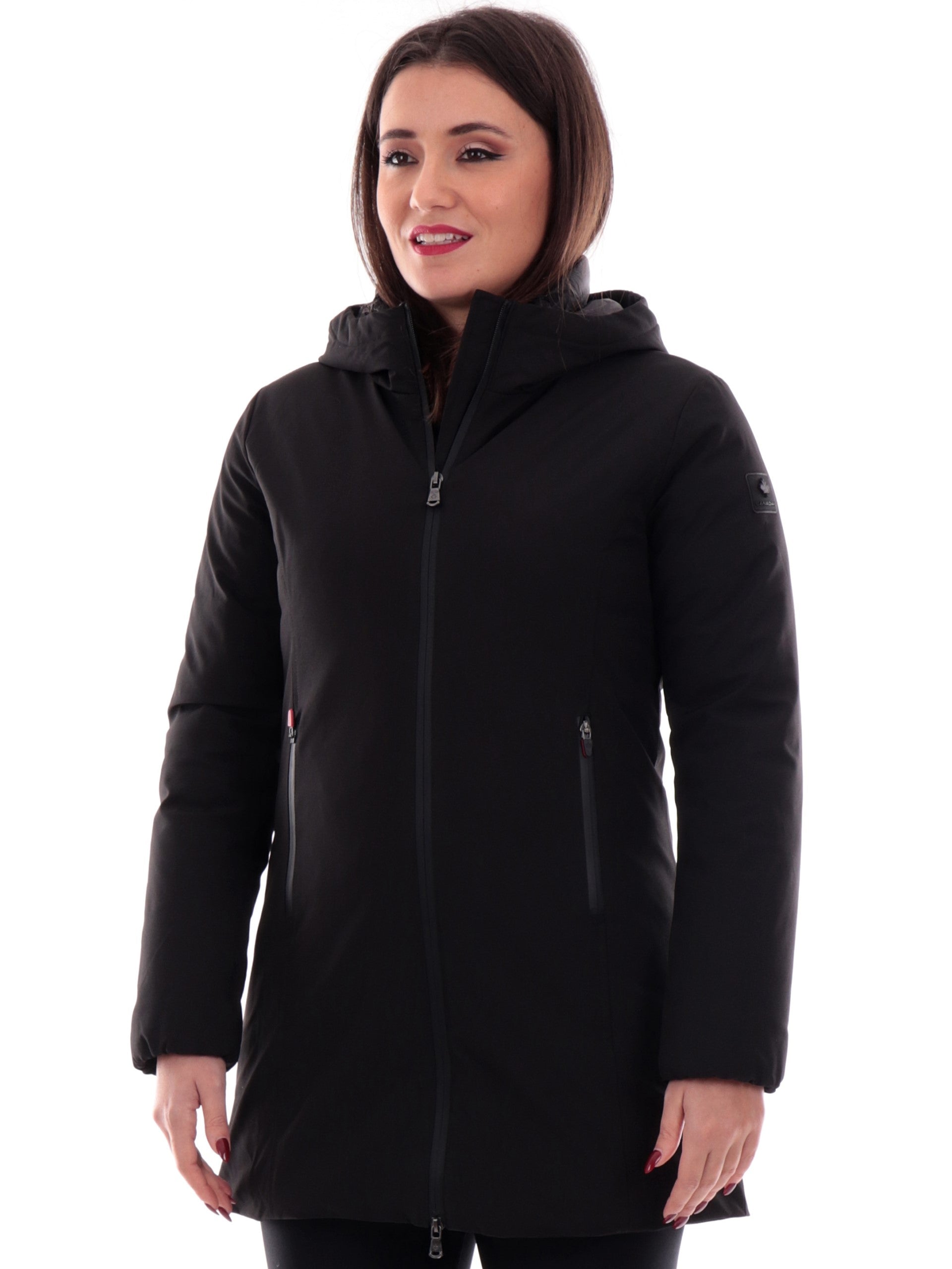 Cappotto Canadian nero Yorkton Long 4 da donna tessuto tecnico G224381WLG, realizzata con imbottitura eco-friendly. Questa giacca lunga Canadian nera ha il cappuccio fisso, la chiusura full zip centrale, due tasche laterali termonastrate, il patch del brand applicato sulla manica sinistra a contrasto colore e polsini elasticizzati.