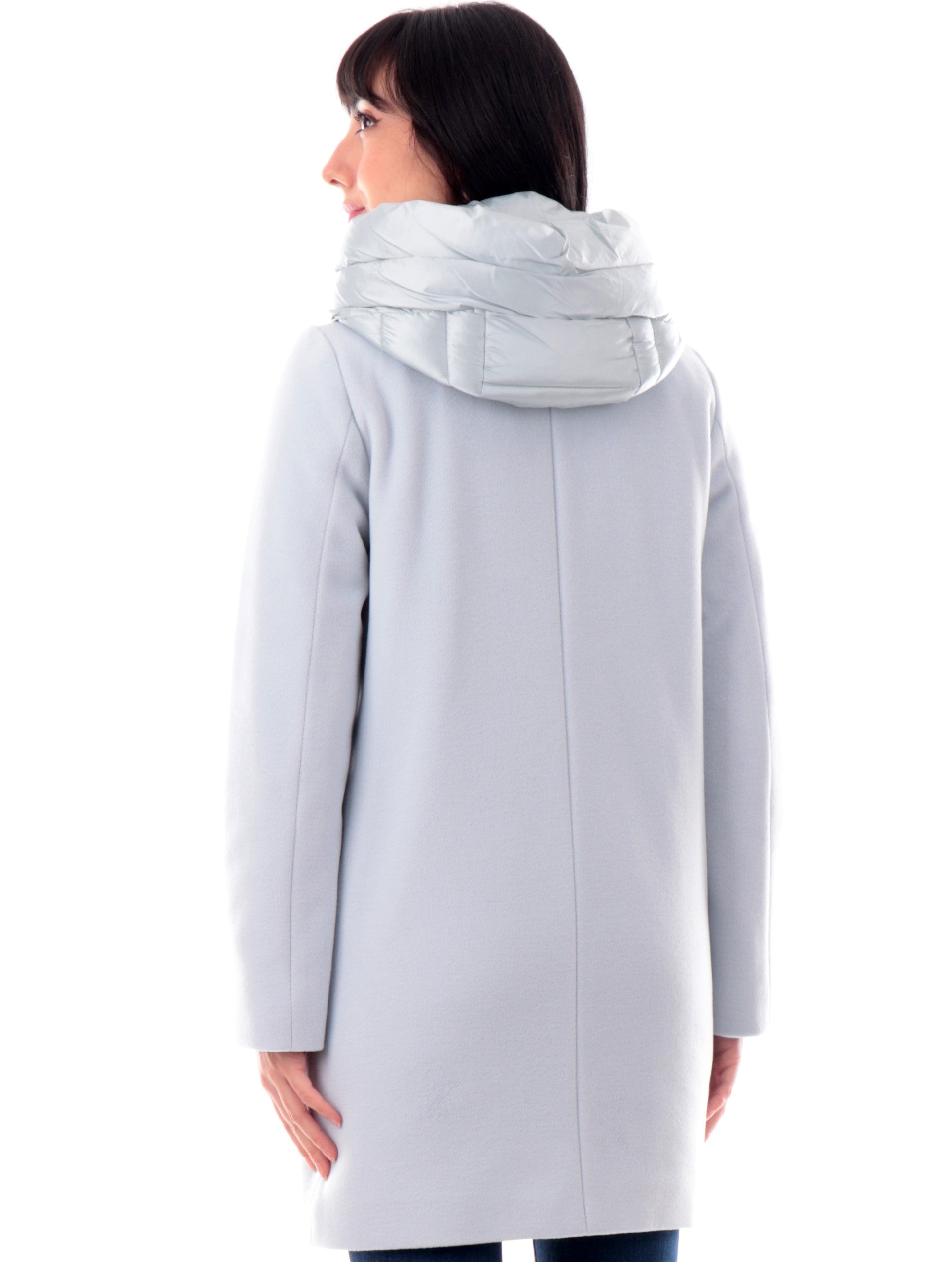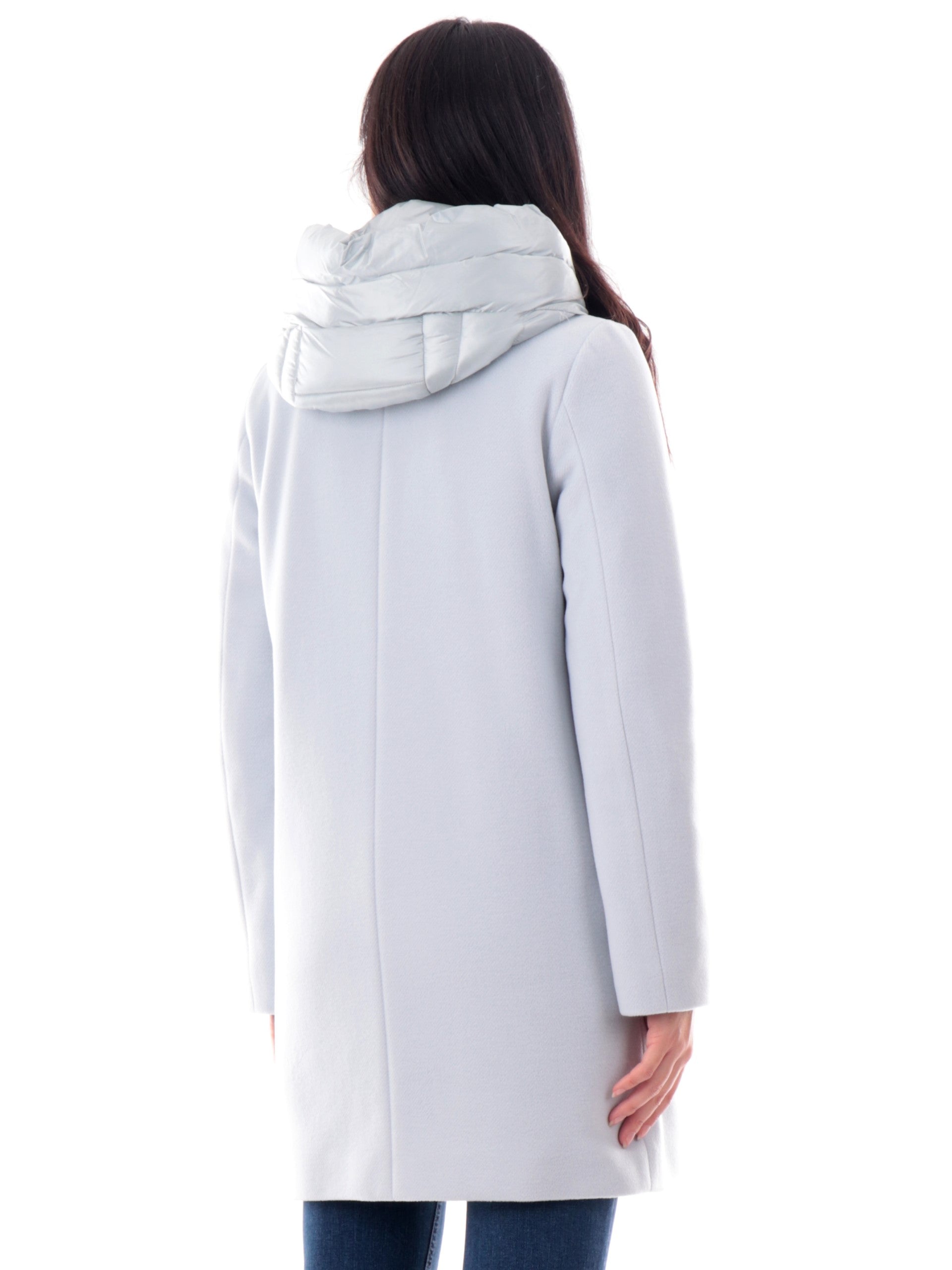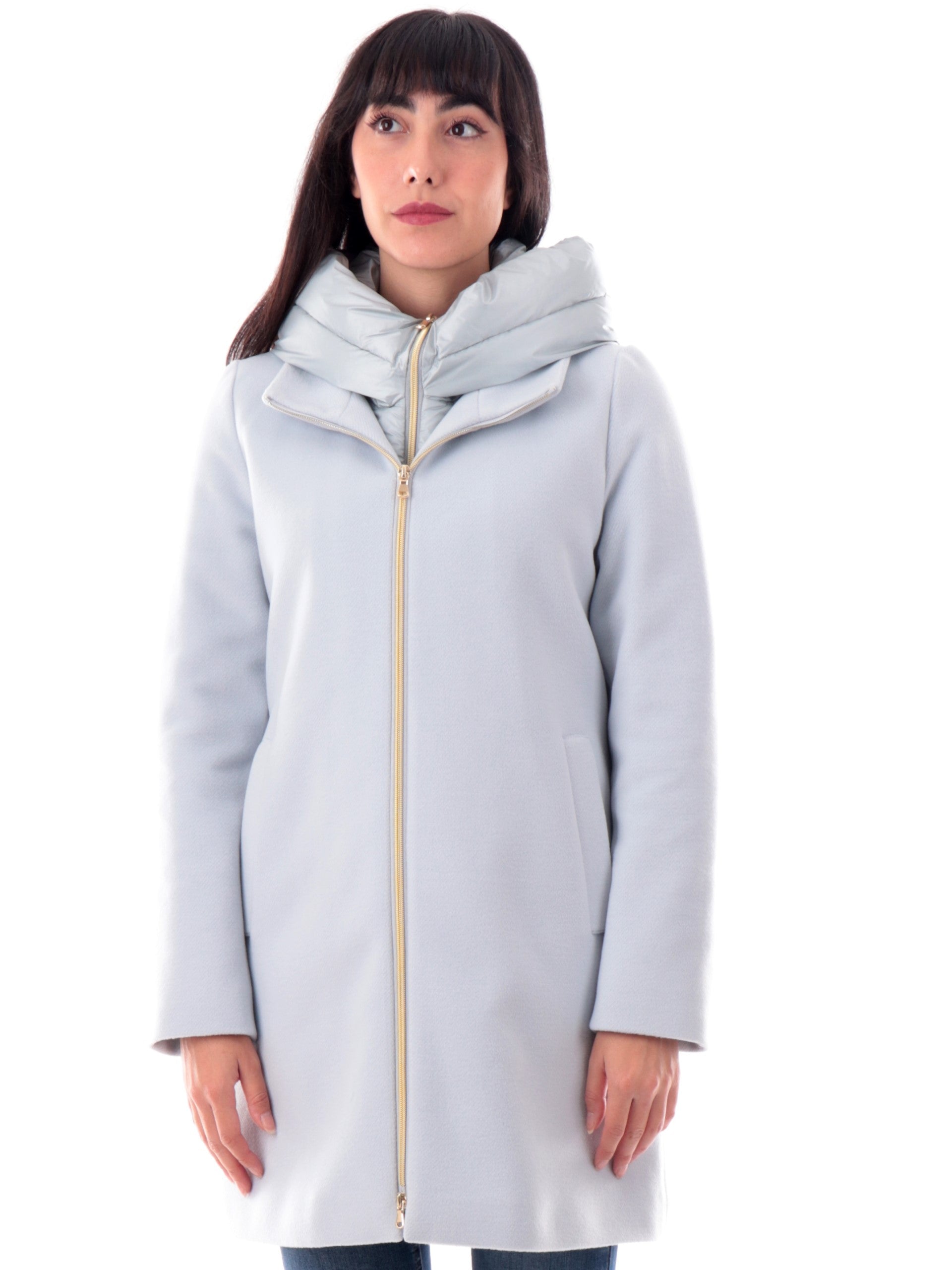 Cappotto Emme Marella celeste da donna con cappuccio e gilet interno rimovibile BACIO, realizzato con imbottitura eco-friendly. Questa giacca lunga Marella celeste ha un finto gilet interno removibile (rimuovendolo verrà tolto anche il cappuccio), la chiusura full zip centrale, due tasche laterali aperte e il fondo regolare.