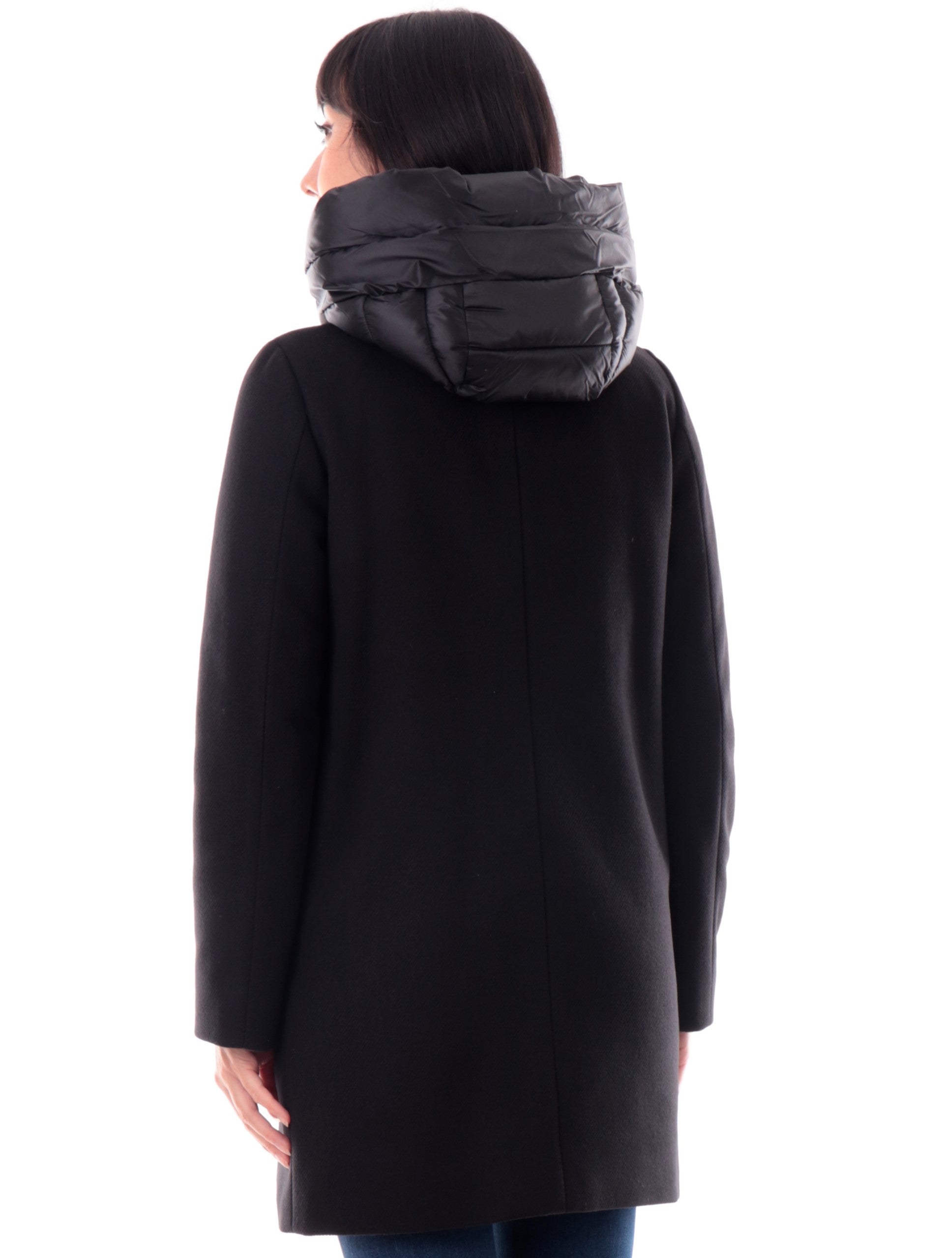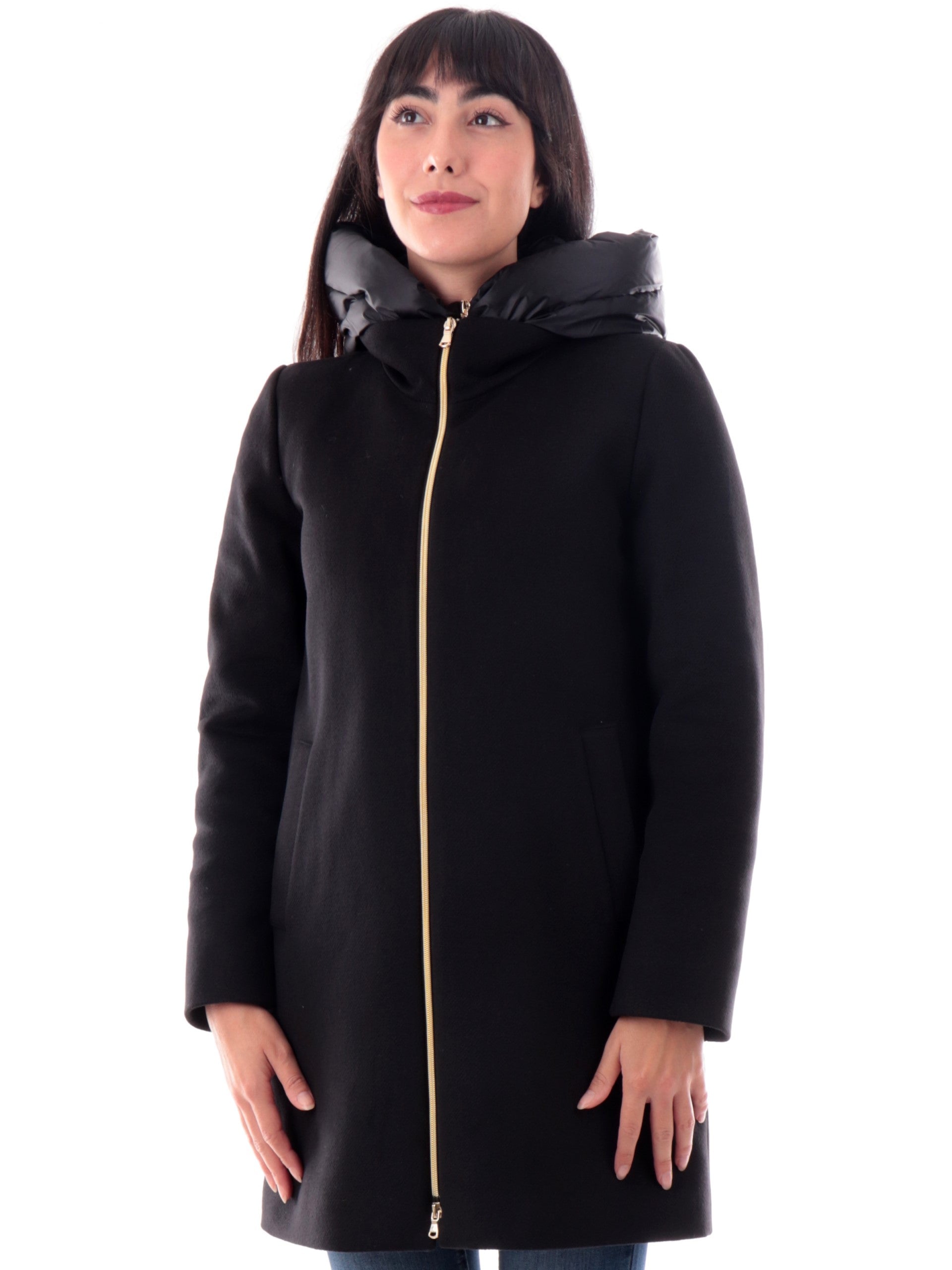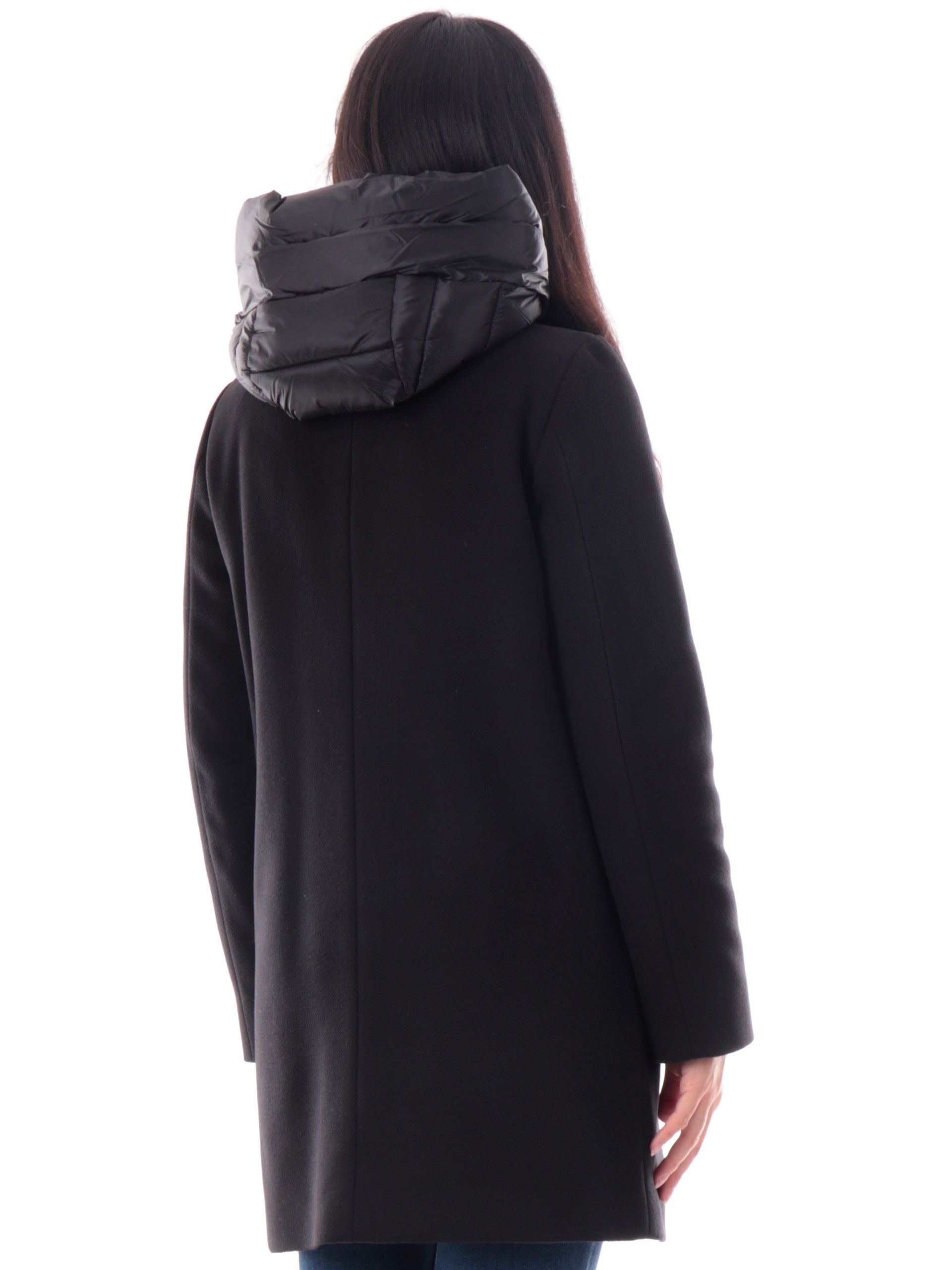 Cappotto Emme Marella nero da donna con cappuccio e gilet interno rimovibile BACIO, realizzato con imbottitura eco-friendly. Questa giacca lunga Marella nera ha un finto gilet interno removibile (rimuovendolo verrà tolto anche il cappuccio), la chiusura full zip centrale, due tasche laterali aperte e il fondo regolare.