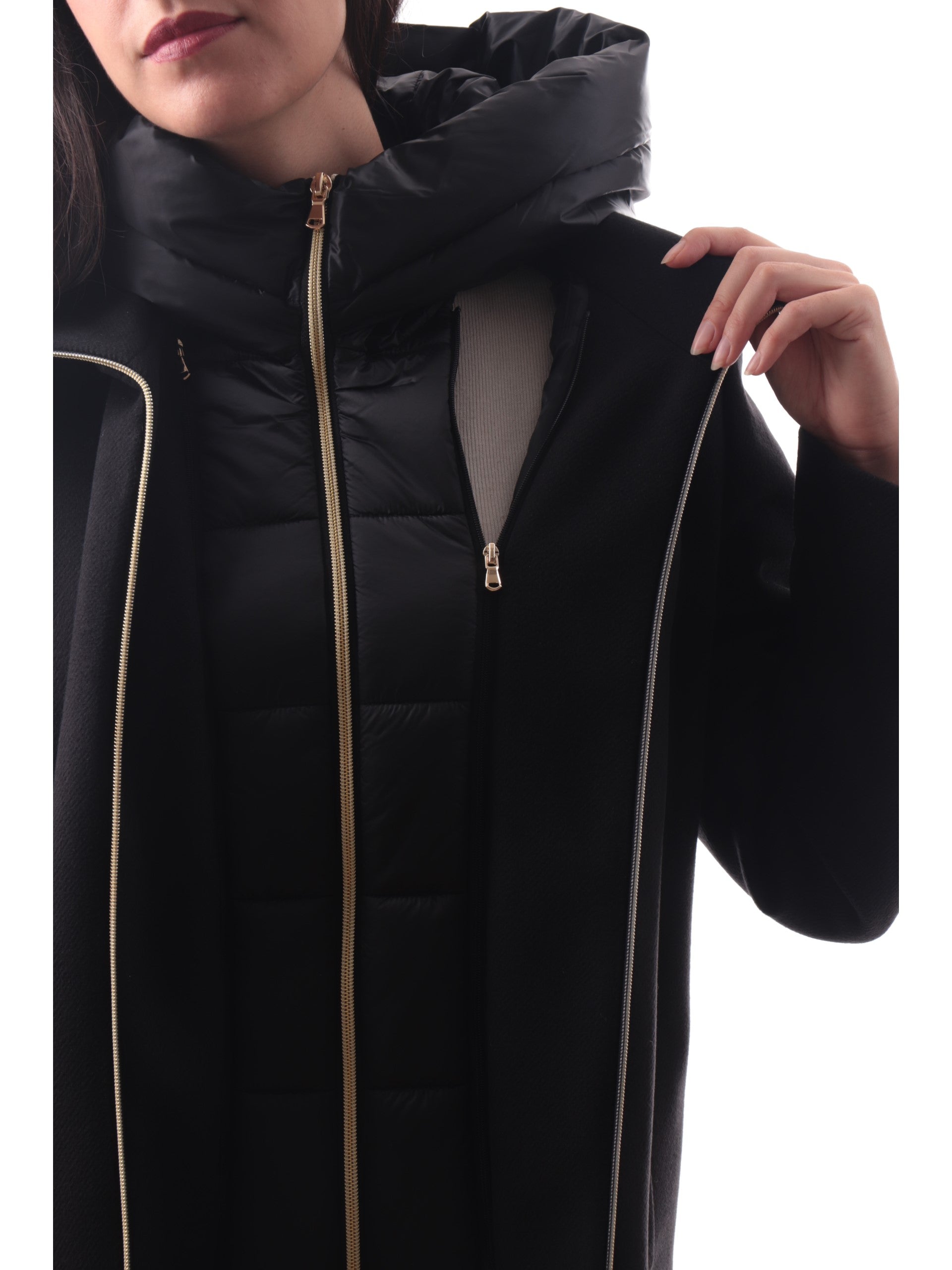 Giacca lunga Emme Marella nera da donna con cappuccio e gilet interno rimovibile BACIO