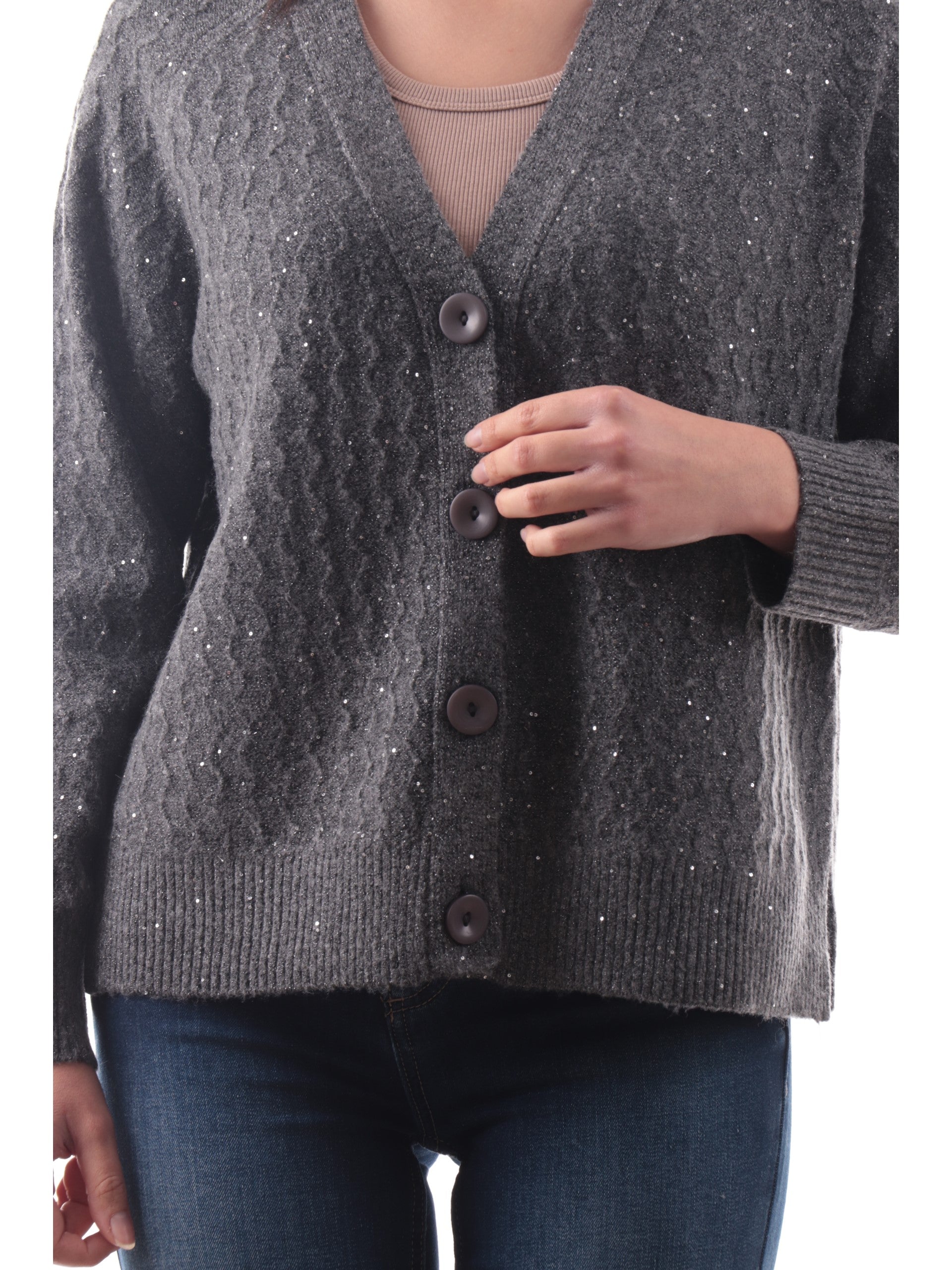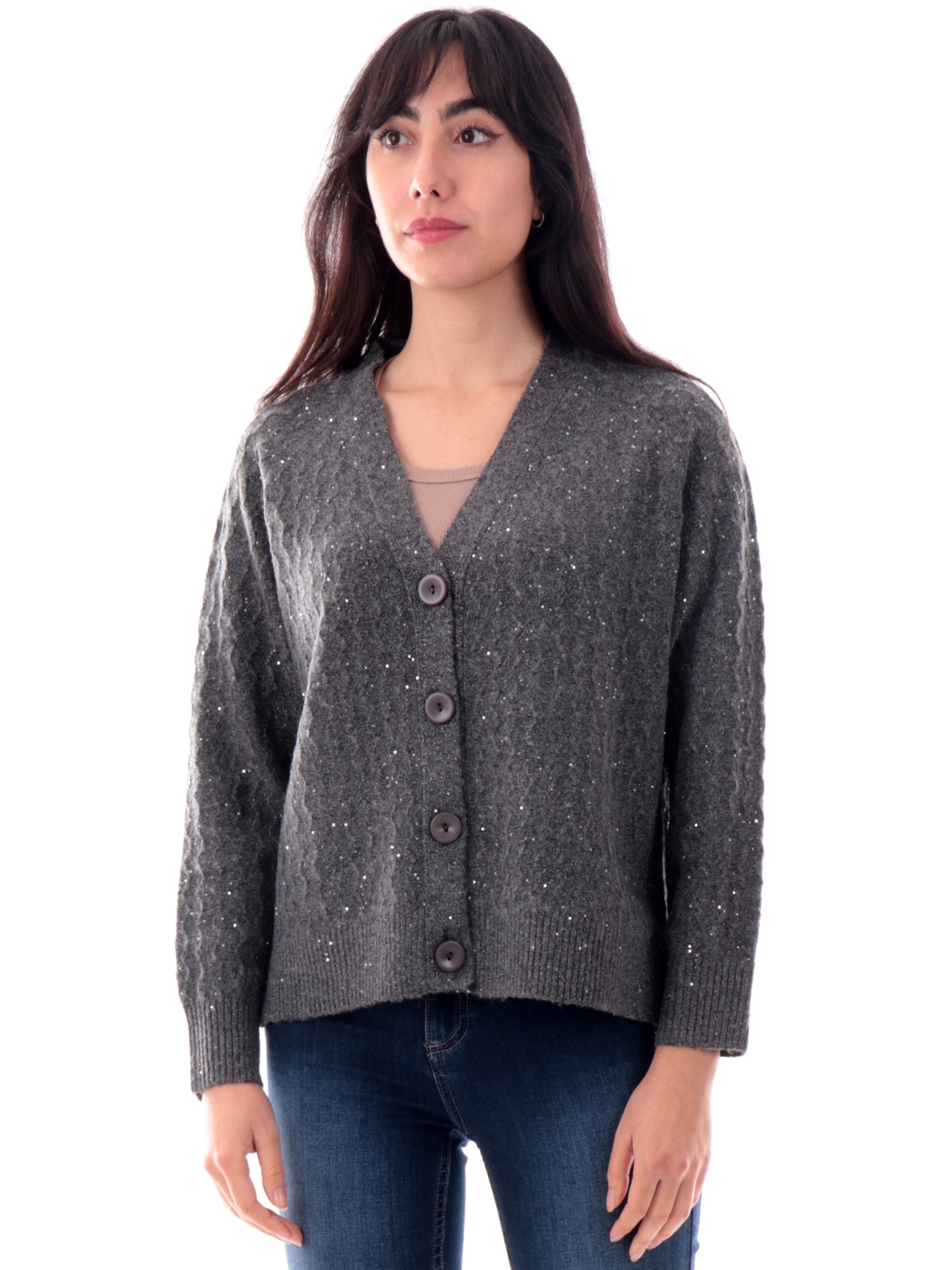 Cardigan Anis White grigio da donna con pailletes . Questo maglione Anis è caratterizzato da trama lurex e vestibilità morbida con attenzione ai tessuti morbidi e di alta qualità . Un maglione grigiodonna con bottoni elegante e dinamico, da abbinare come preferisci.