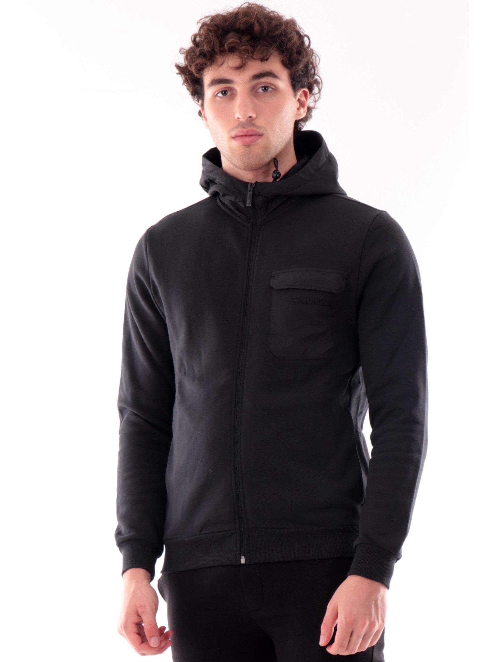 Felpa Colmar nera da uomo full zip con cappuccio inserti tecnico 62816ZJ, realizzata in 100% cotone. Questa felpa Colmar nera ha il cappuccio fisso regolabile con coulisse, la chiusura full zip centrale, due tasche laterali aperte, un taschino in tessuto tecnico lato cuore e logo Colmar gommato.