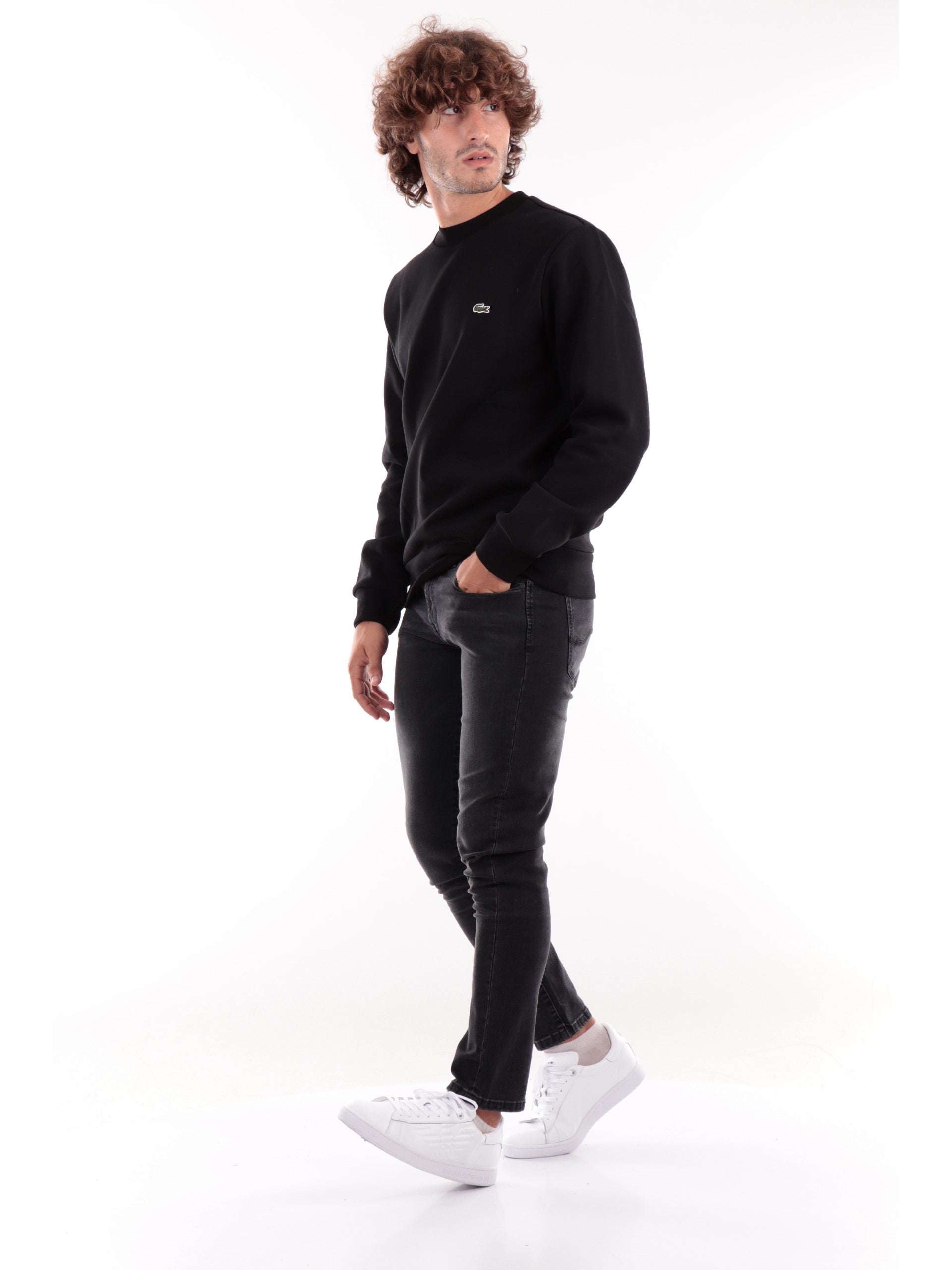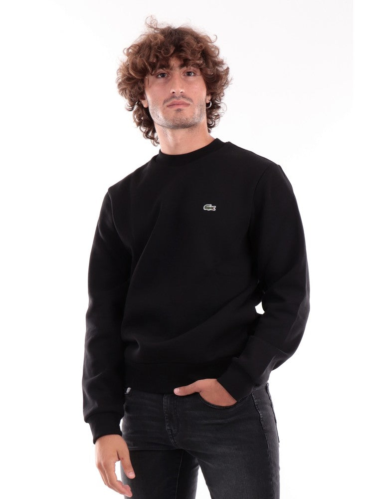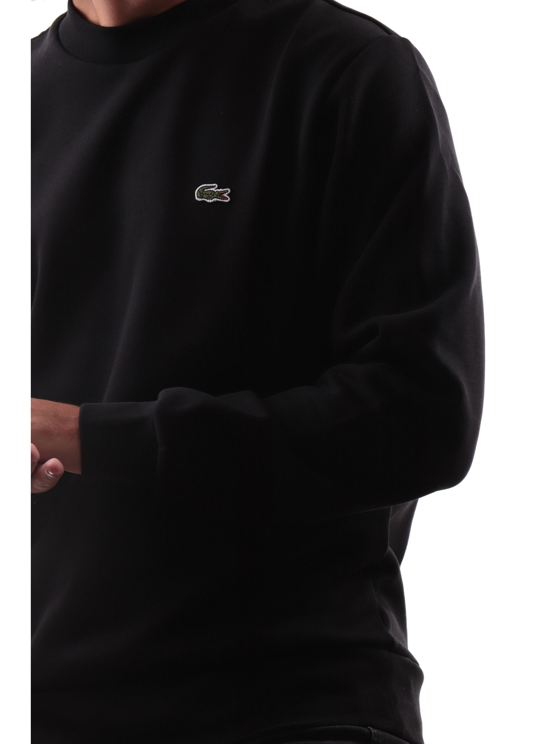 Felpa Lacoste nera da uomo SH9608. Questa felpa Lacoste nera girocollo ha le maniche lunghe, l'iconico coccodrillo ricamato sul davanti lato sinistro e polsini e fondo elasticizzati a costine. Felpa a tinta unita.